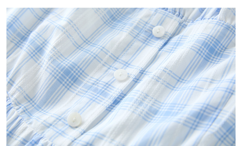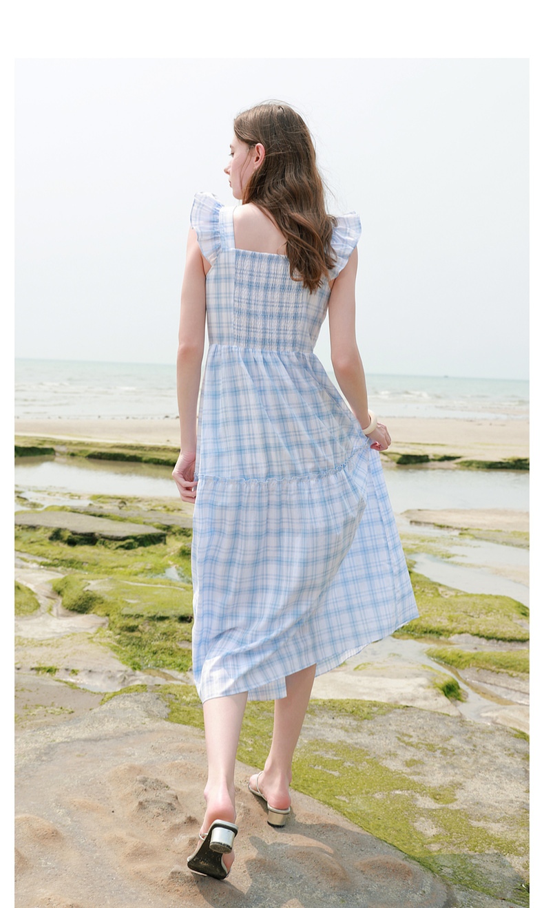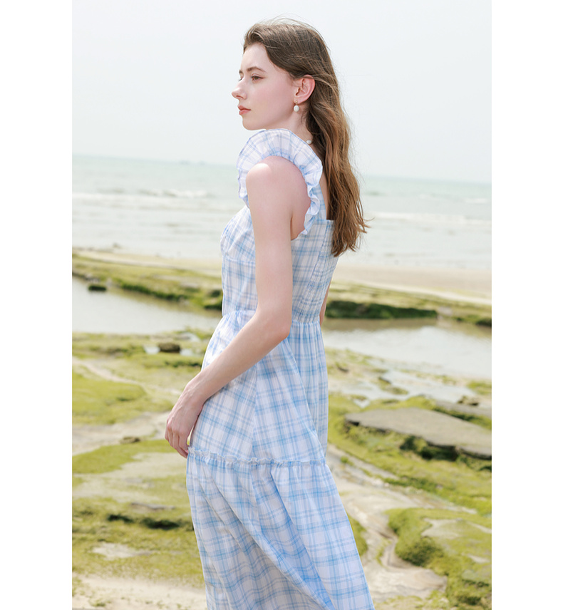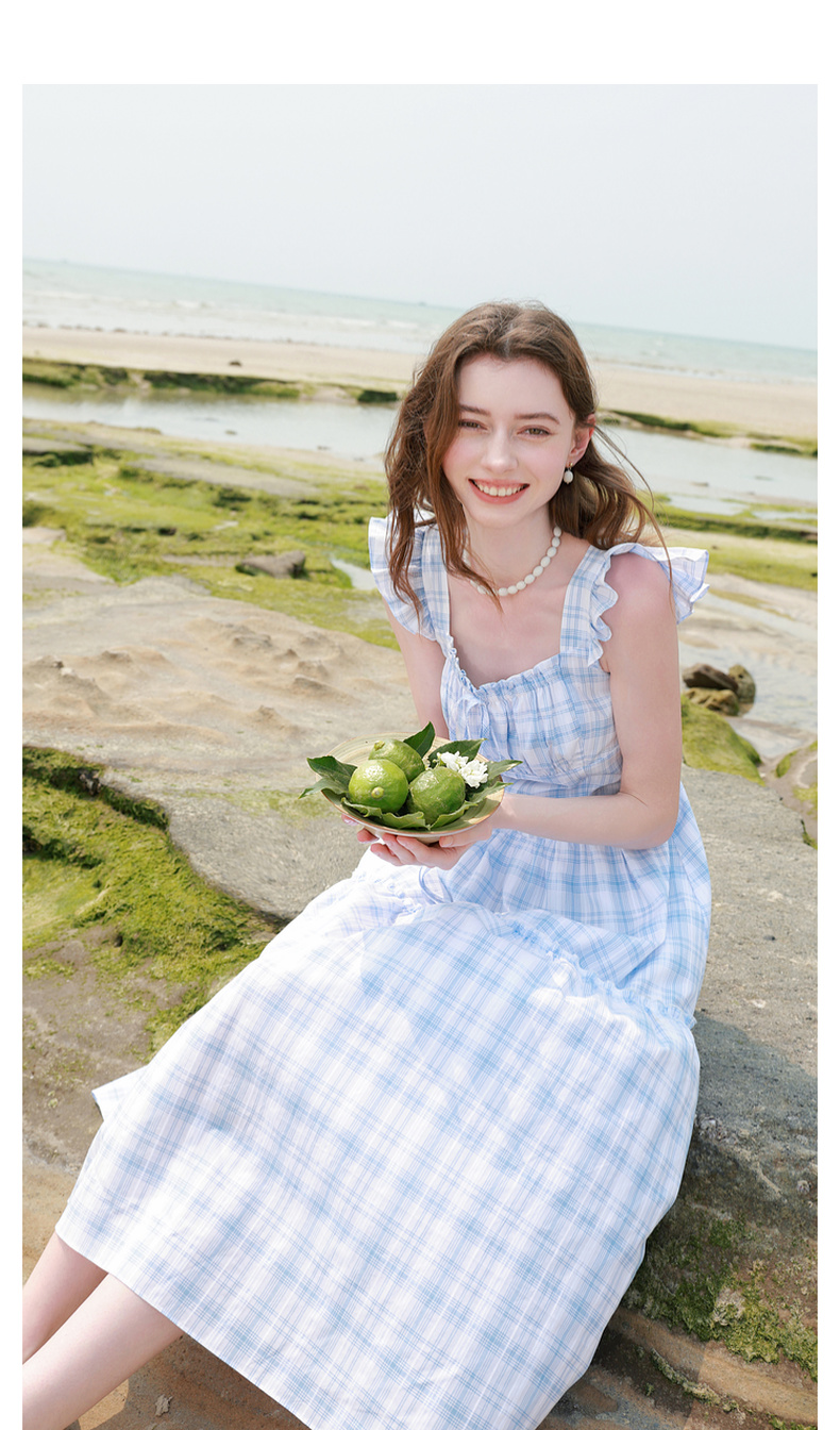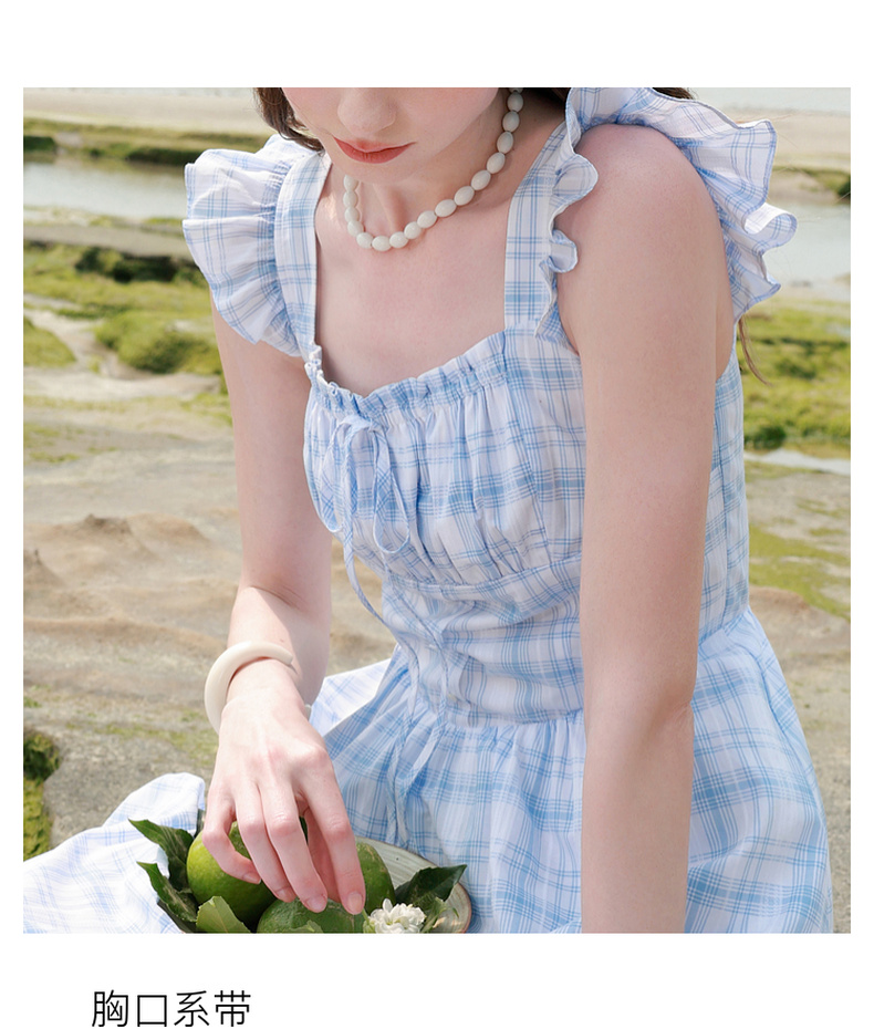 三彩2025夏季新款格纹连衣裙方领系带收腰A字裙长裙清新M