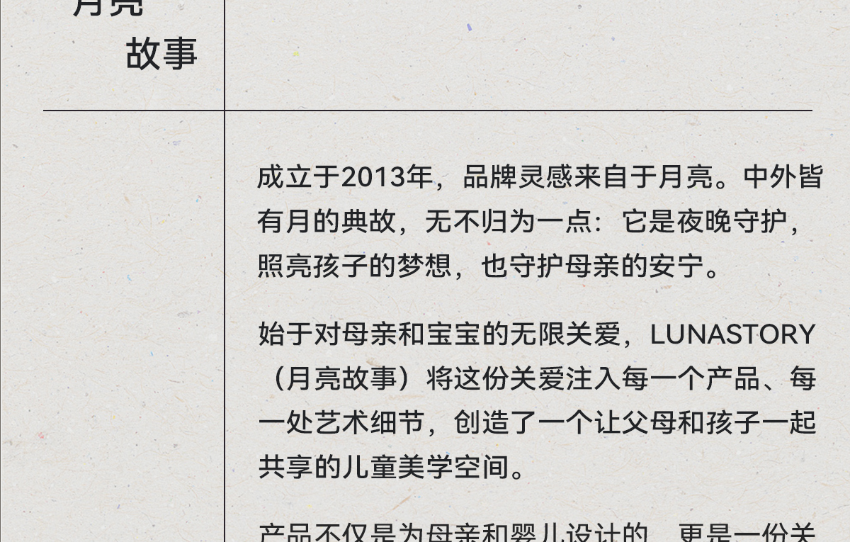 - Lunastory是2017年全新推出的母婴用品高端品牌,致力于维护孩子的安全与健康。以父母之心,开发多种母婴用品,目标是让客户只用Lunastory就能打造出温馨的儿童房。