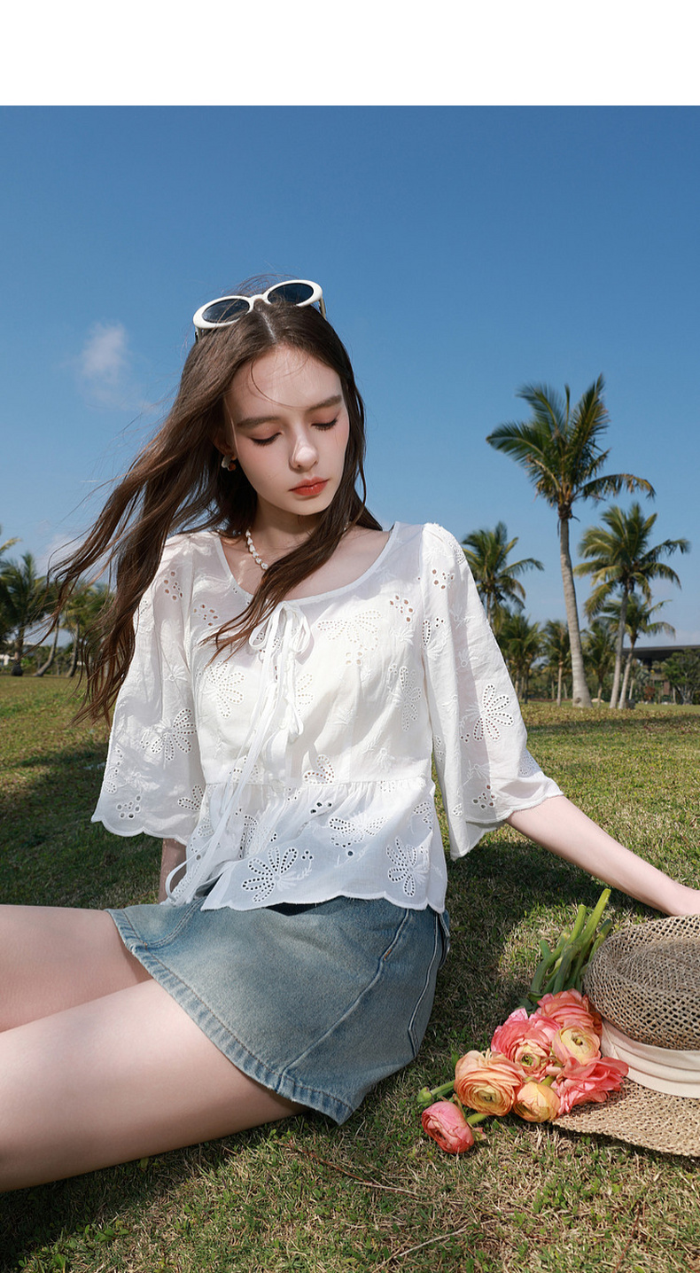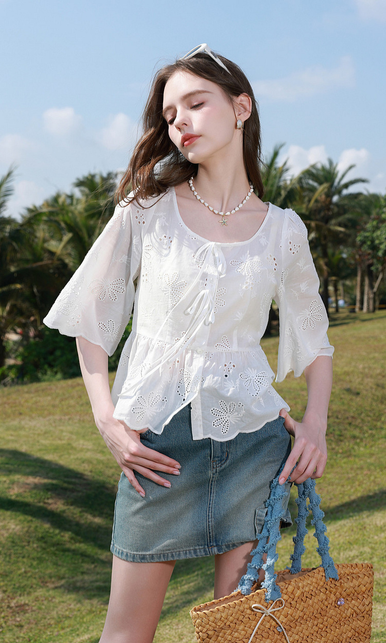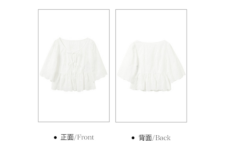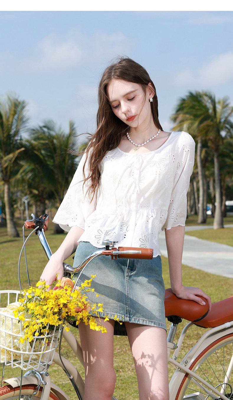 【100棉】三彩2026夏季新款方领绣花A字娃娃衫七分袖衬衫上衣M