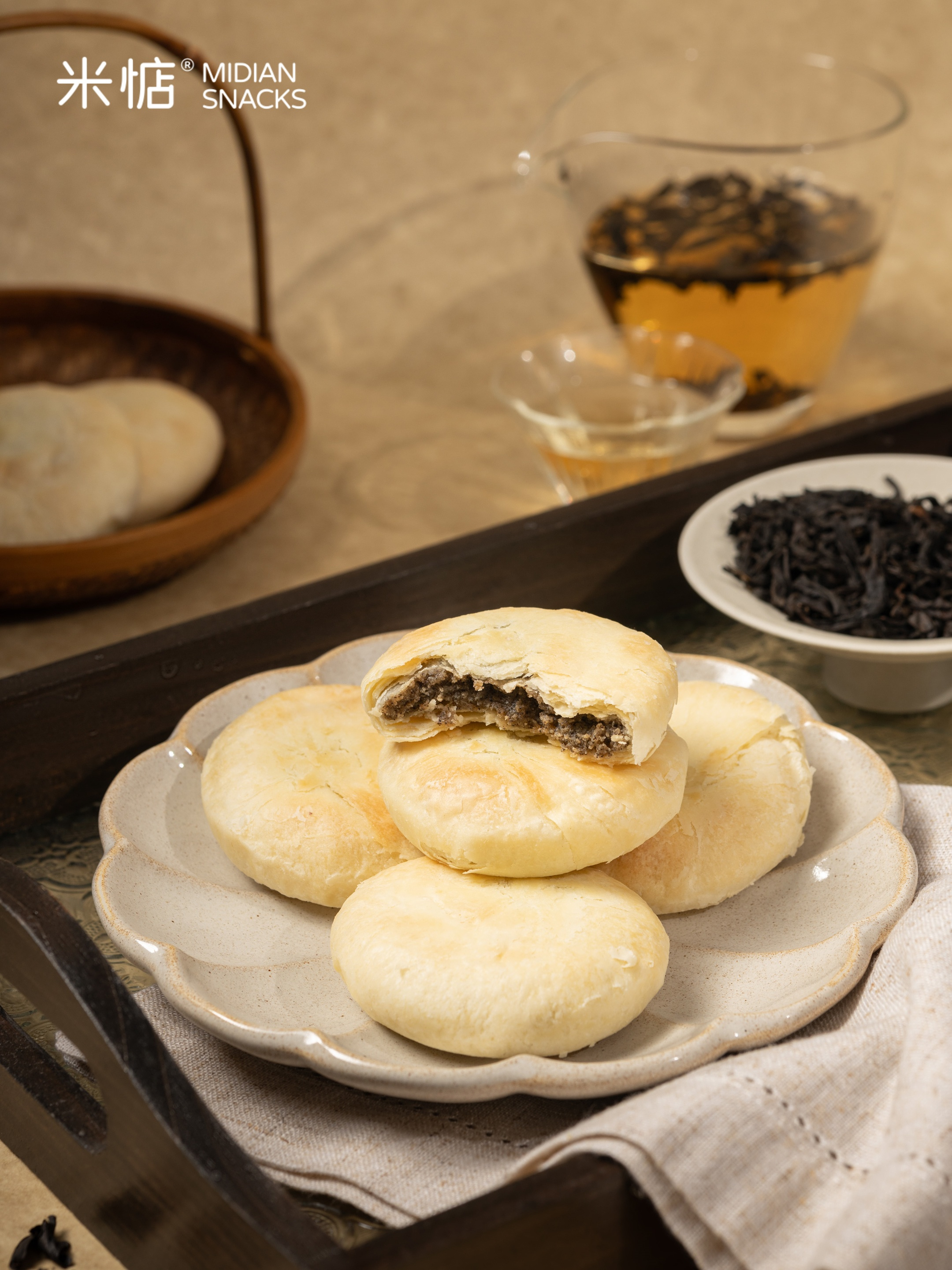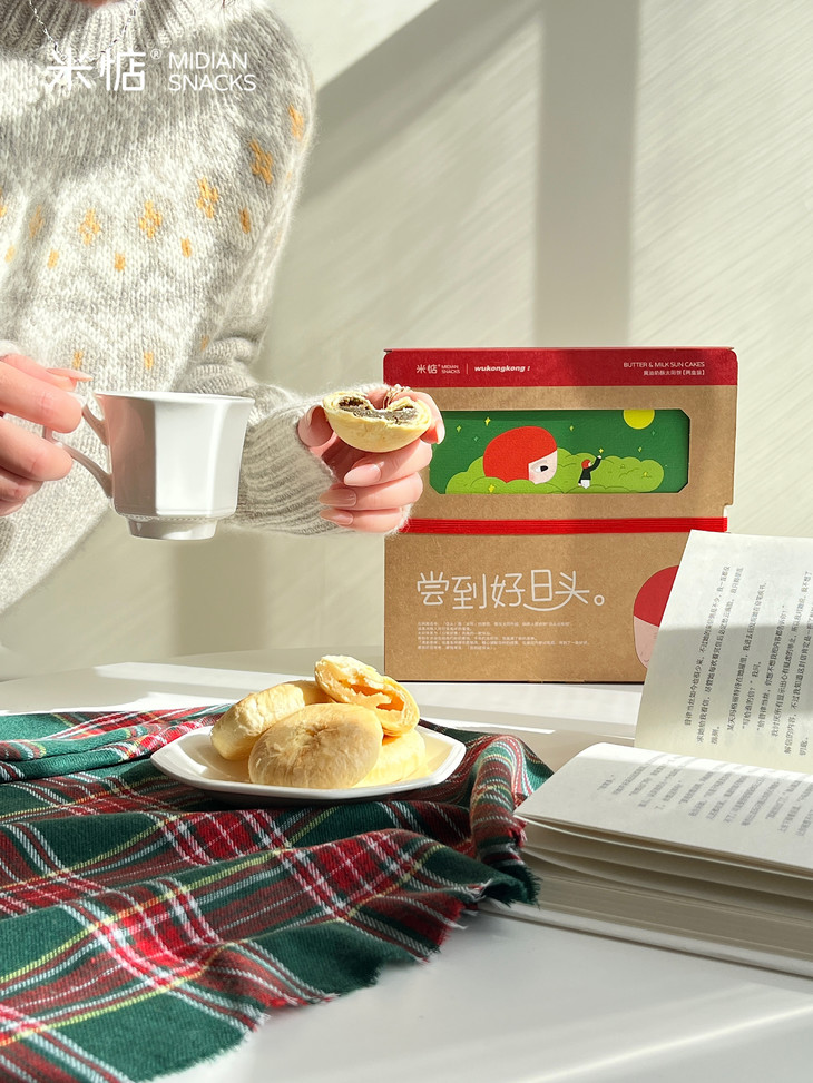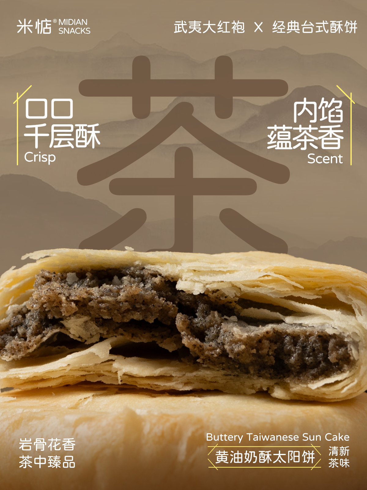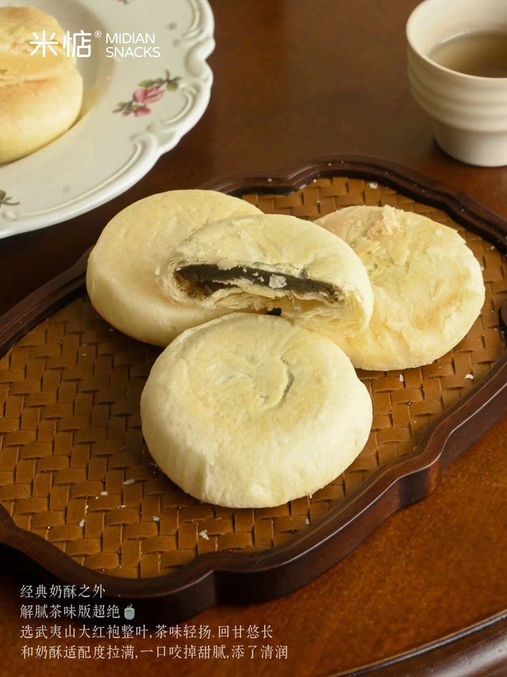 甄选闽北武夷核心产区的岩茶大红袍 岩骨花香,也被誉为「茶中臻品」 那里的三坑两涧,风化岩壤滋养 湿润多雾的气候让茶叶自带矿物质的岩韵 富含茶多酚、茶氨酸,能够帮助对抗自由基 以其茶汤制馅入饼,入口酥香层层化开 茶韵随之缓缓释放时,清冽又浓郁 入腹的清新沁甜,黄油与奶香也会随之开阔 希望这块太阳饼,能让你尝到一盏好茶的悠长回甘