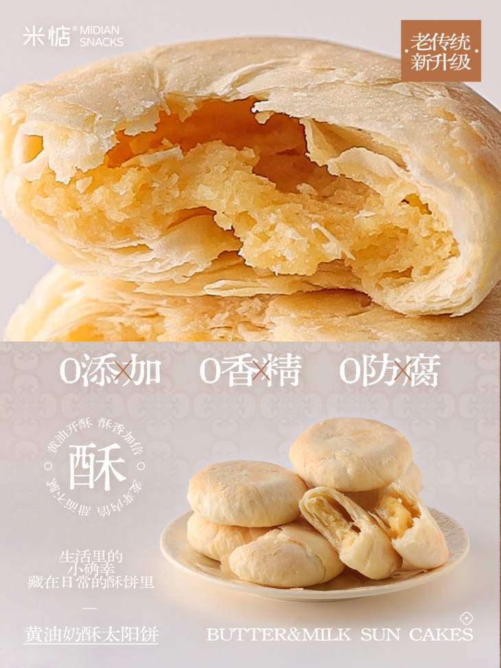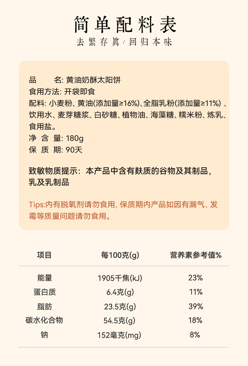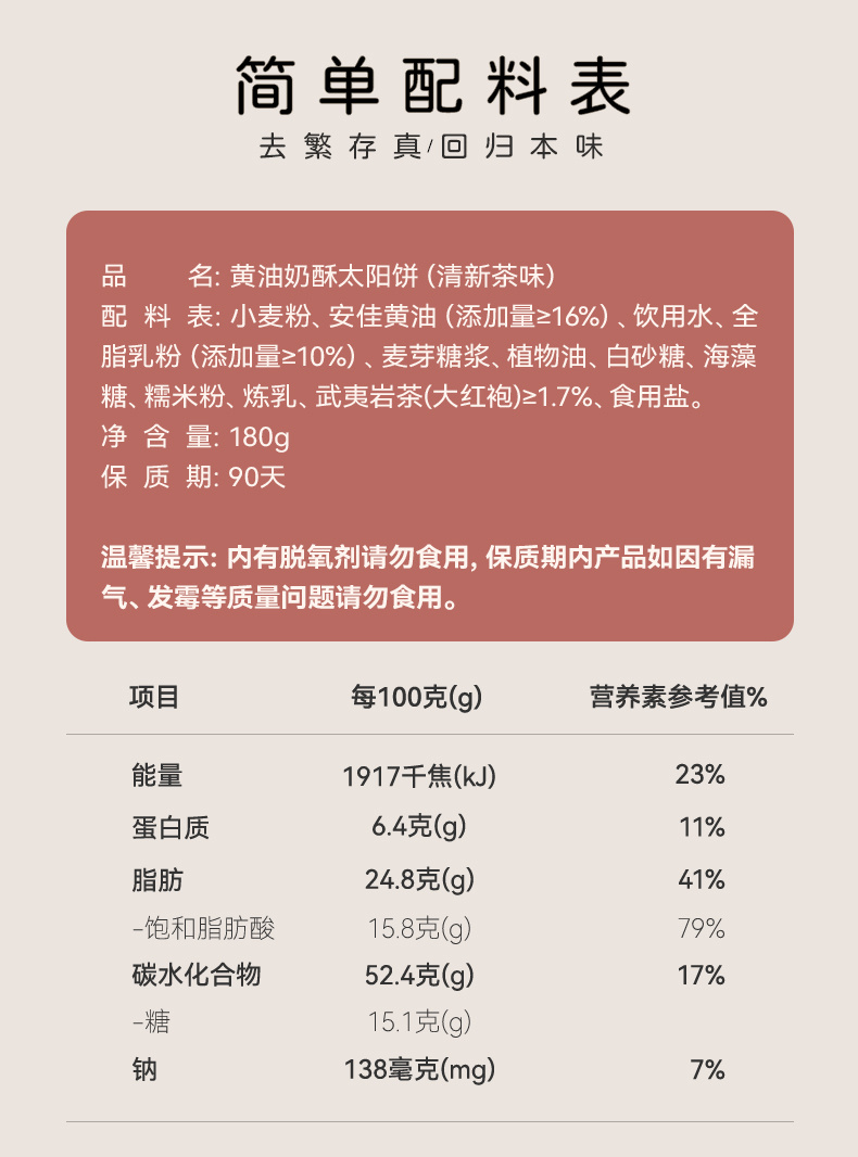 🧡看得见的干净配料 好吃无负担 我们以百分的真心❤️ 做出满分的黄油奶酥太阳饼 是经典黄油的温润麦芽奶香🥛 也是岩茶沁入的清幽茶香🍵 简单的成分,还原最真实的味道 不添加香精、色素、防腐剂🙅 每一口,都是食材本真的模样