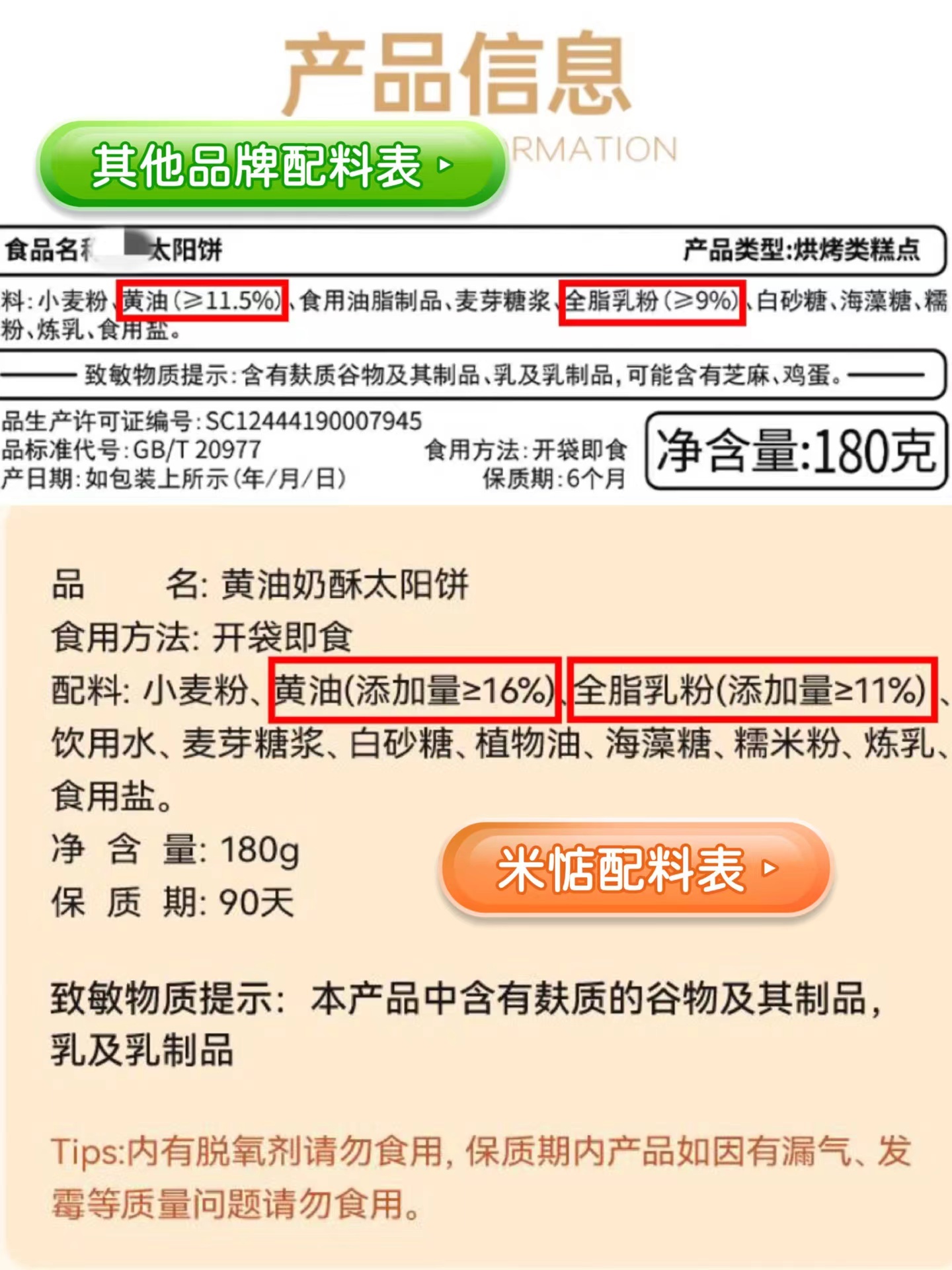 温馨提示:由于产品层层酥皮的特点,运输途中可能会有轻微磕碰,产生少量酥皮脱落,属于正常现象哦,不会影响原有口感,介意慎拍 【品名】:米惦黄油奶酥太阳饼 【产品规格】:180g 【保质期】:90天 【配料表】:黄油奶酥太阳饼:小麦粉、黄油(添加量≥16%)、全脂乳粉(添加量≥11%) 、饮用水、麦芽糖浆、白砂糖、植物油、海藻糖、糯米粉、炼乳、食用盐 黄油奶酥太阳饼(清新茶味):小麦粉、安佳黄油(添加量≥16%)、饮用水、全脂乳粉(添加量≥10%)、麦芽糖浆、植物油、白砂糖、海藻糖、糯米粉、炼乳、武夷岩茶(大红袍)≥1.7%、食用盐。 【致敏物提醒】:本产品中含有麸质的谷物及其制品,乳及乳制品 【储存方式】:存放于阴凉干燥处,避免阳光直射 【发货地】:福建漳州 【发货时效】:72小时内发出,中午12点前给订单 【发货快递】:中通、申通随机发不指定 【补运费地区】:北京,上海➕一元,甘肃、内蒙古、宁夏运费两件内➕14元,青海、新疆、西藏运费两件内➕16元。 【售后说明】: 1、食品无质量问题不支持 7 天无理由退换。 2、产品少发、漏发,质量问题,请提供产品连同快递单(需看见单号)一起拍照24 小时内发给客服核实处理。 3、如包裹破损、挤压严重请拍照签收,签单破损签收,请在签收48小时内拍照联系客服处理。 4、产品已经发出的情况下,不建议更改地址、不退货,下单前,请仔细核对信息!货物产生物流单号,无法拦截,如需改地址、拦截须支付快递费用。 5、订单产生单号后,拦截需收费4元,改地址3元,偏远六省(新疆、西藏、内蒙古、宁夏、青海、甘肃)按实际产生运费收取。