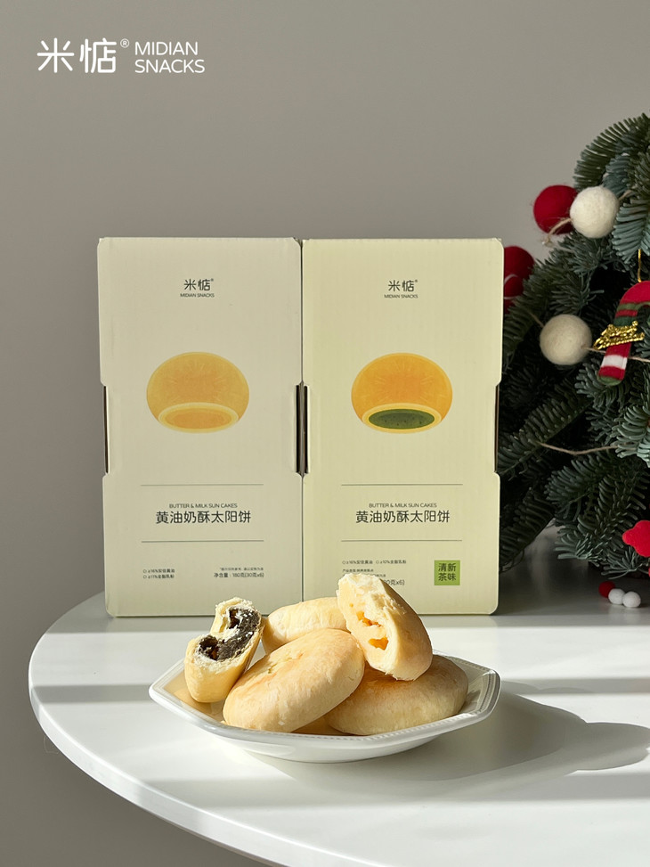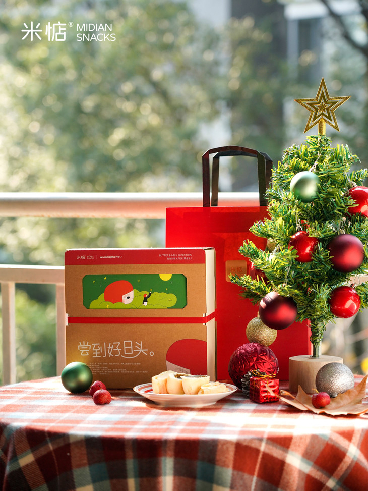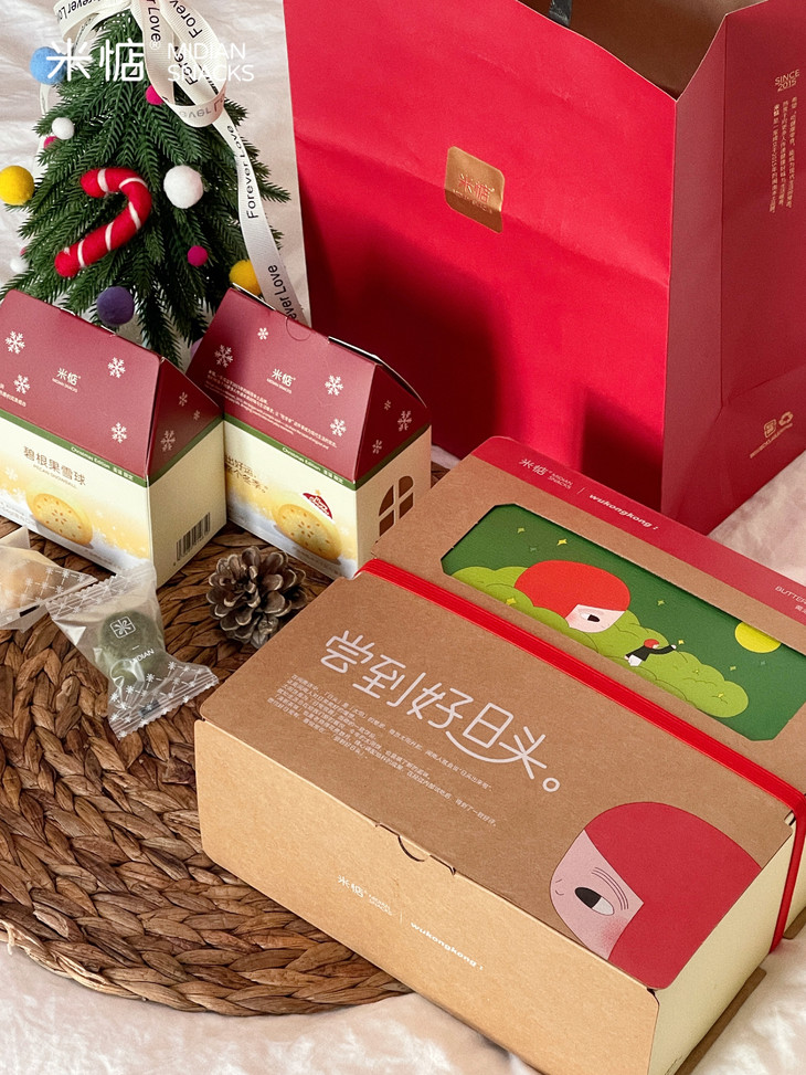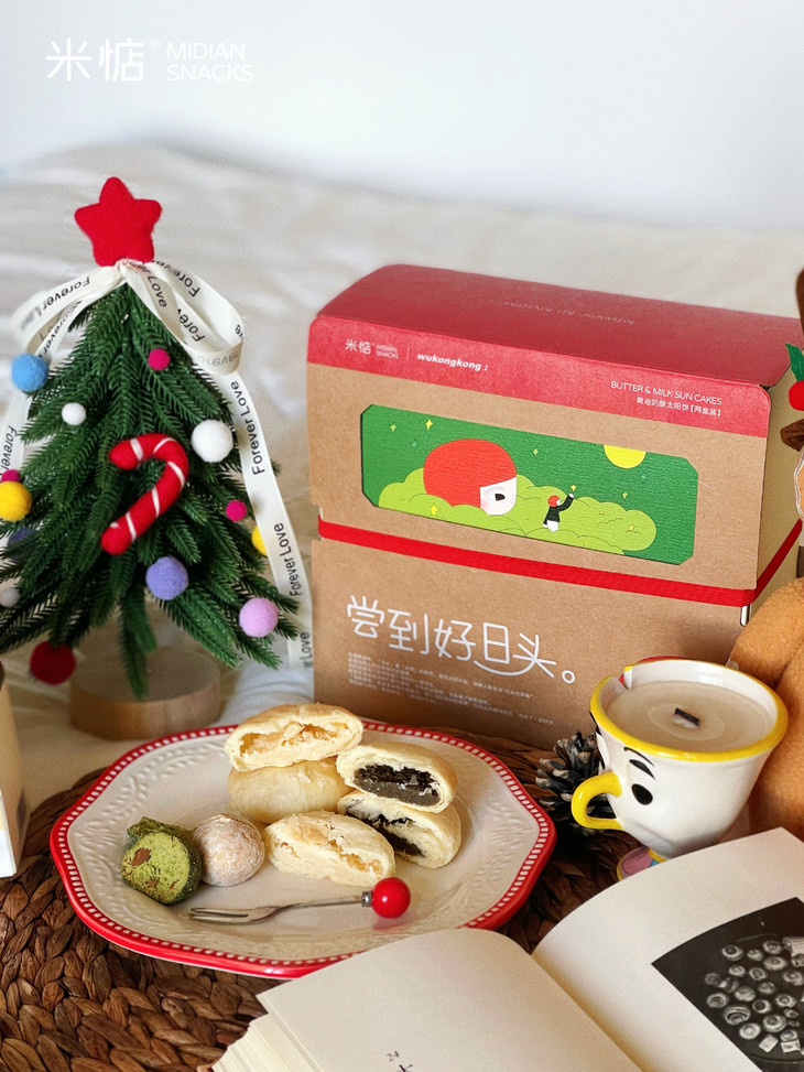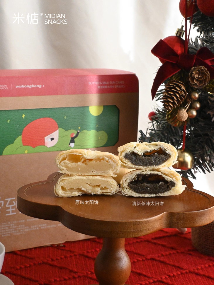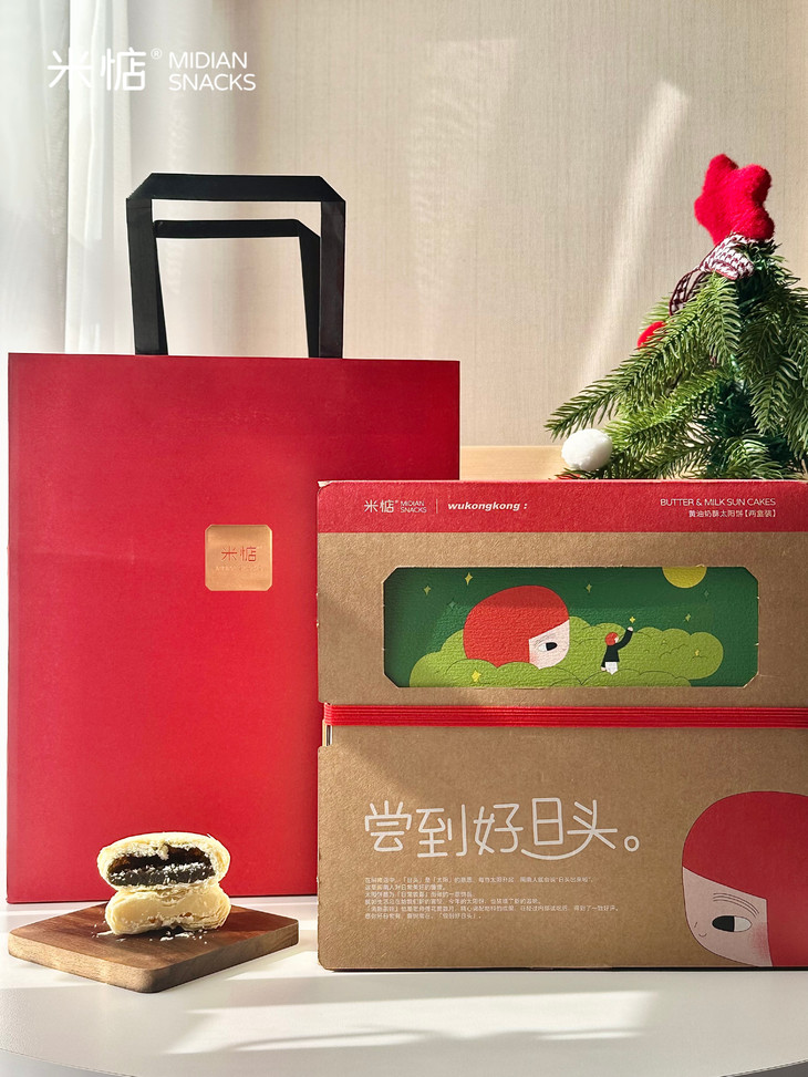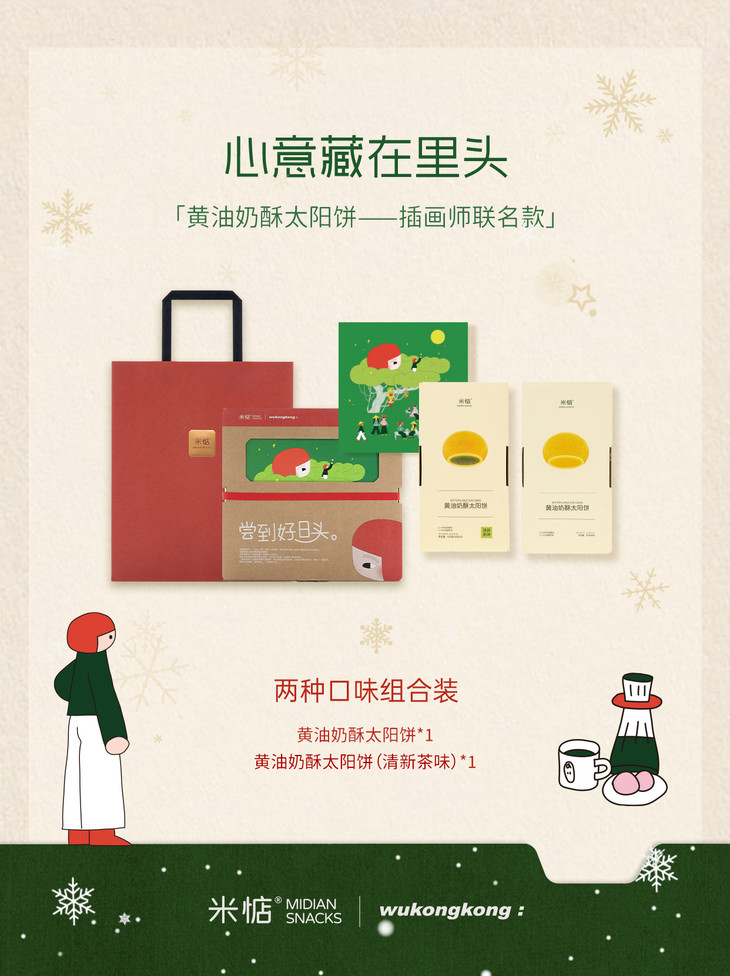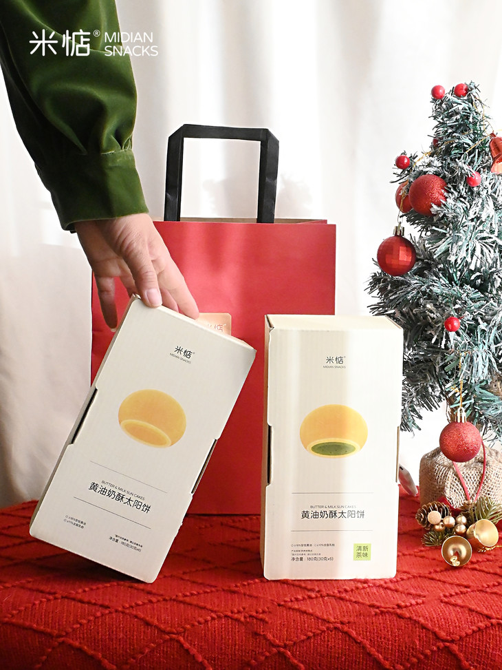 圣诞礼盒内容物包含: 黄油奶酥太阳饼(原味)180g✖️1盒 黄油奶酥太阳饼(大红袍味)180g✖️1盒 联名主题插画✖️1张 专属礼袋✖️1个 温馨提示 : 由于产品层层酥皮的特点,运输途中可能会有轻微磕碰,产生少量酥皮脱落,属于正常现象哦,不会影响原有口感,介意慎拍
