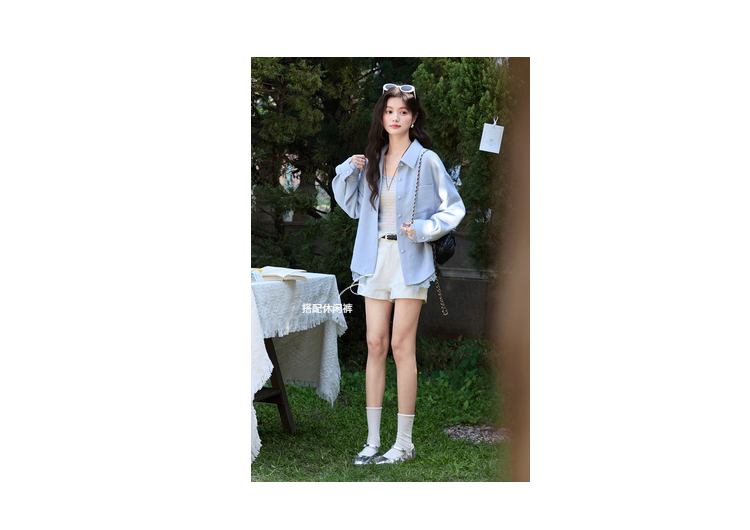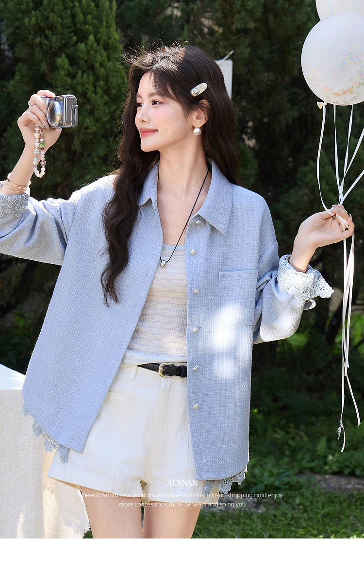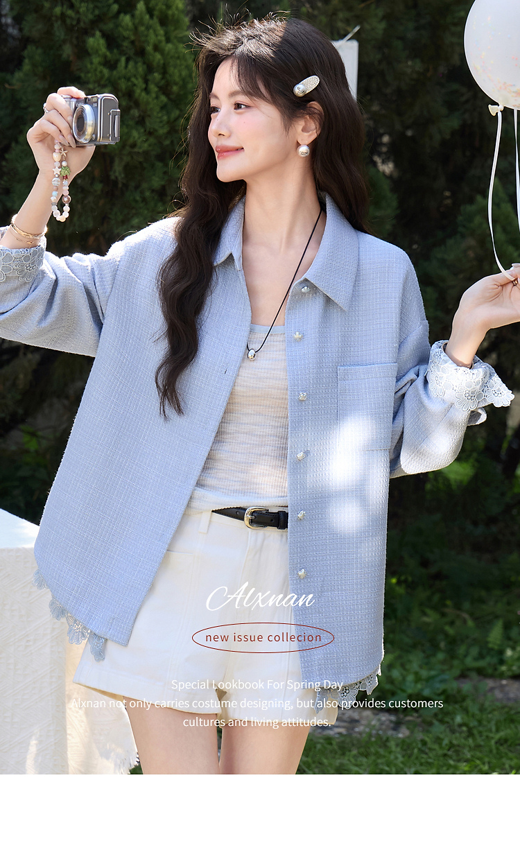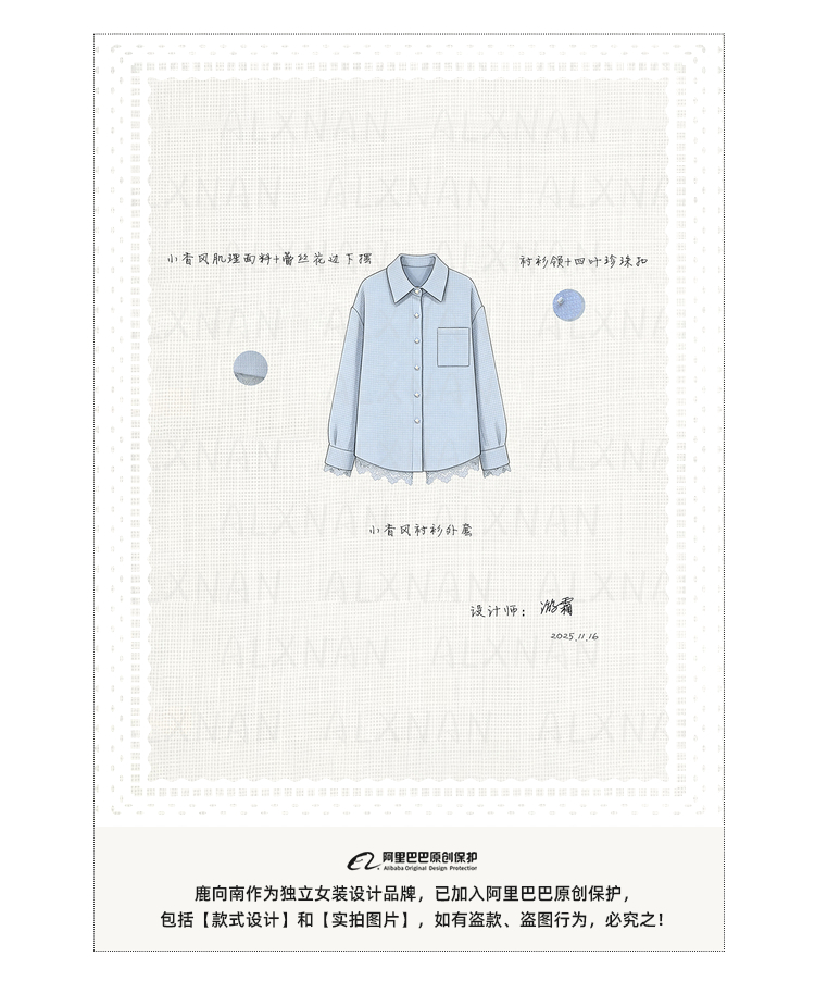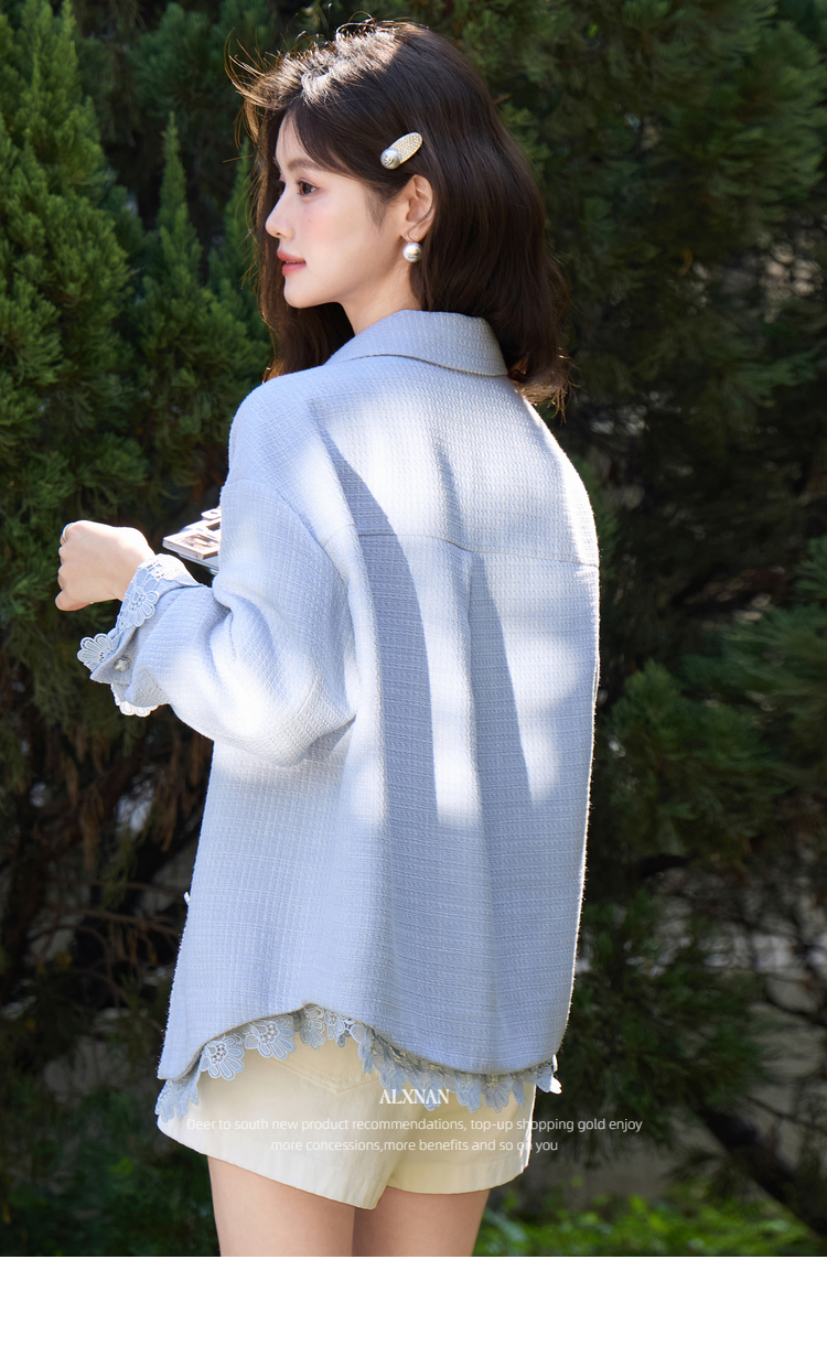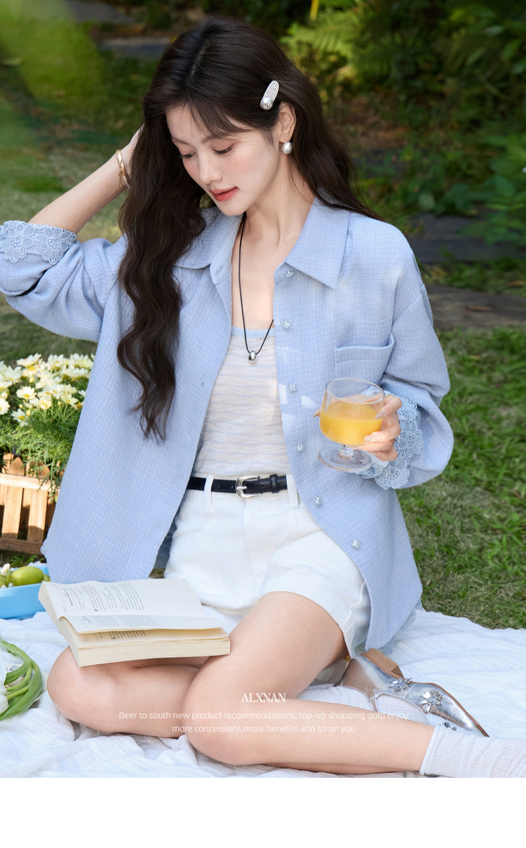 鹿向南「晴风衬蓝」设计感花边蓝色衬衫女春新款气质长恤开衫上衣