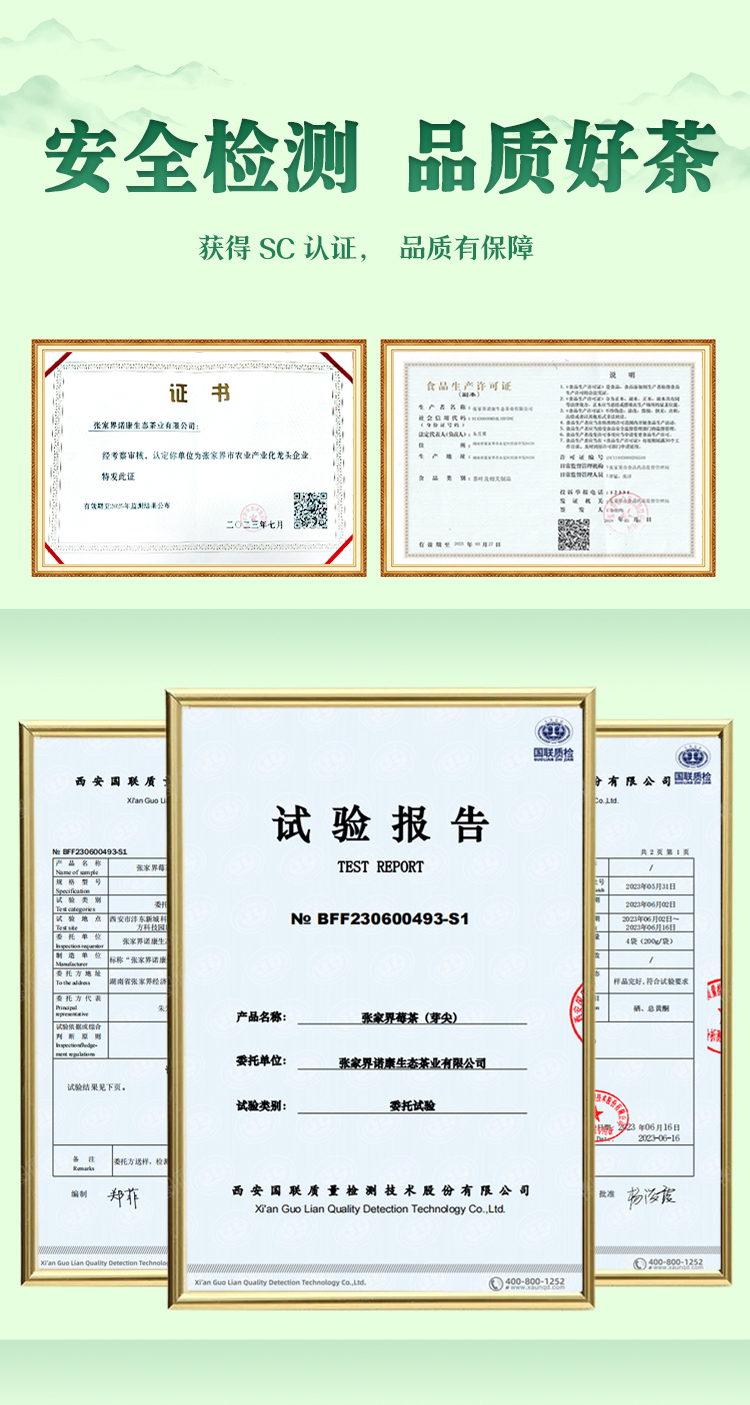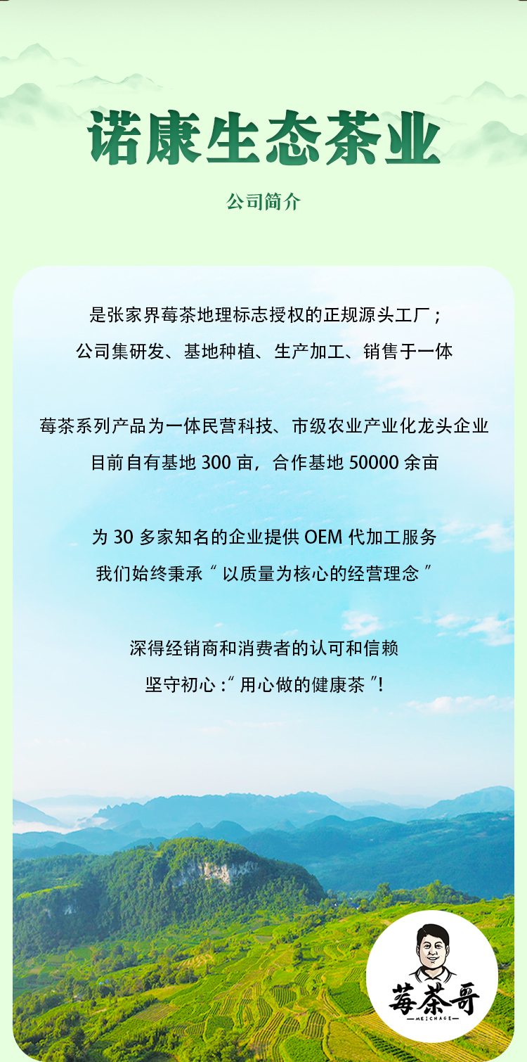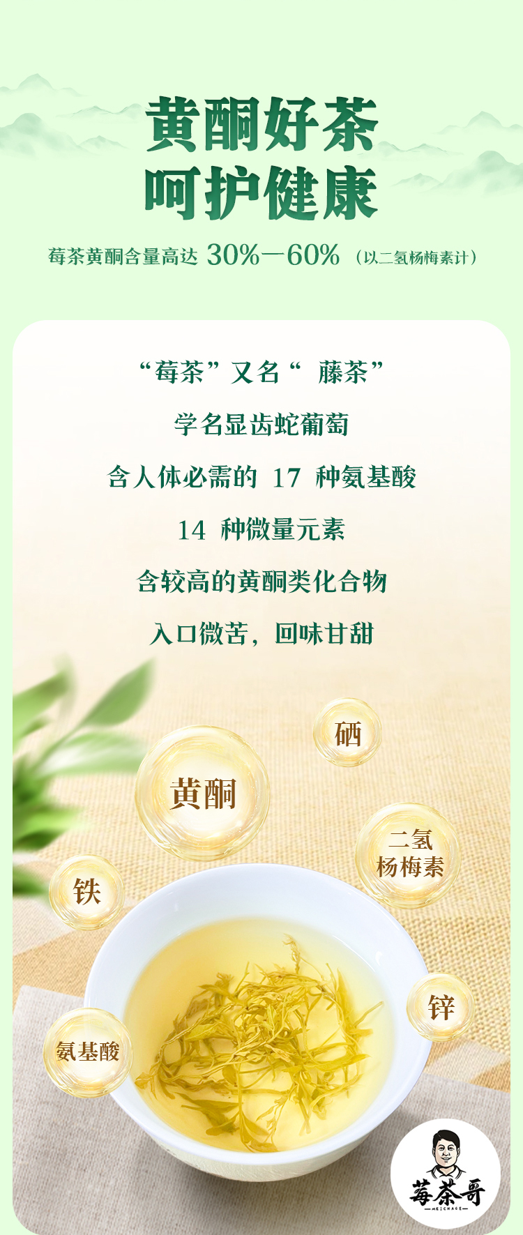 张家界莓茶,又称长寿藤,生长于武陵山脉、以张家界为核心区域生长,该植物含有天然活性成分黄酮,是所有被发现的植物中黄酮含量最高的植物,被誉为“黄酮之王”。 因其加工过程中细胞破碎,细胞中所含的黄酮活性成分渗透至表面而形成一层“白霜”,故称“莓茶“,长期饮用莓茶能够改善睡眠,降血压降血脂,调节微循环,全面增强体质和免疫力。