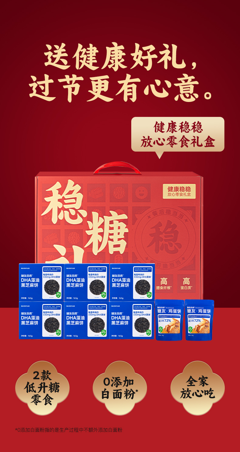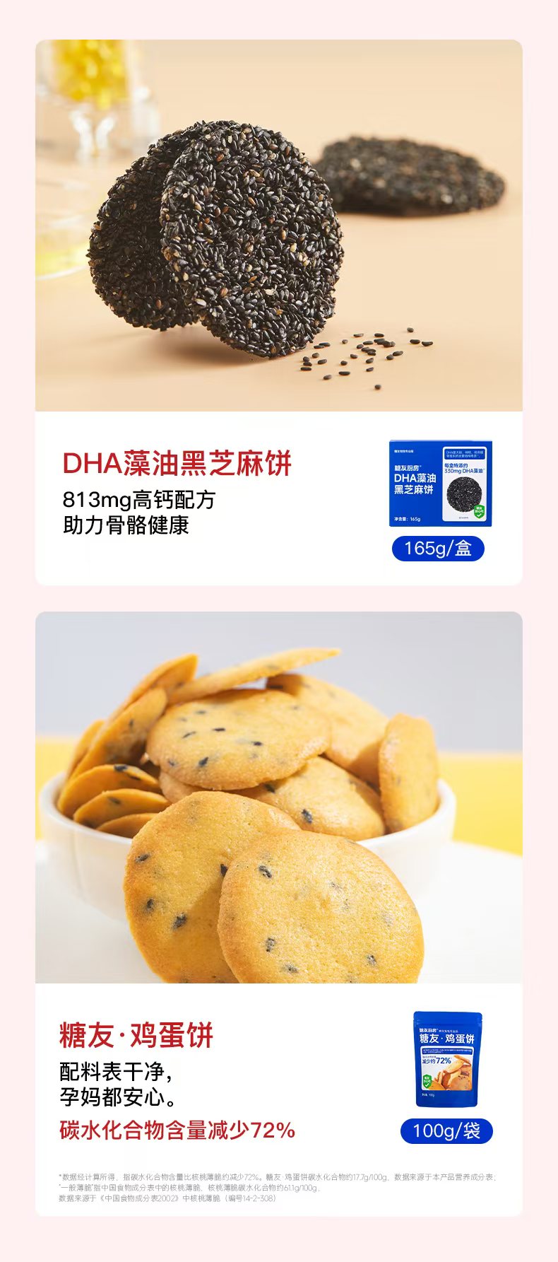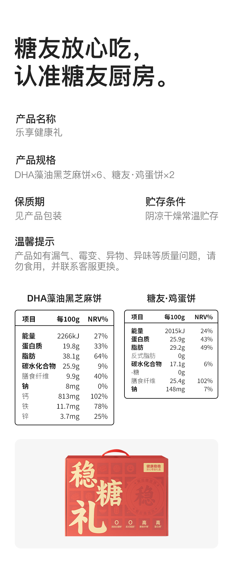 【 放心零食礼盒】糖友厨房 乐享健康礼 DHA藻油黑芝麻饼6盒(165g/盒)+鸡蛋饼2袋(100g/袋) 配料干净
