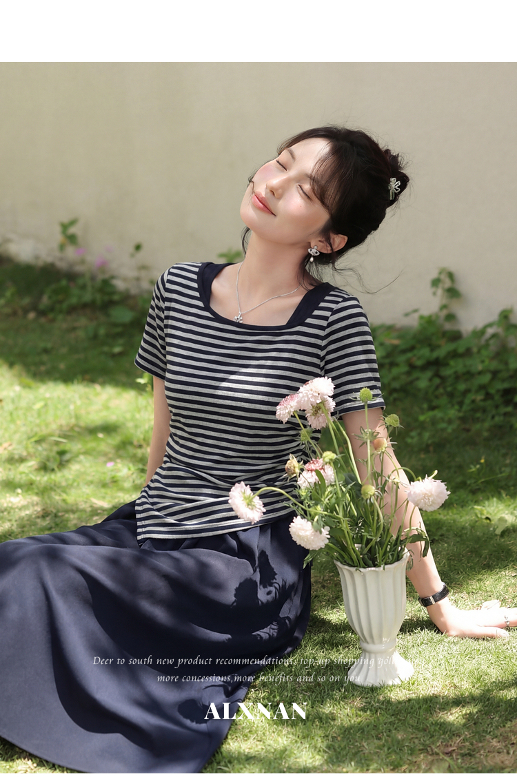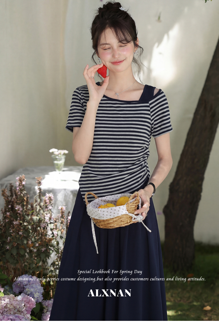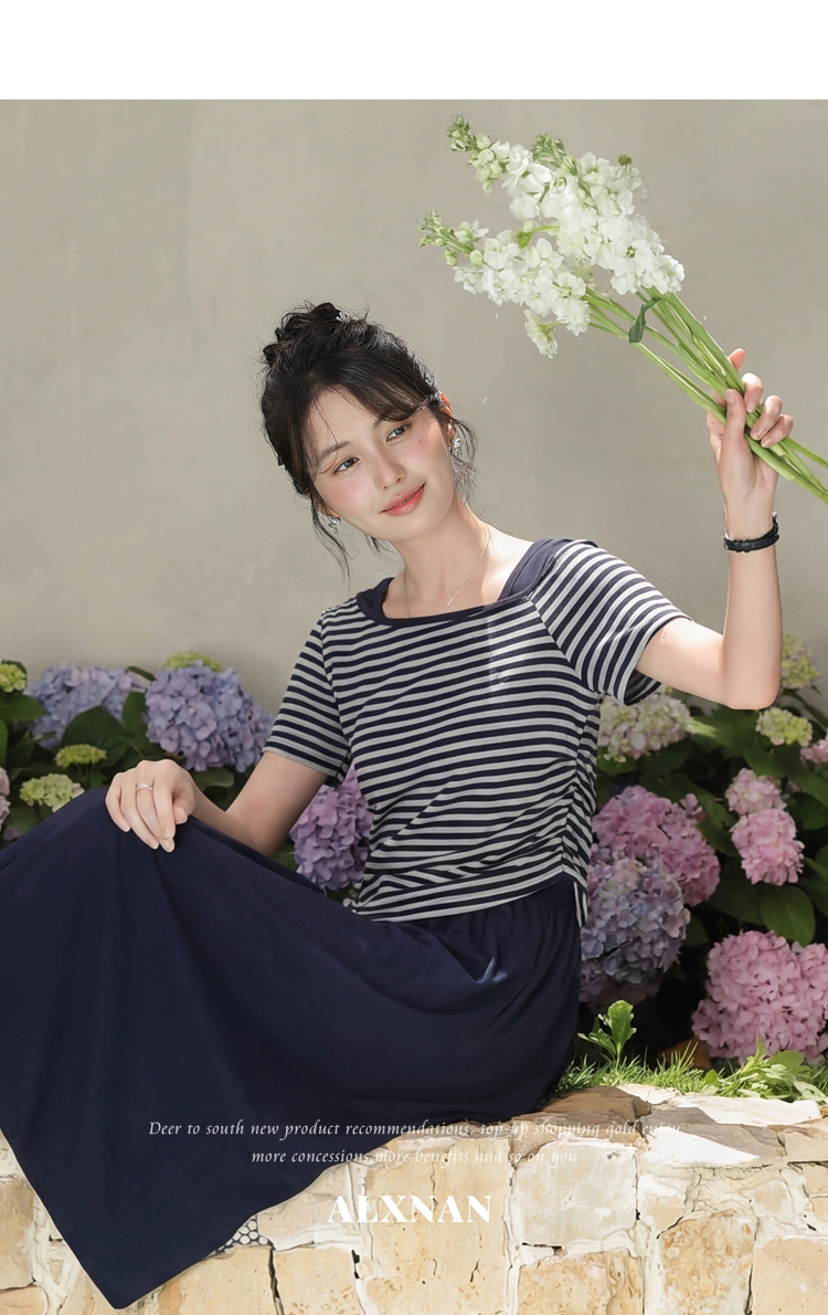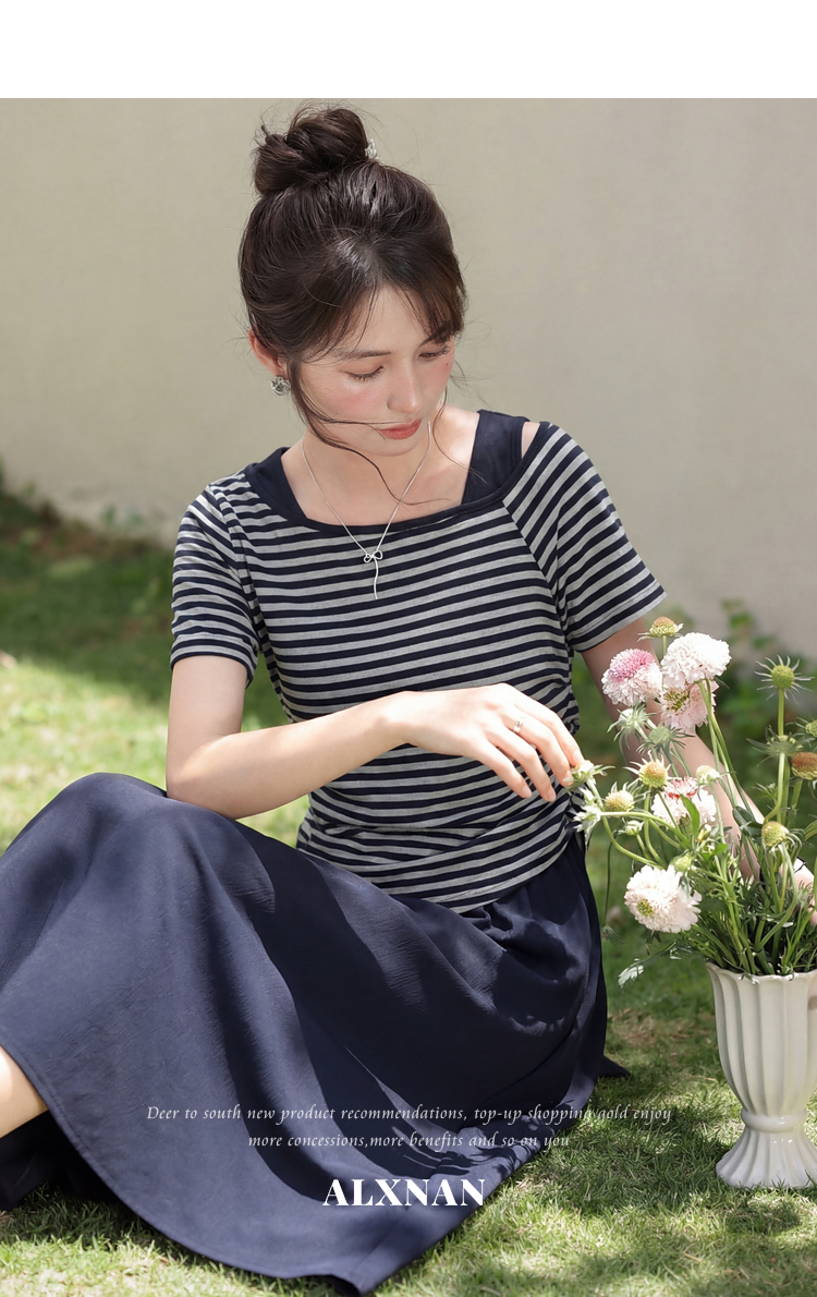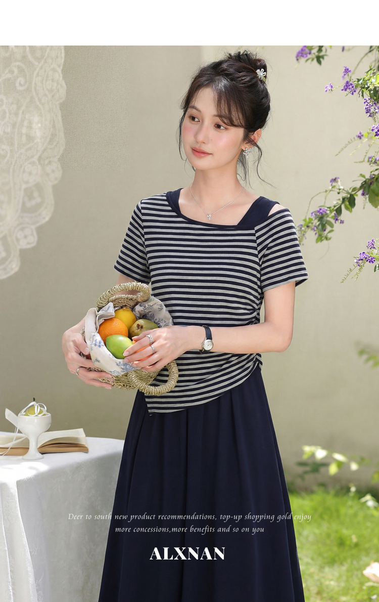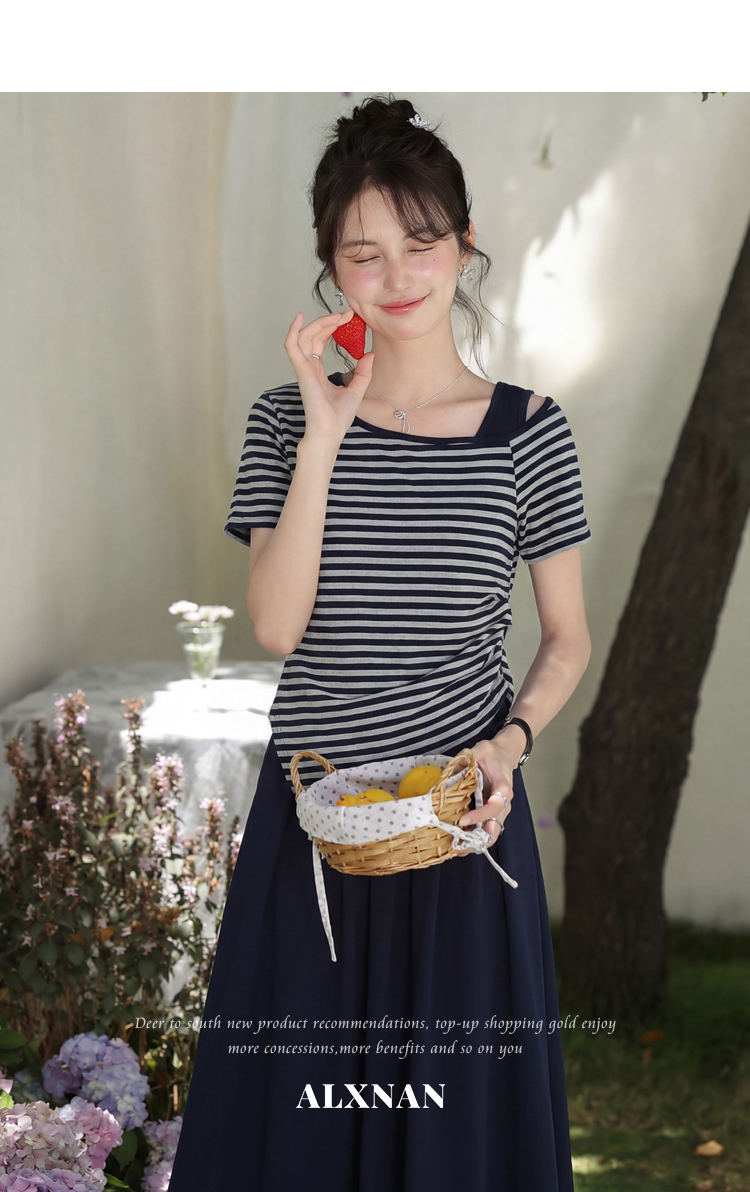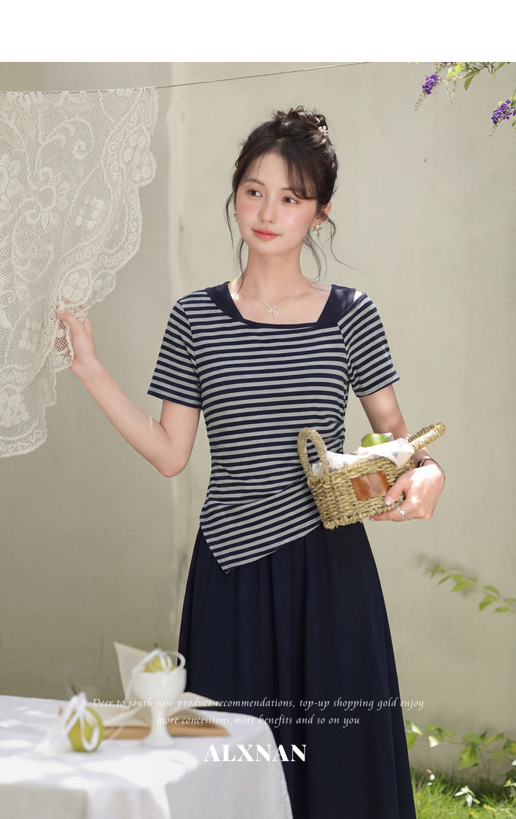鹿向南「塞纳夏柠」小个子斜领条纹T恤女夏褶皱收腰显瘦短款上衣
