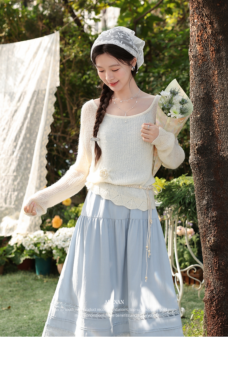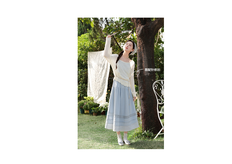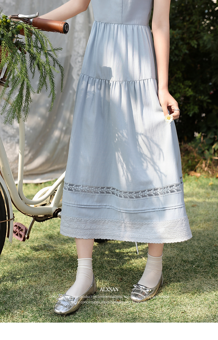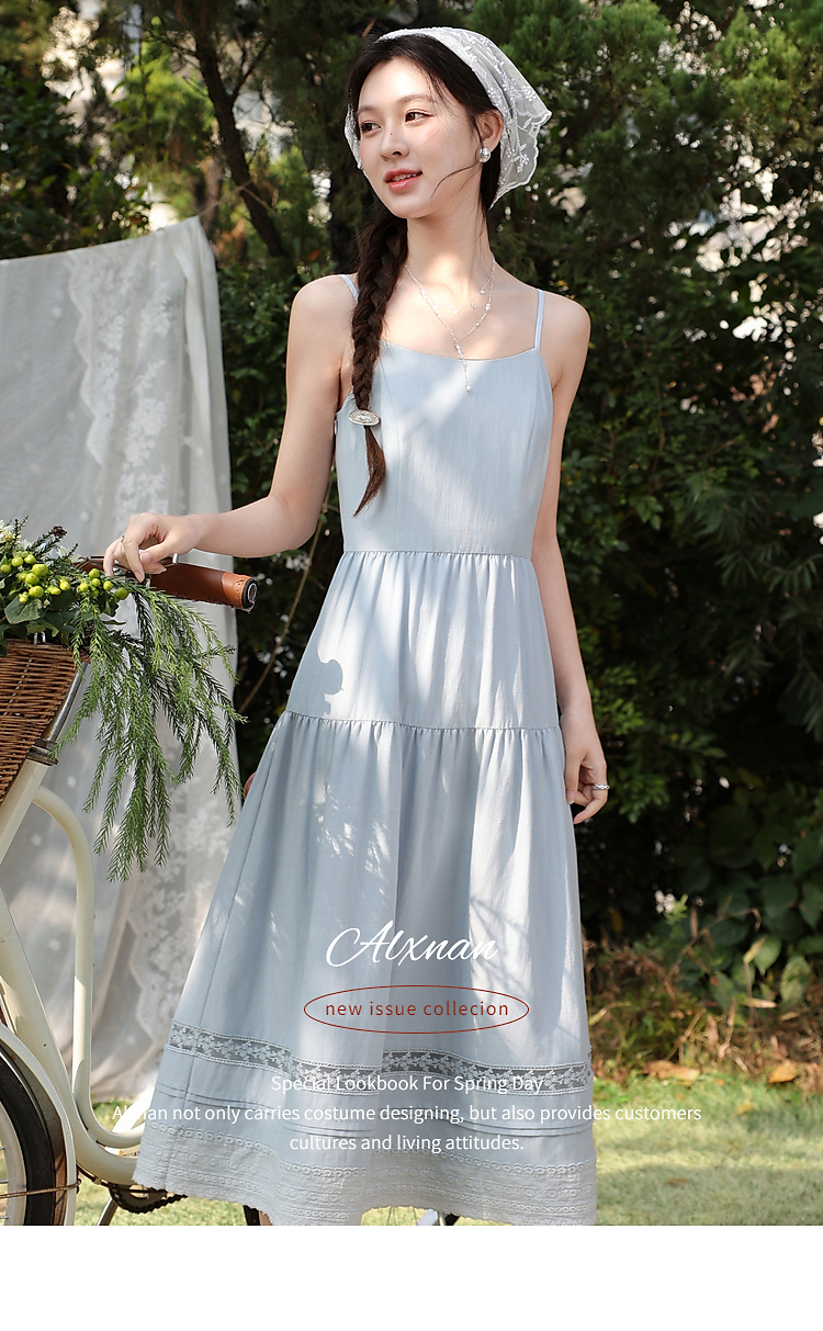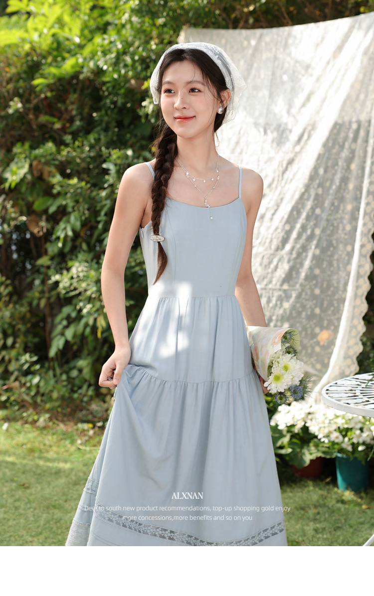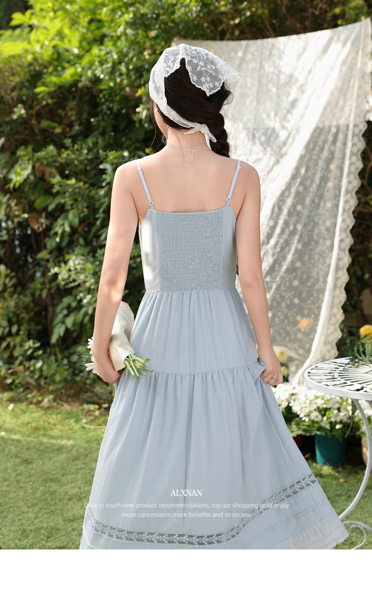 鹿向南「蓝雾岛屿」蓝色吊带连衣裙女春季新款高腰拼接无袖长裙