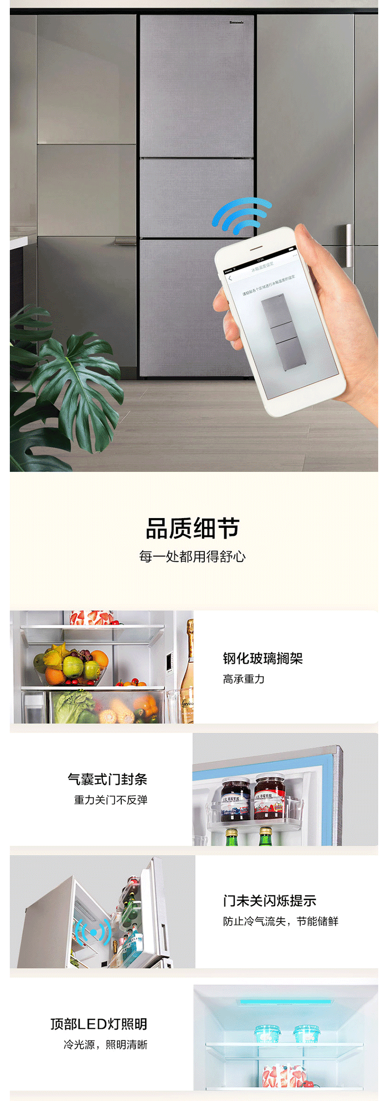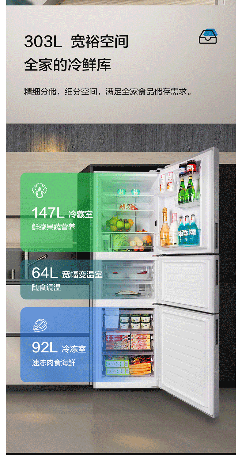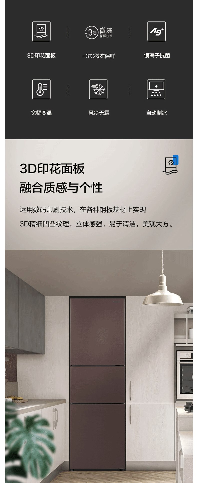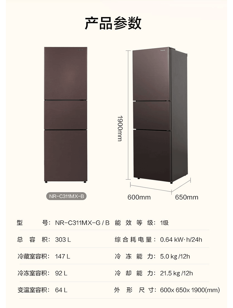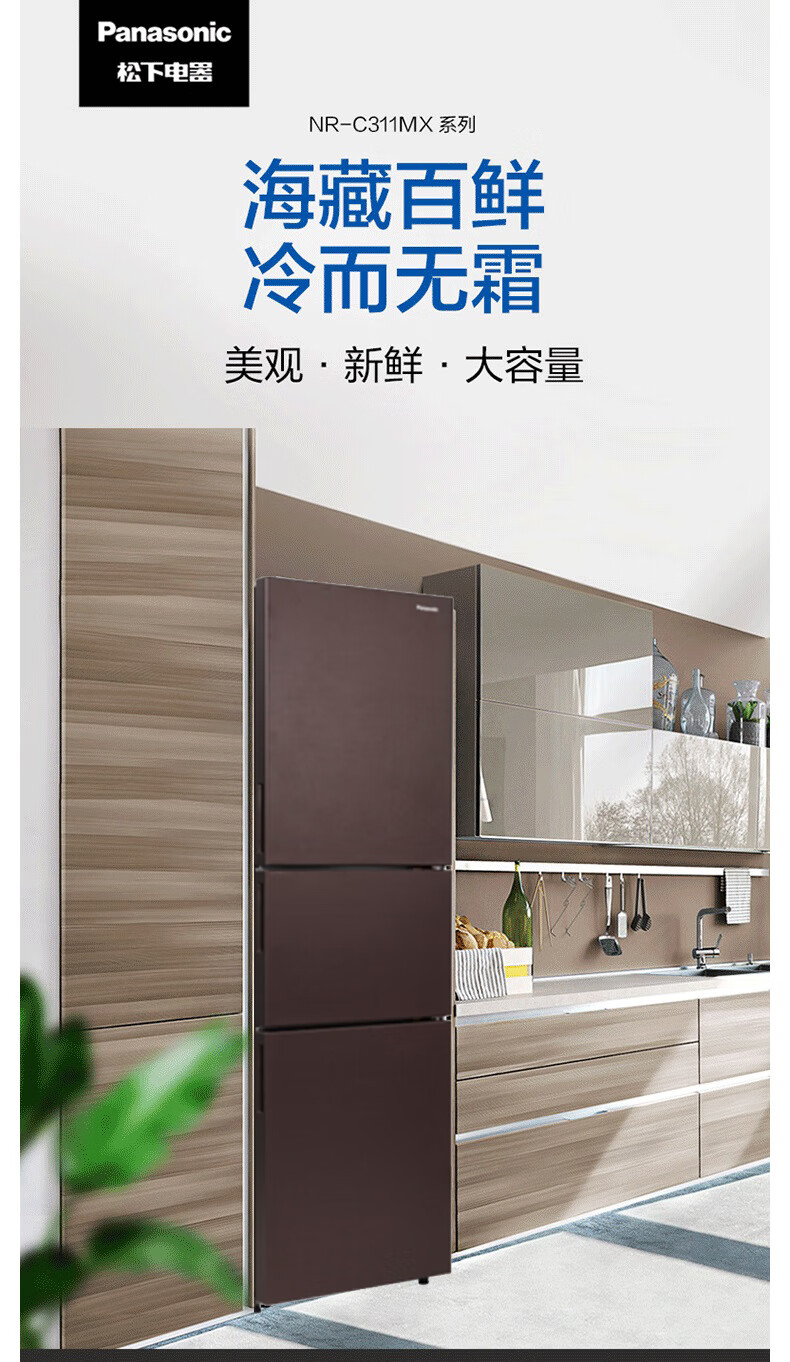 松下(Panasonic)NR-C311MX-B 303升三门微冻保鲜智能变频冰箱 银离子除菌 自动制冰 岩石棕 企业专享