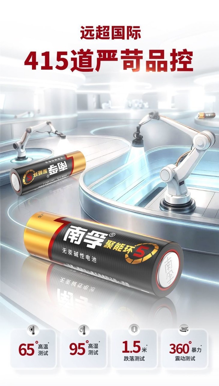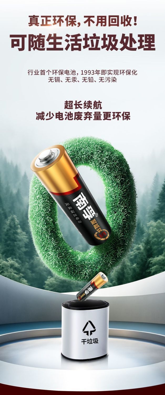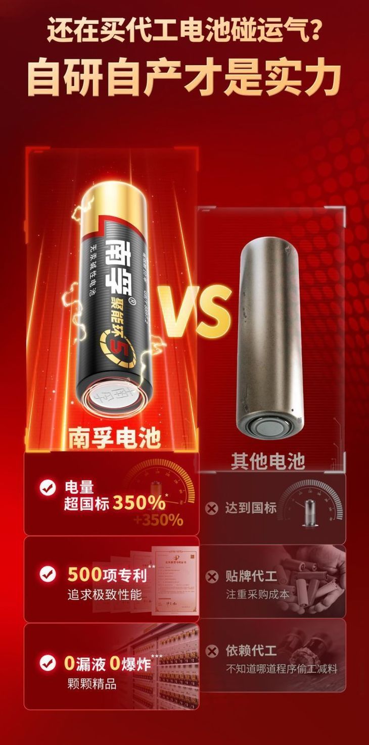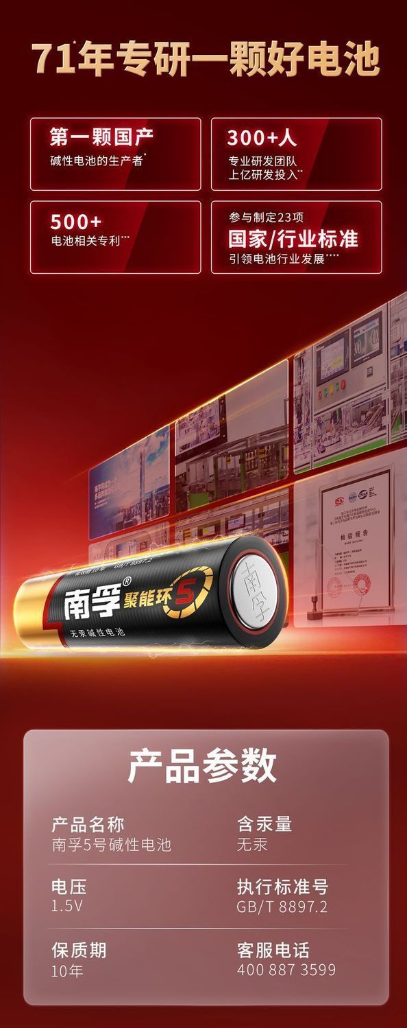 电池类,咱们要买就买好的,好的品质有保证 大品牌,放心购买 与其他电池相比,南孚的质量超级可靠 南孚数十年如一日埋头于碱性电池研发领域 潜心技术革新,不断为用户带来聚能环系列“续集”