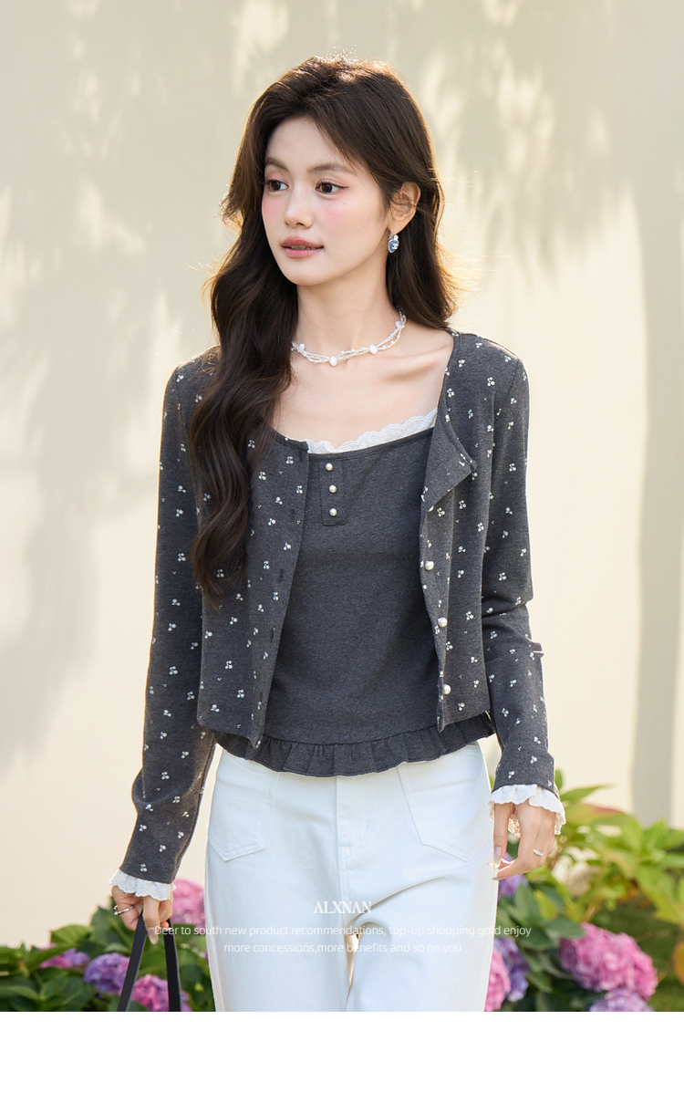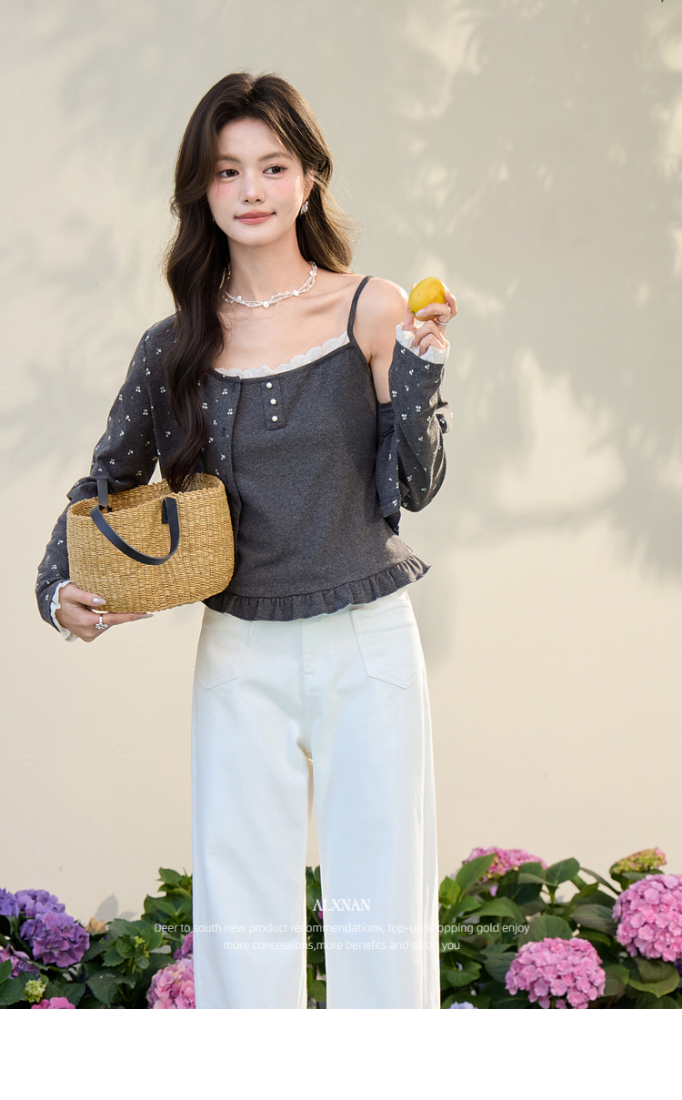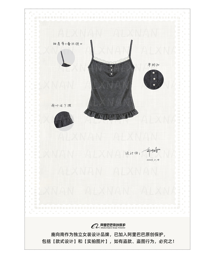 鹿向南「柔软糖心」蕾丝领荷叶边灰色背心吊带女春季内搭打底上衣