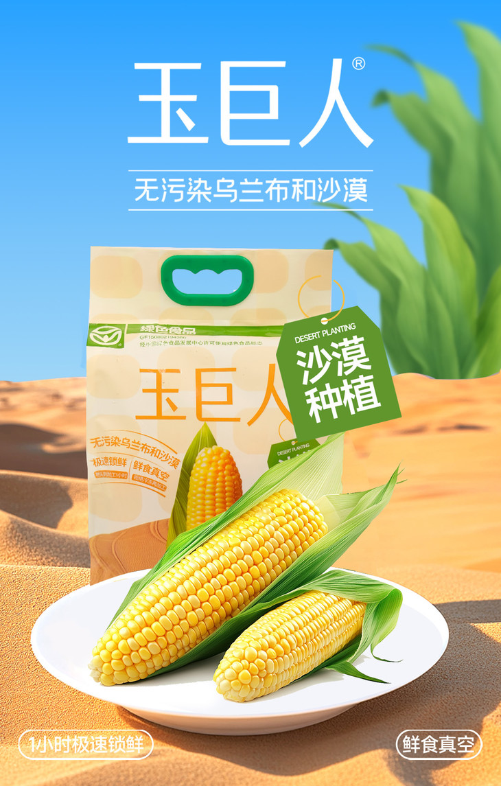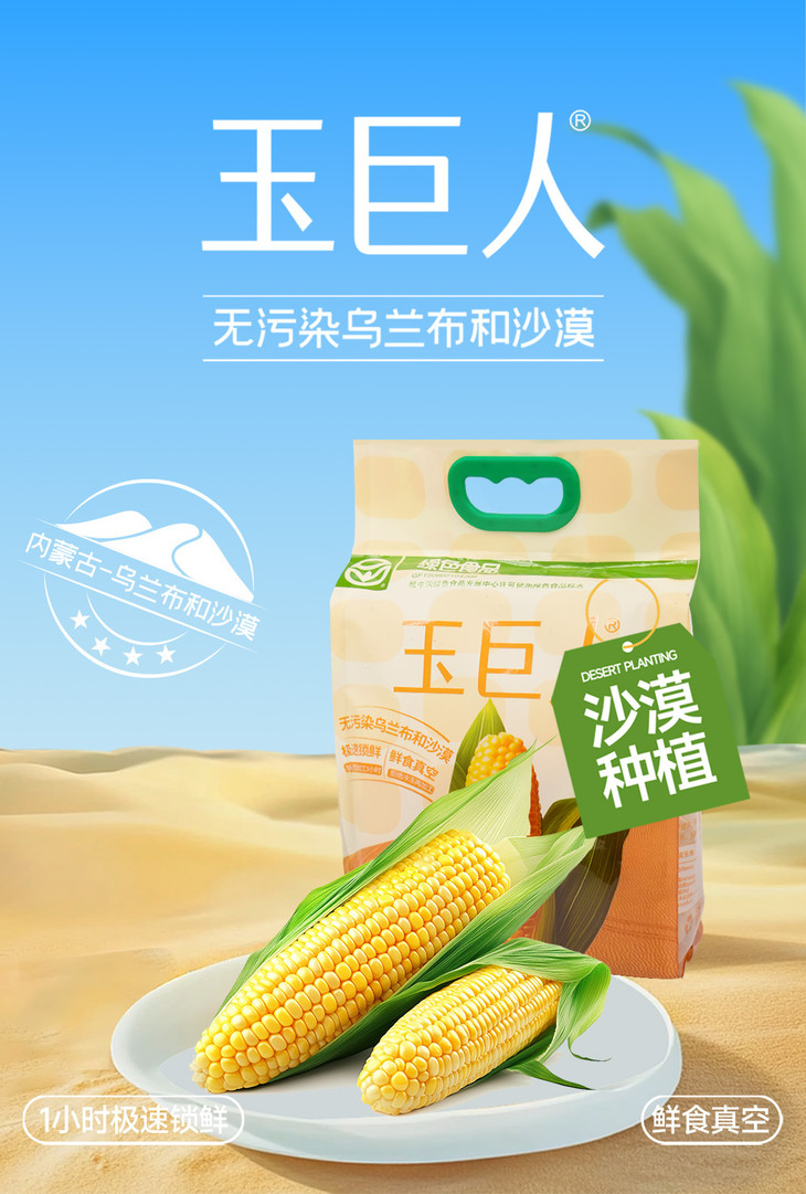 //【皇饿吗&玉巨人 真空包装熟制鲜食玉米】沙漠玉米🌽 糯叽叽甜滋滋还能拉丝,皮薄肉满,软糯Q弹 ✅无污染种植:源自内蒙古乌兰布和沙漠,天然纯净!