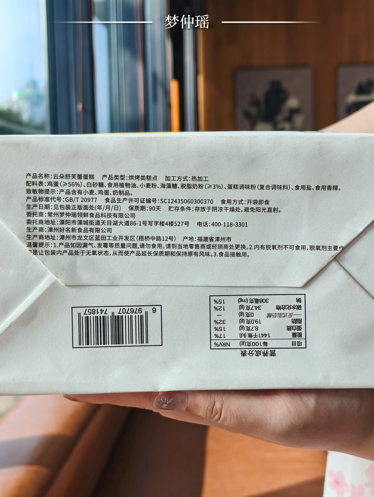 【名称】梦仲瑶云朵舒芙蕾蛋糕 【规格】400g(8包)*2 【生产日期】近期生产 【保质期】90天 【发货地】江苏 【发货时间】48-72h(如遇爆单等特殊情况顺延) 【发货快递】普通快递随机 【不发货地区】新疆、西藏、港澳台不发 食品类特殊非质量问题不支持七天无理由退换货。产品有问题,签收24小时内,带快递面单和破损图片及包裹外包装售后处理。以上条件缺一不可,超时或者没按要求报备售后不予处理,望理解。