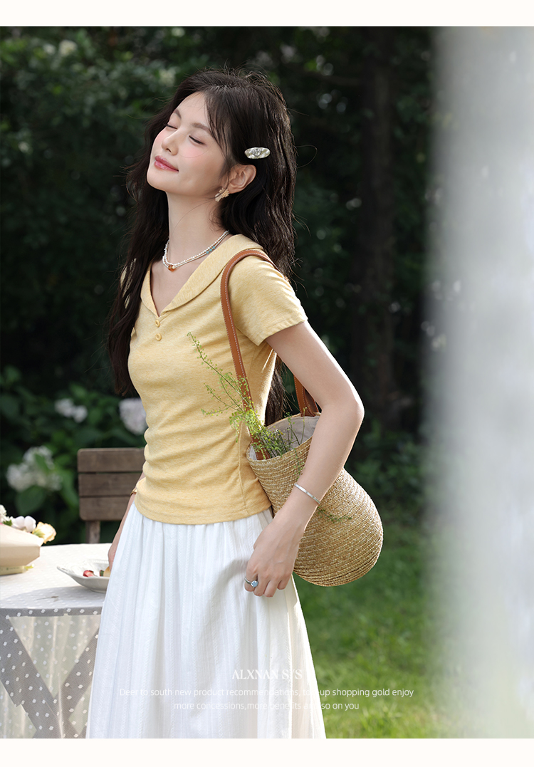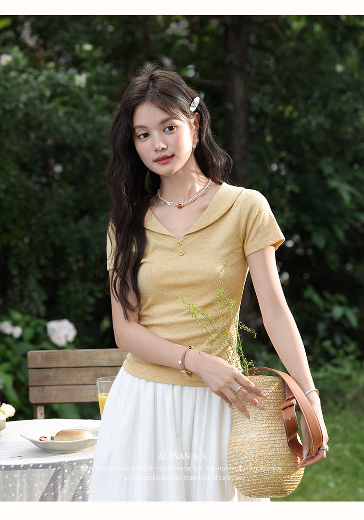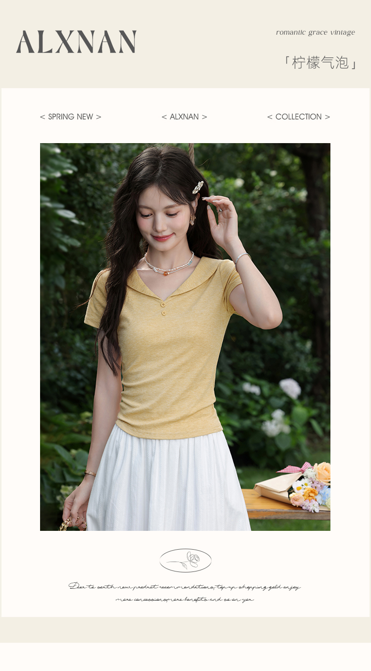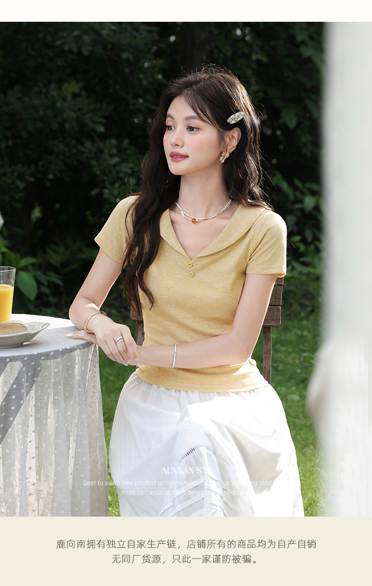 鹿向南「柠檬气泡」温柔风黄色V领短袖T恤女夏季收腰显瘦上衣小众