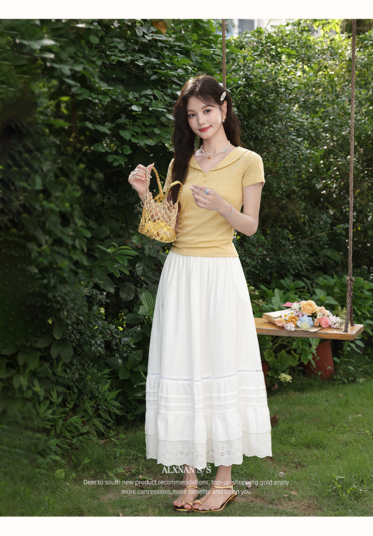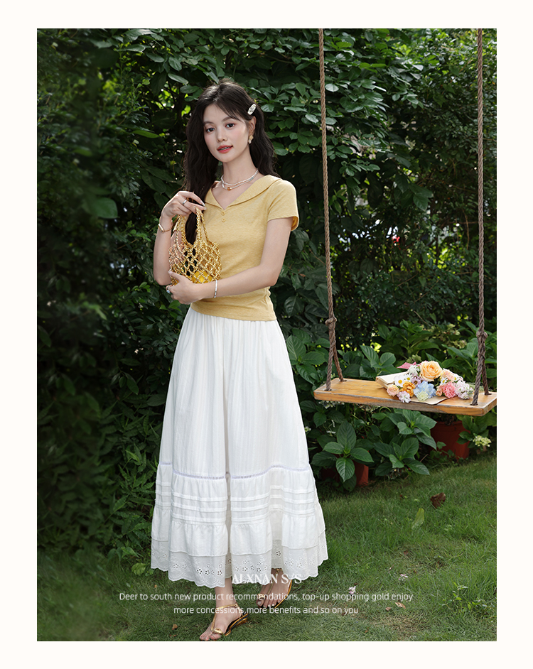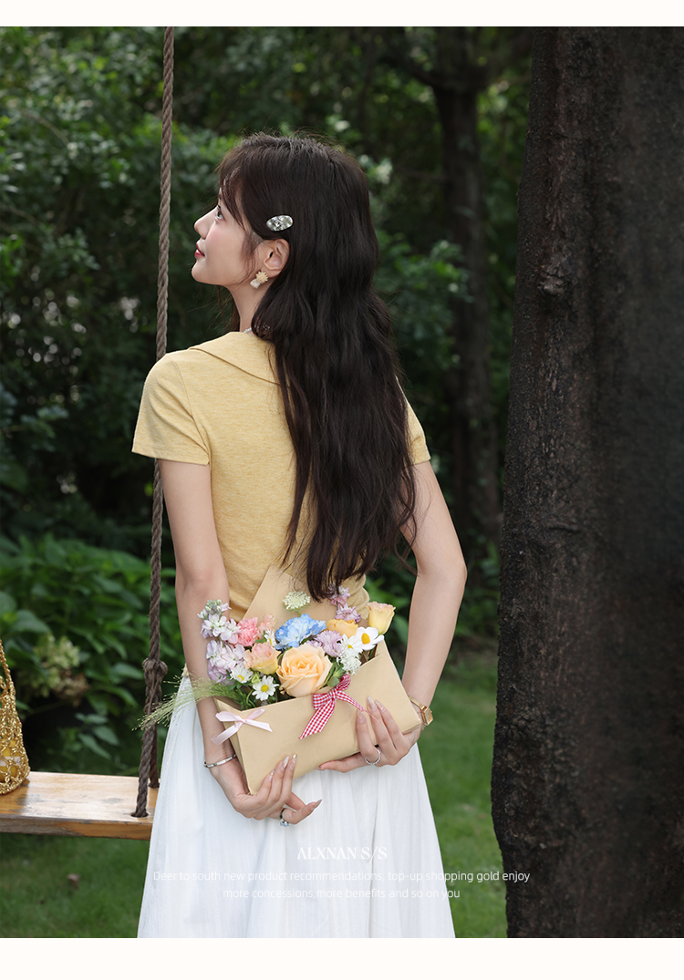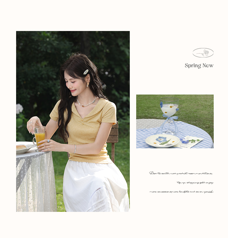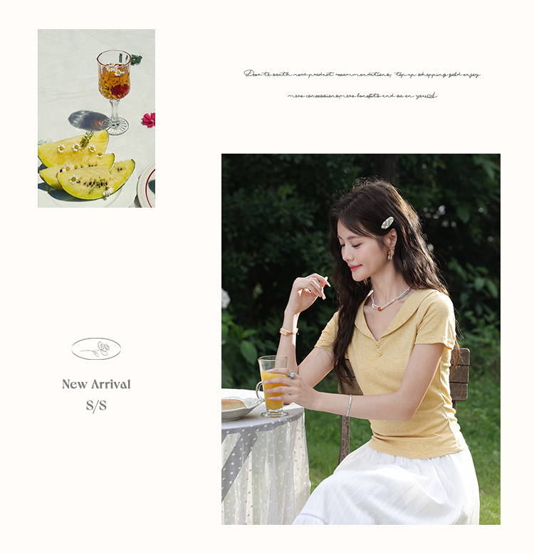 鹿向南「柠檬气泡」温柔风黄色V领短袖T恤女夏季收腰显瘦上衣小众