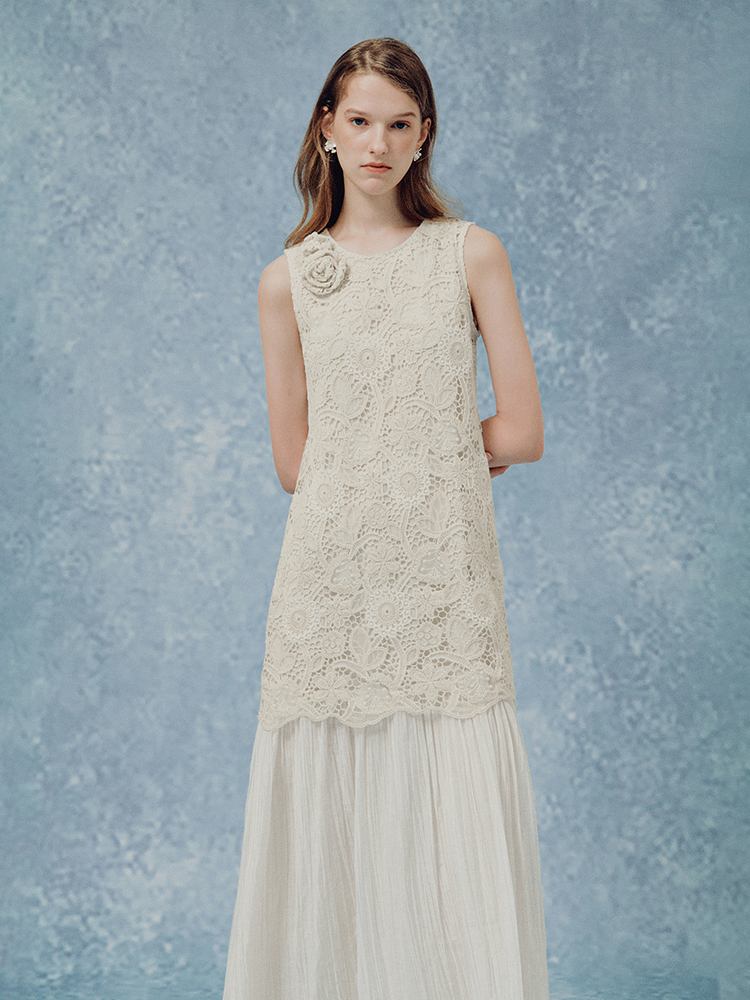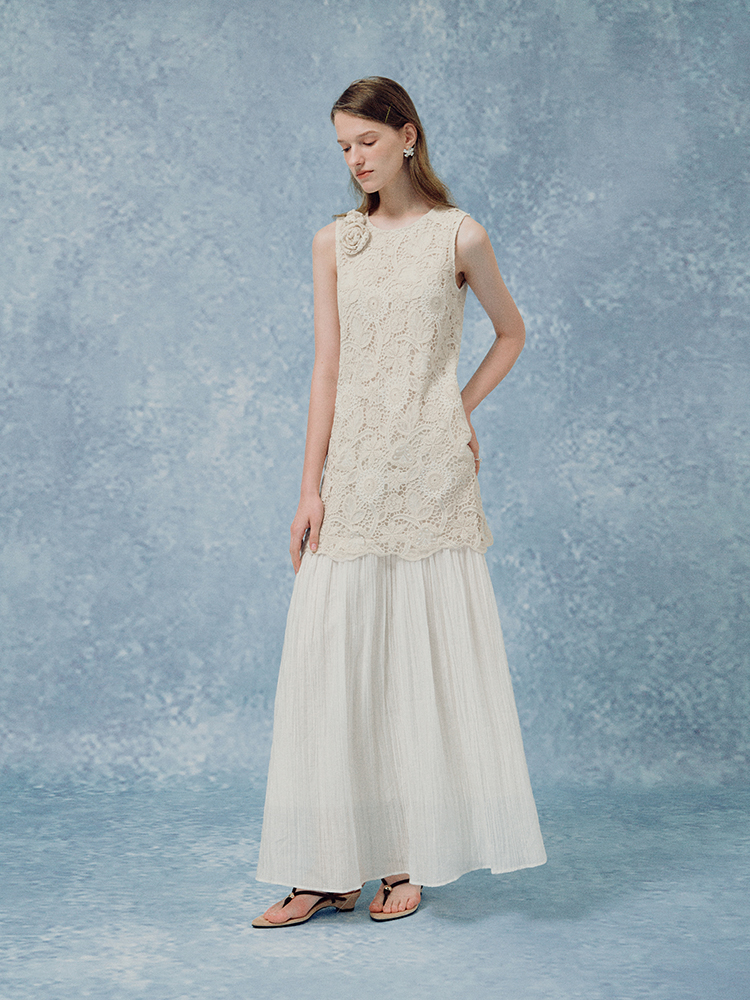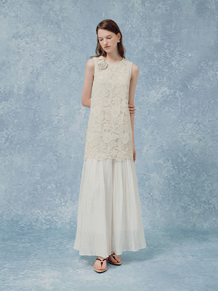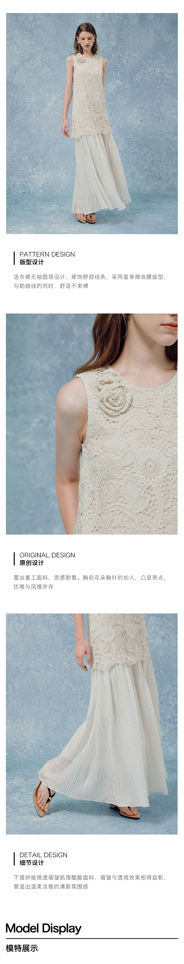 ForPoem 现货 25/SS原创设计重工钩针立体花胸针肌理裙摆长款连衣裙
