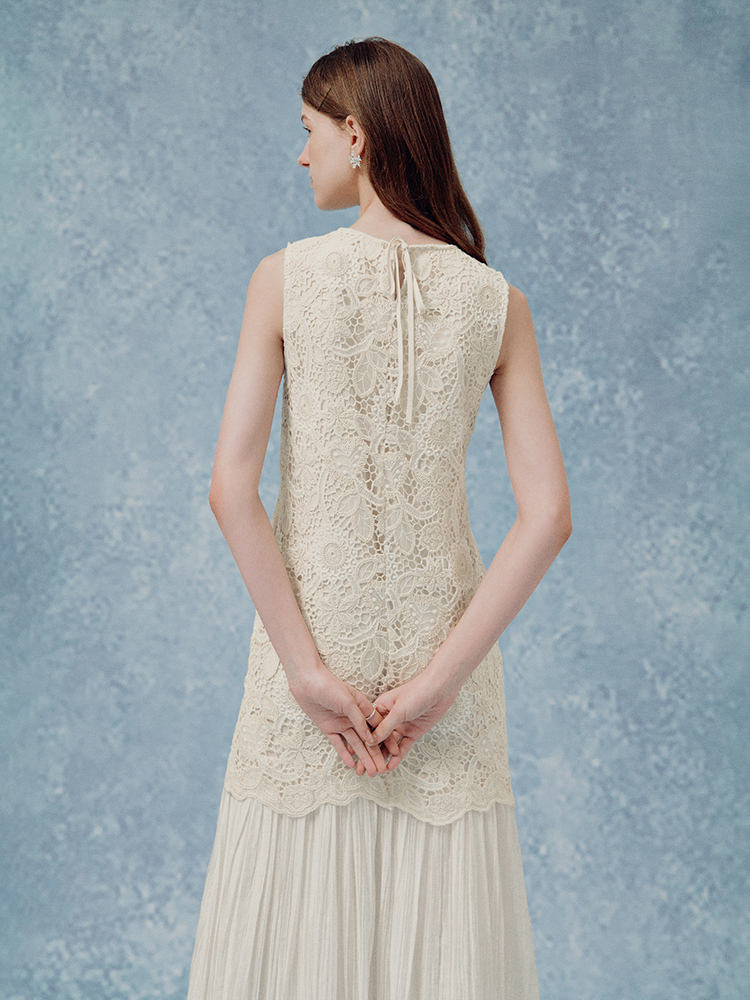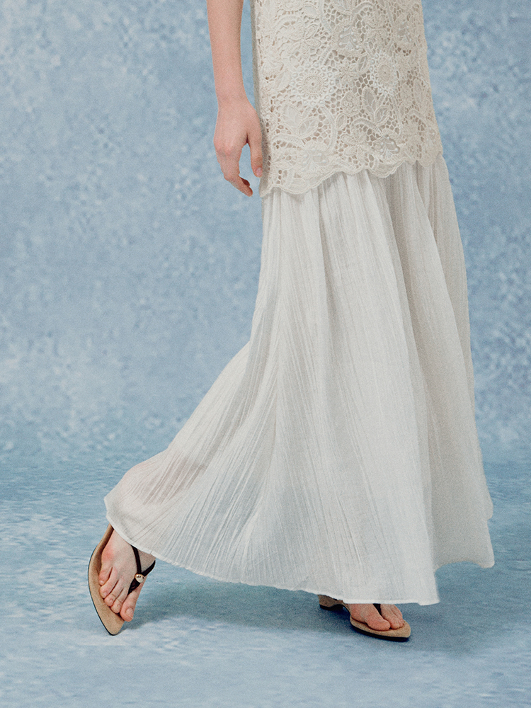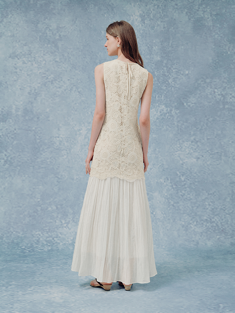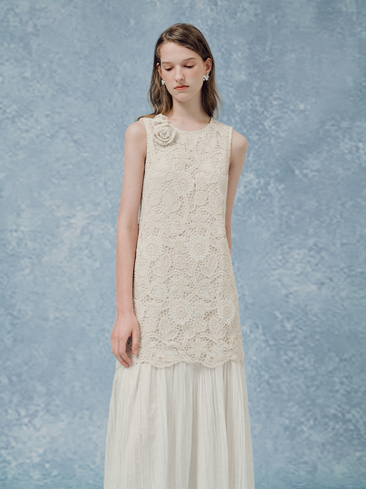 ForPoem 现货 25/SS原创设计重工钩针立体花胸针肌理裙摆长款连衣裙