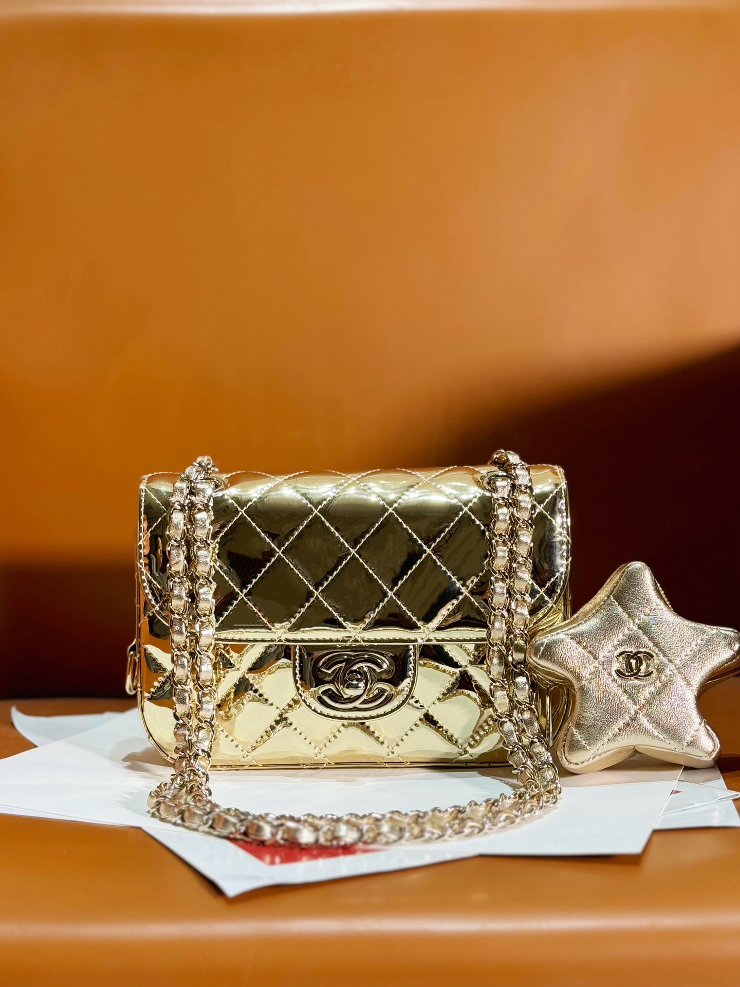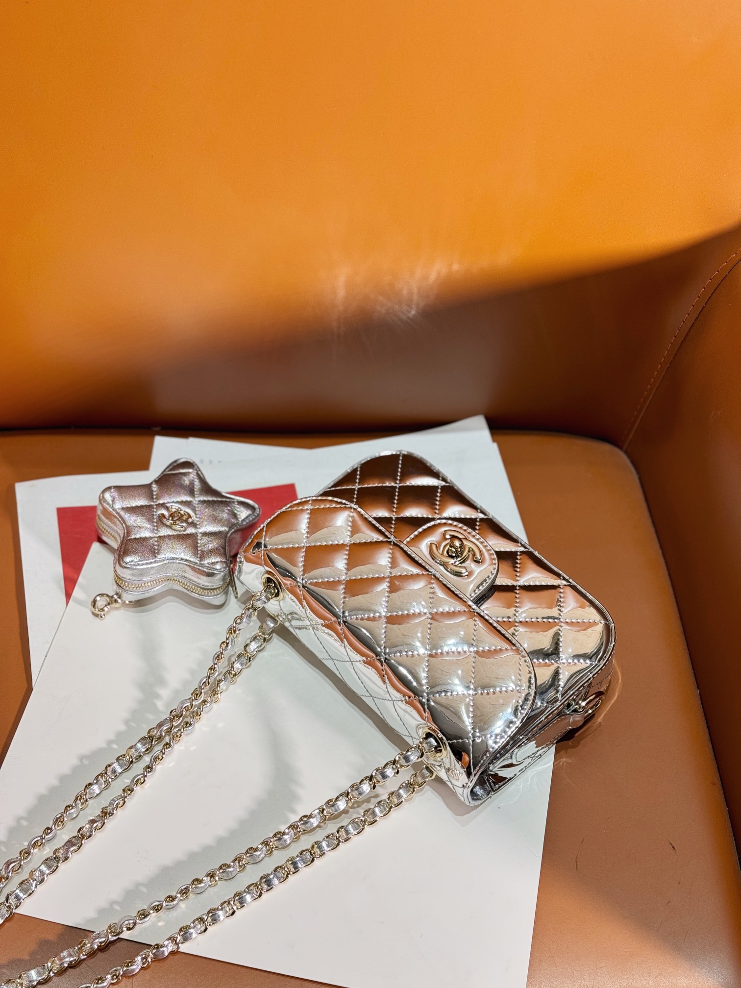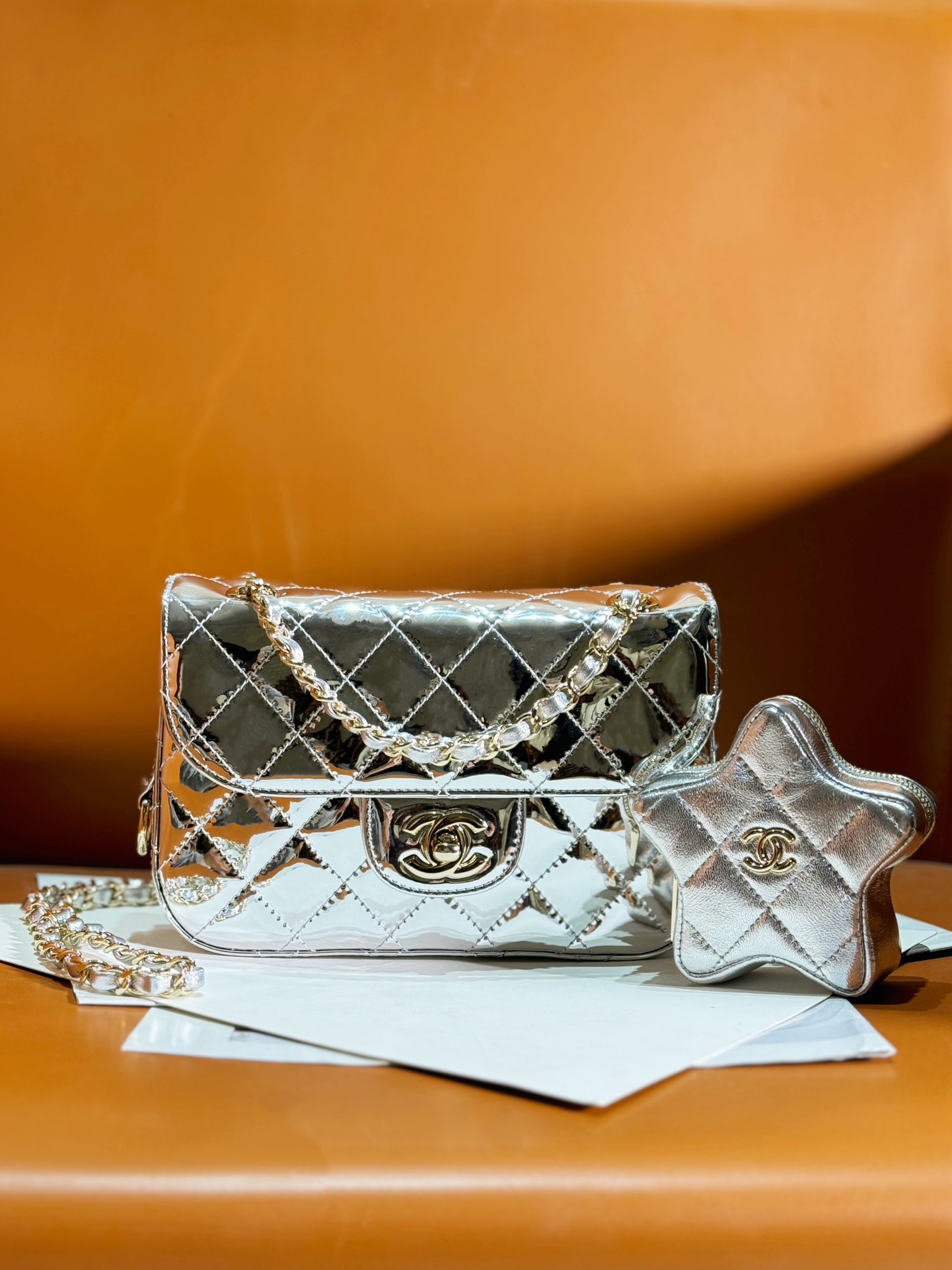 OHANEL ??24C 漆皮星星CF 口盖包 要说24C的实用王者五角星?这只链条包一定拥有姓名了! 漆皮镜面材质真的是相当吸睛,就好像美少女战士的包包一样 自带光芒,甜美与酷感并存!容量空间也很足够?? 五角星零钱包是可拆卸的设计,有种买一送一的惊喜感??