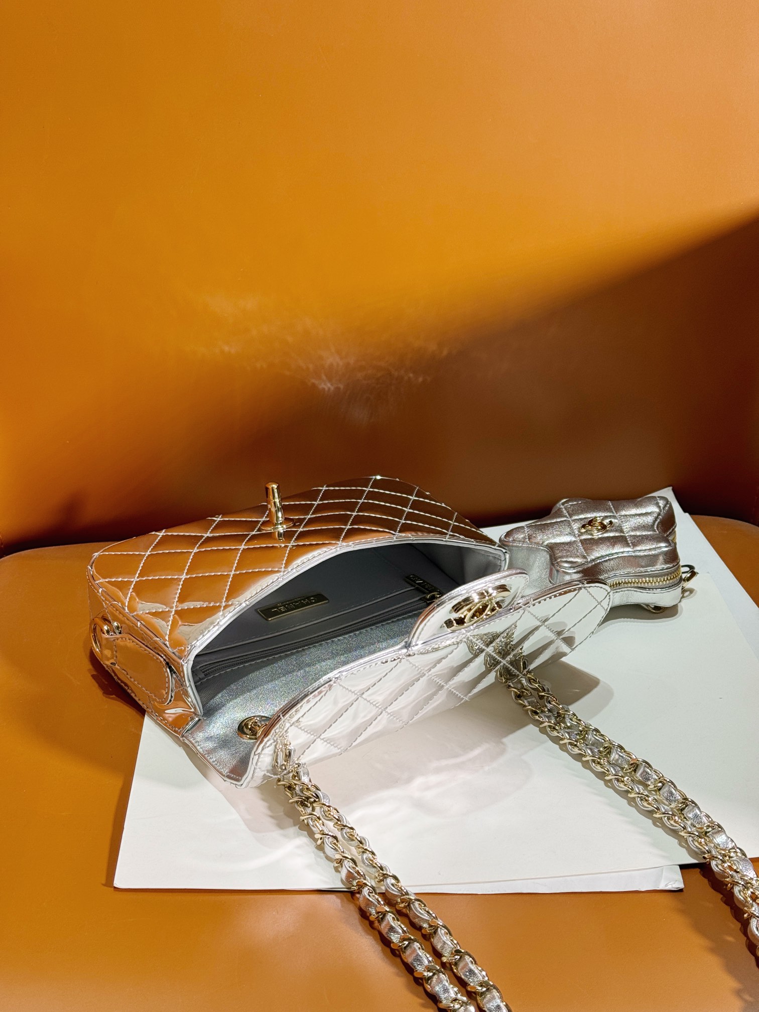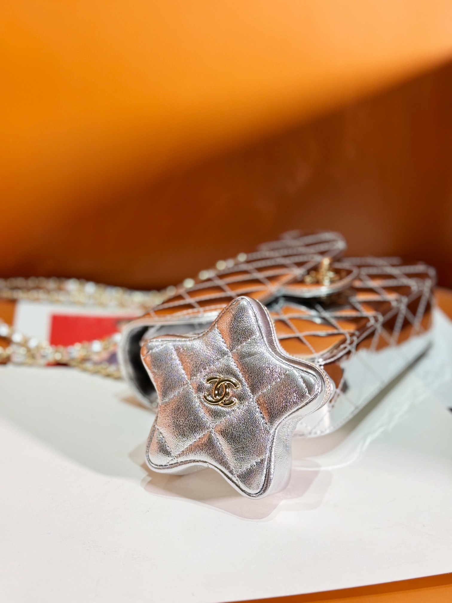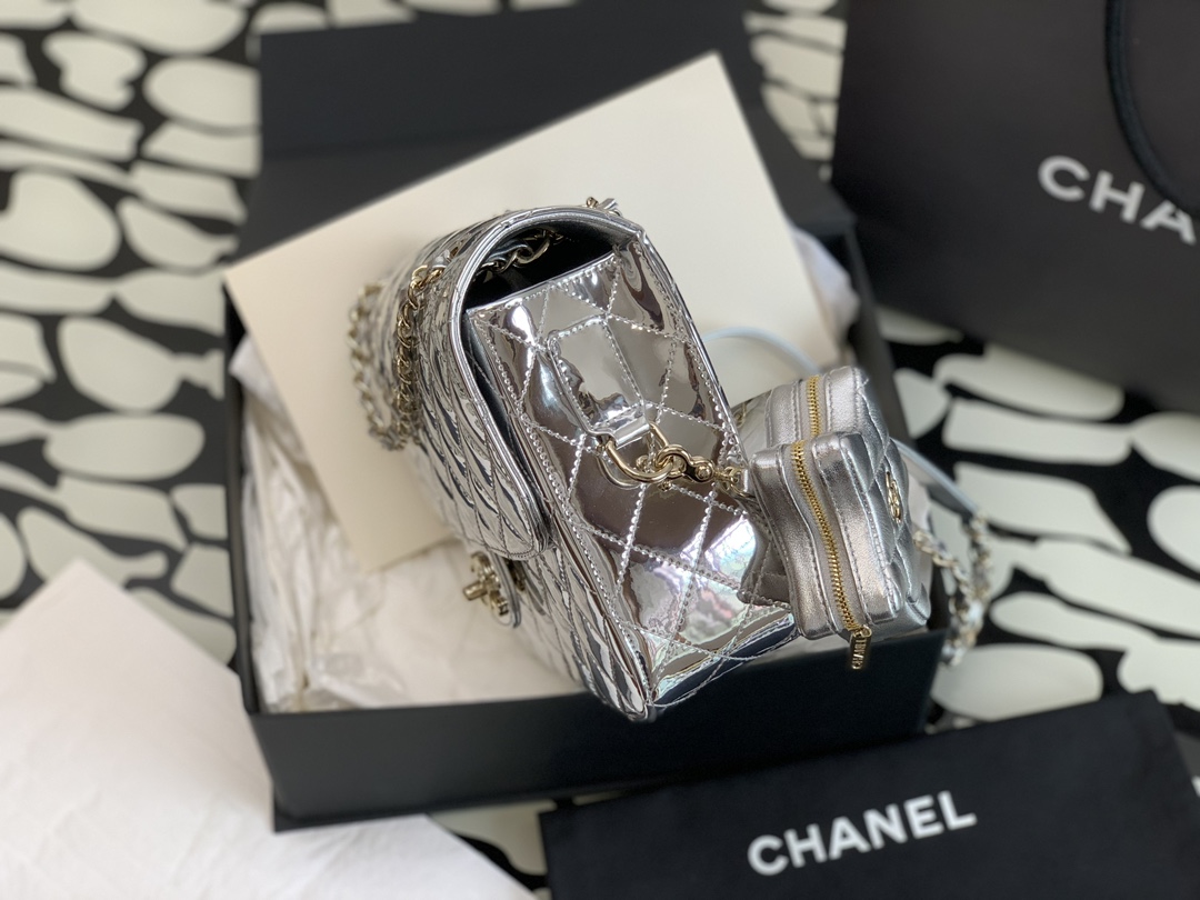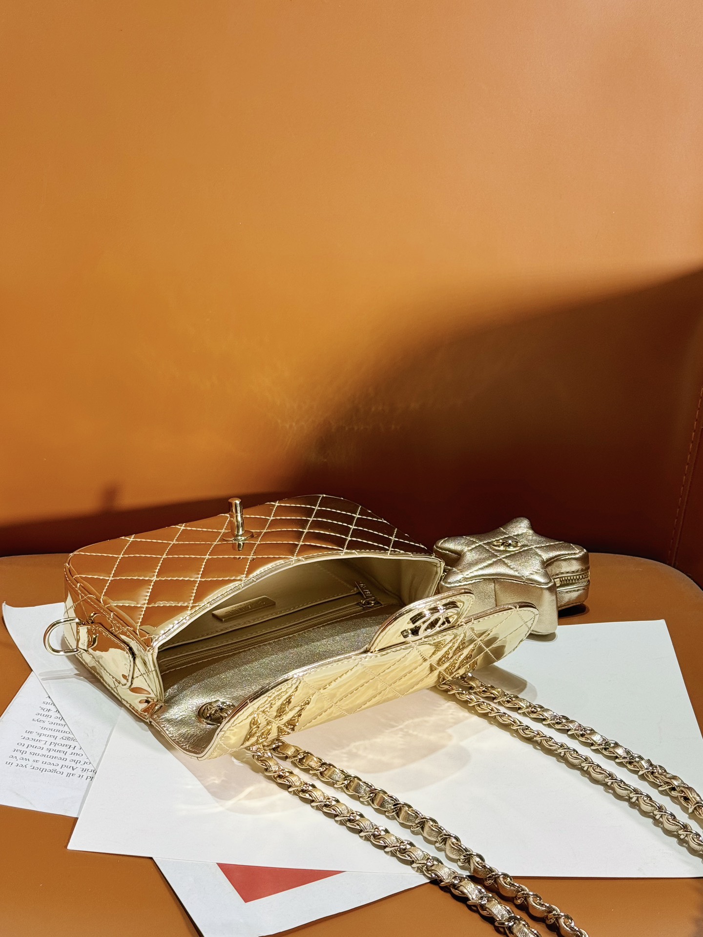 OHANEL ??24C 漆皮星星CF 口盖包 要说24C的实用王者五角星?这只链条包一定拥有姓名了! 漆皮镜面材质真的是相当吸睛,就好像美少女战士的包包一样 自带光芒,甜美与酷感并存!容量空间也很足够?? 五角星零钱包是可拆卸的设计,有种买一送一的惊喜感??