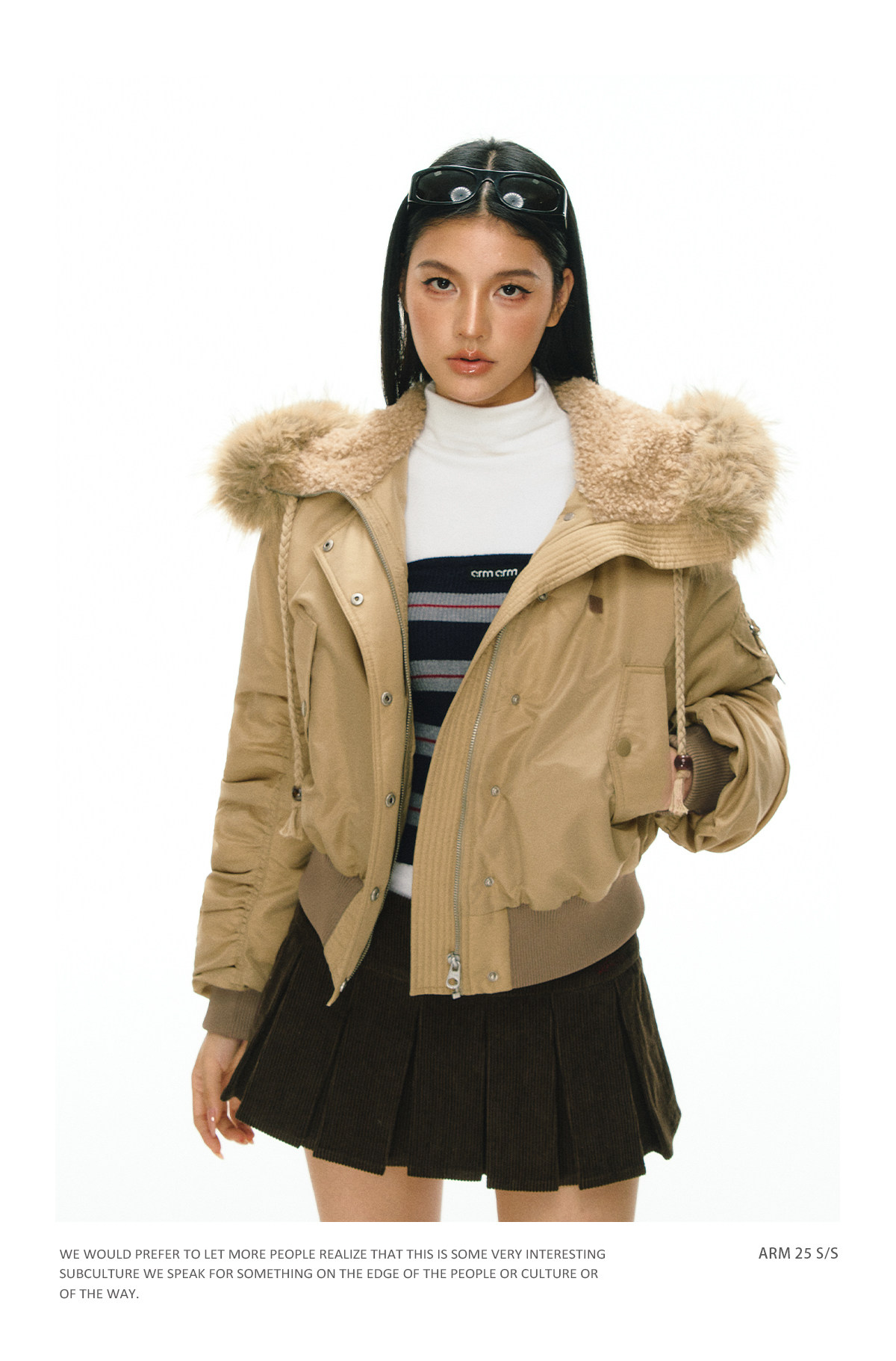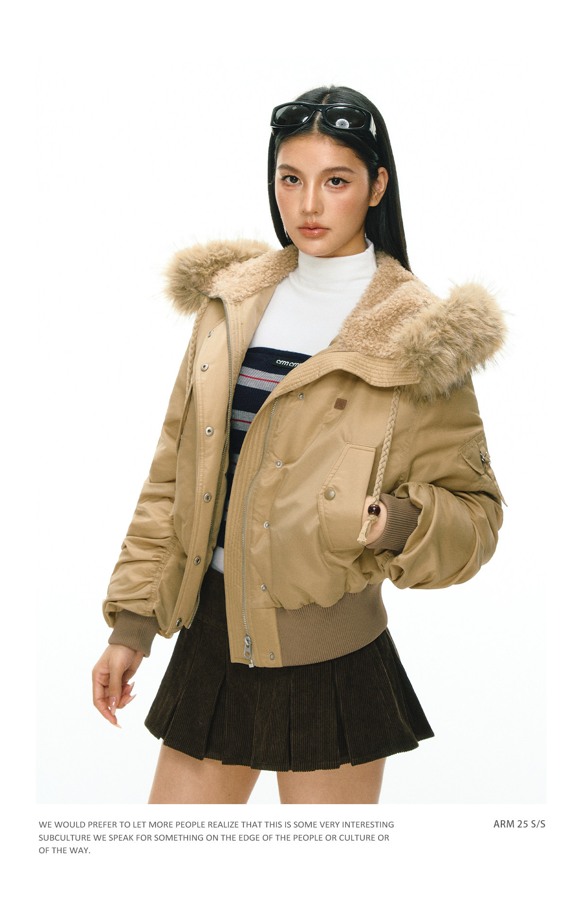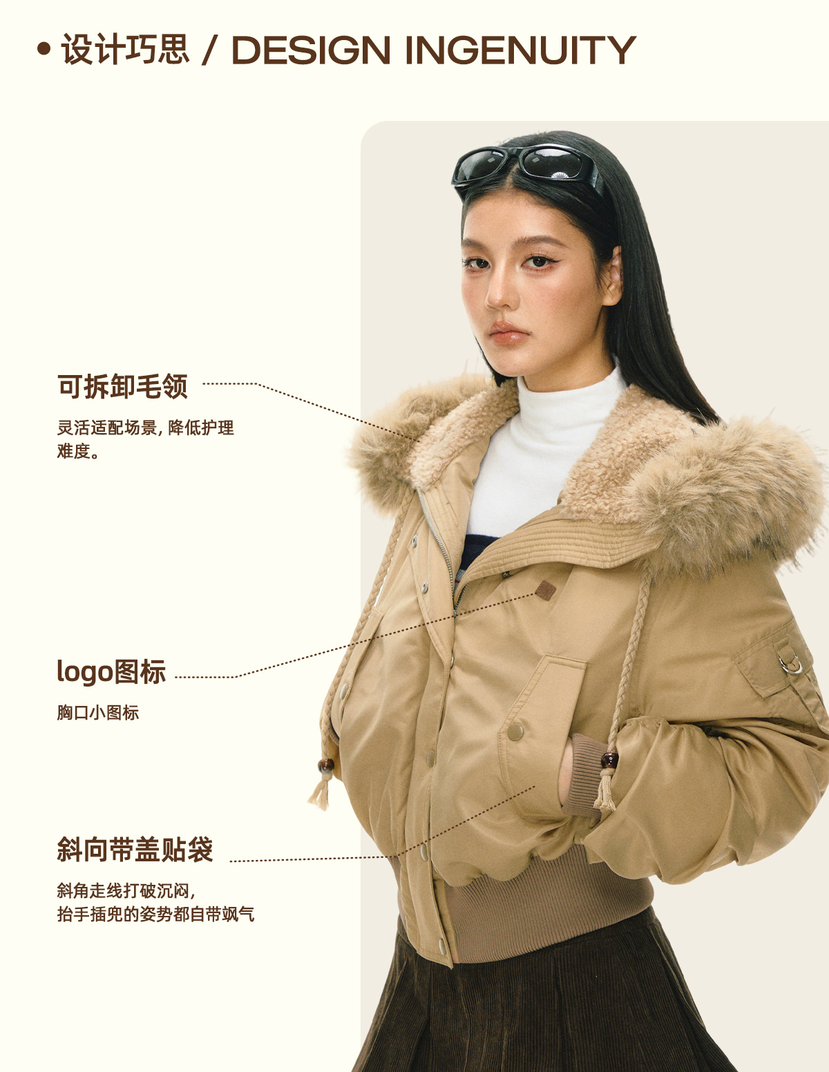 Ariseism 美式复古设计感可脱卸连帽棉服外套女冬季新款修身棉衣
