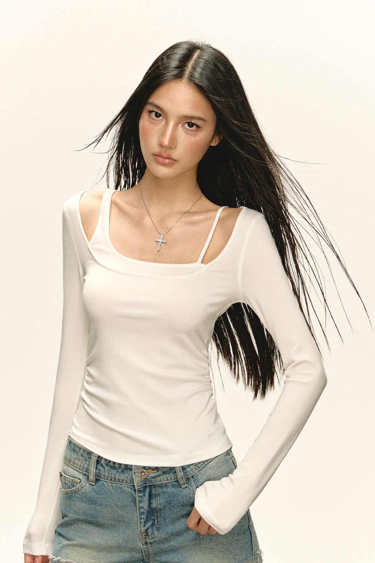 Ariseism 美式亨利领白色修身长袖T恤女秋季紧身上衣内搭打底衫