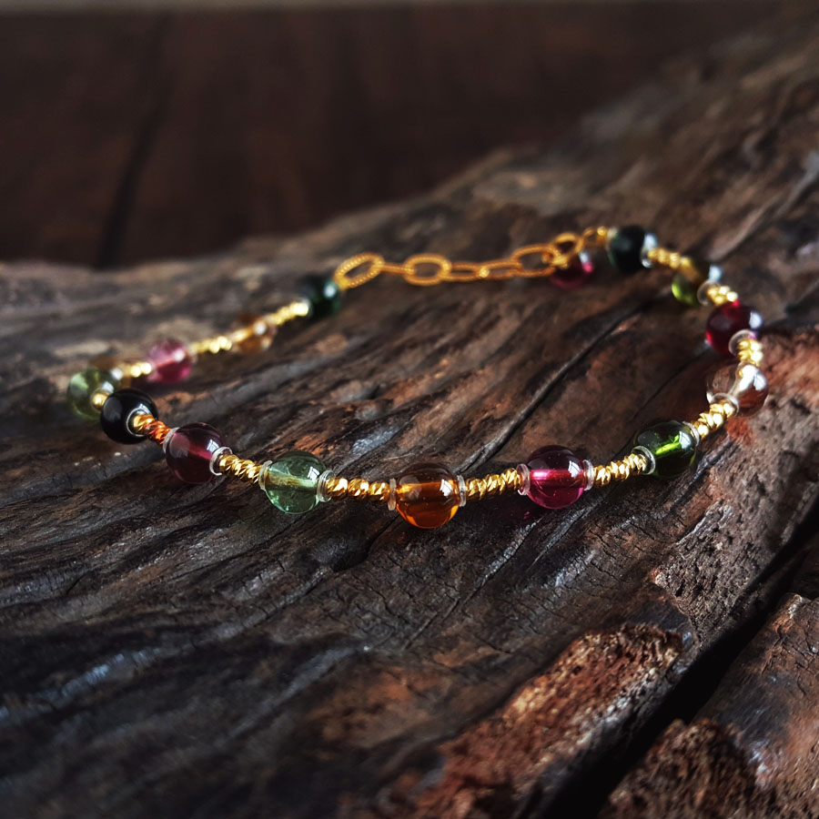 【天然正品】AU750精品黄金镶天然约5.3MM高净度糖果色多巴胺碧玺圆珠手链20CM(长短可调节)250326NJM32