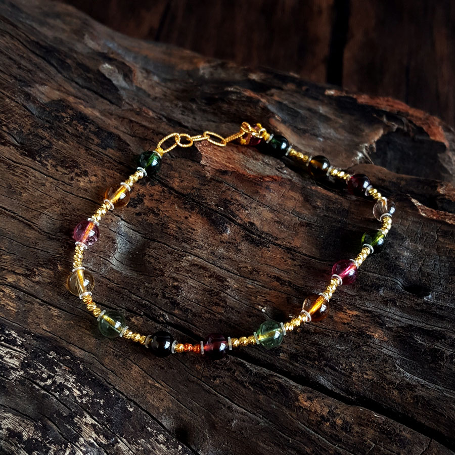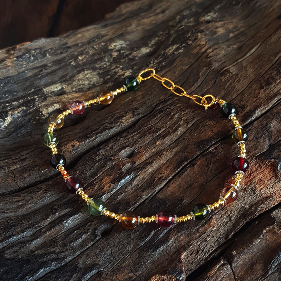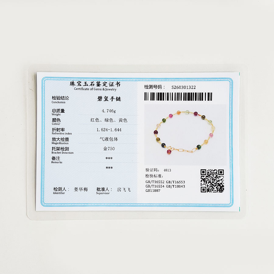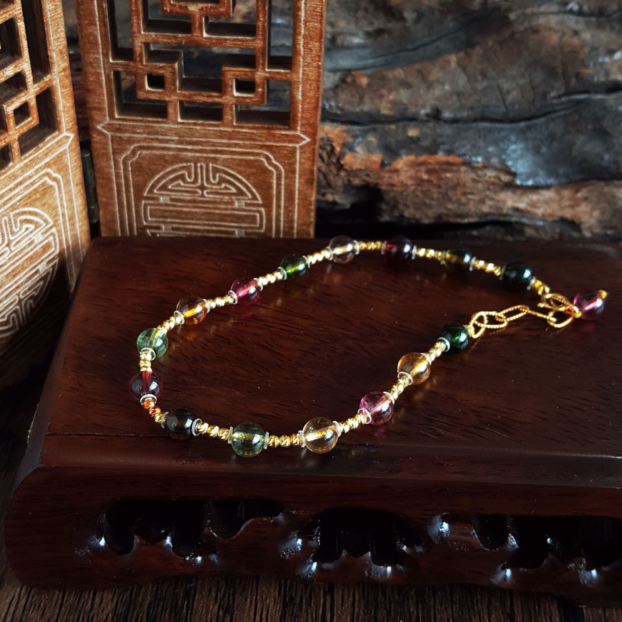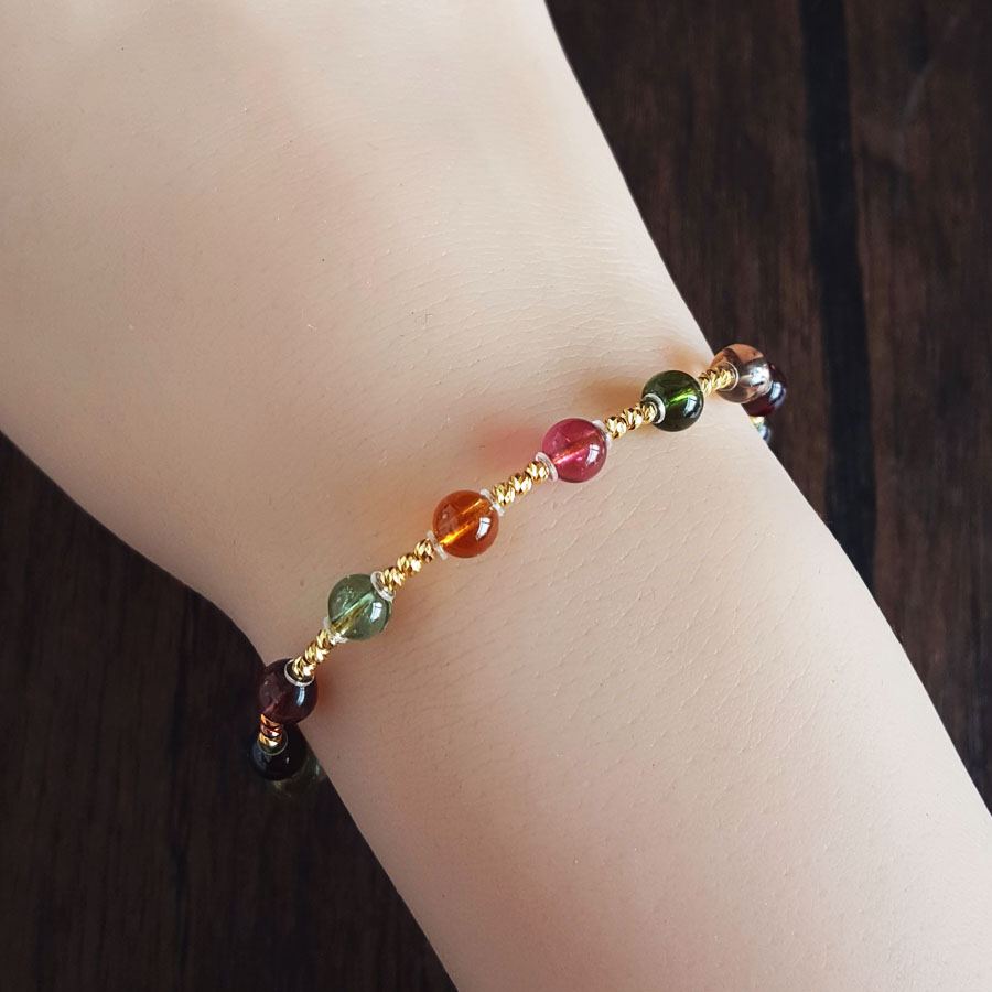 名称 | AU750精品黄金镶天然约5.3MM高净度糖果色多巴胺碧玺圆珠手链 |