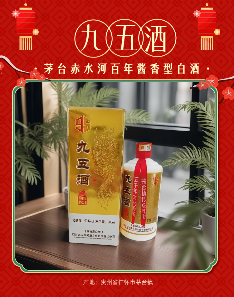 - 九五酒源自金三角产区,百年窖池、非遗工艺、千年传承酿造出泸型单粮浓香、茅台赤水河酱香、宜宾多粮浓香,简称“壹茅五”三种顶级绝佳口感美酒。
