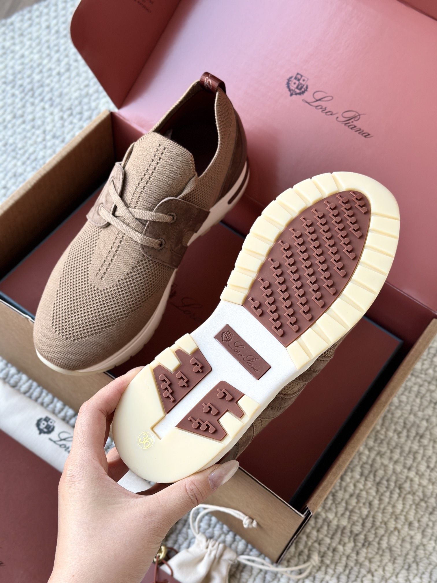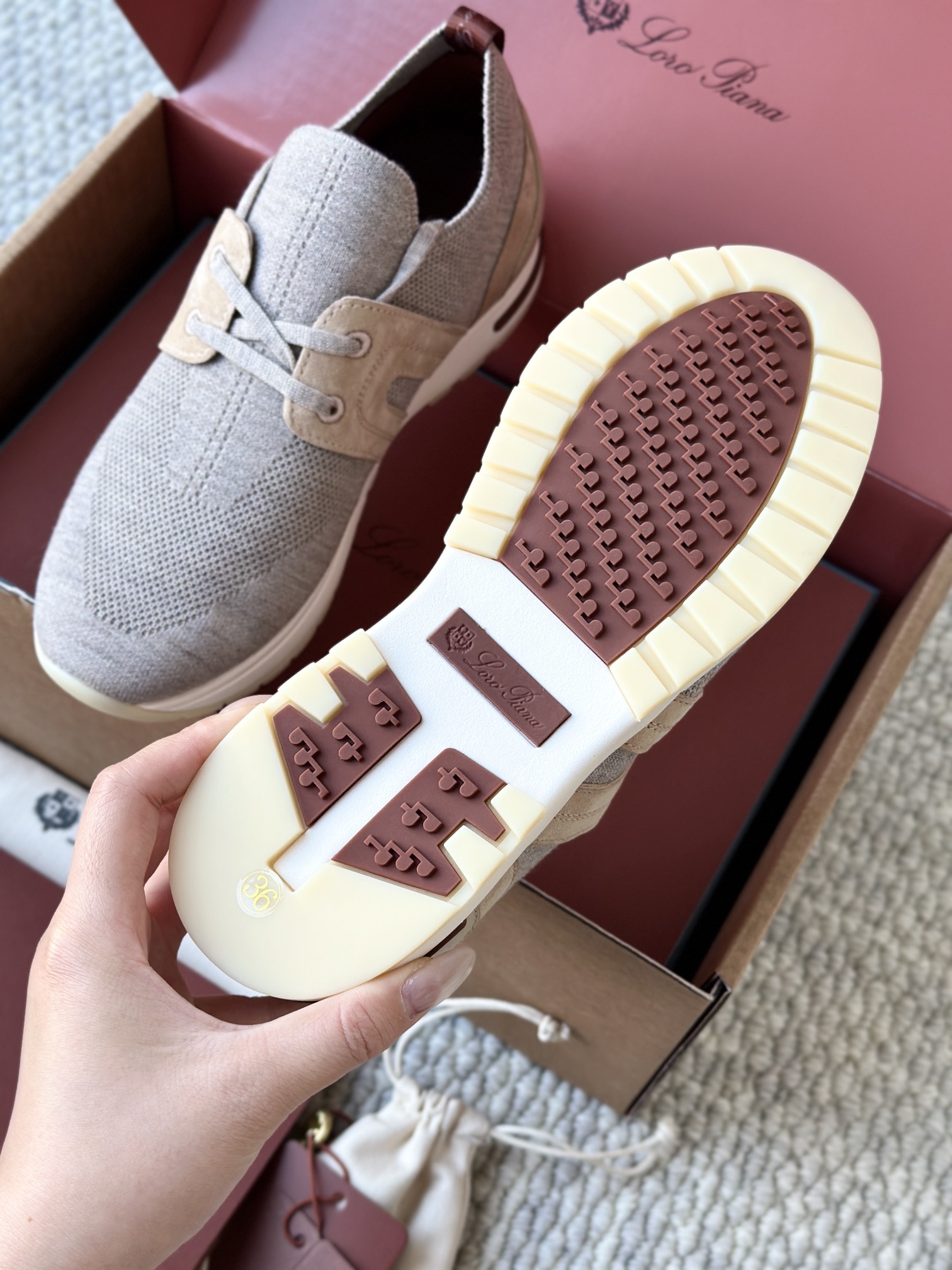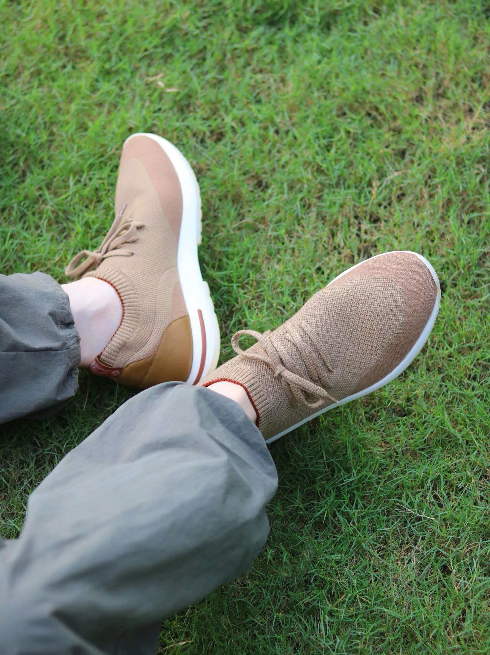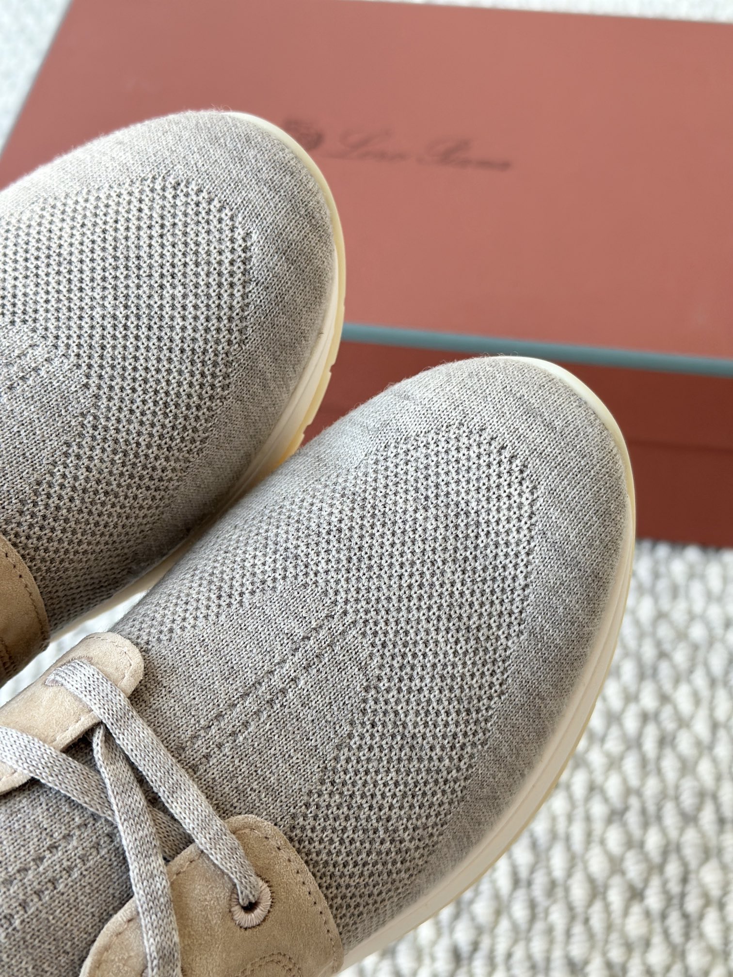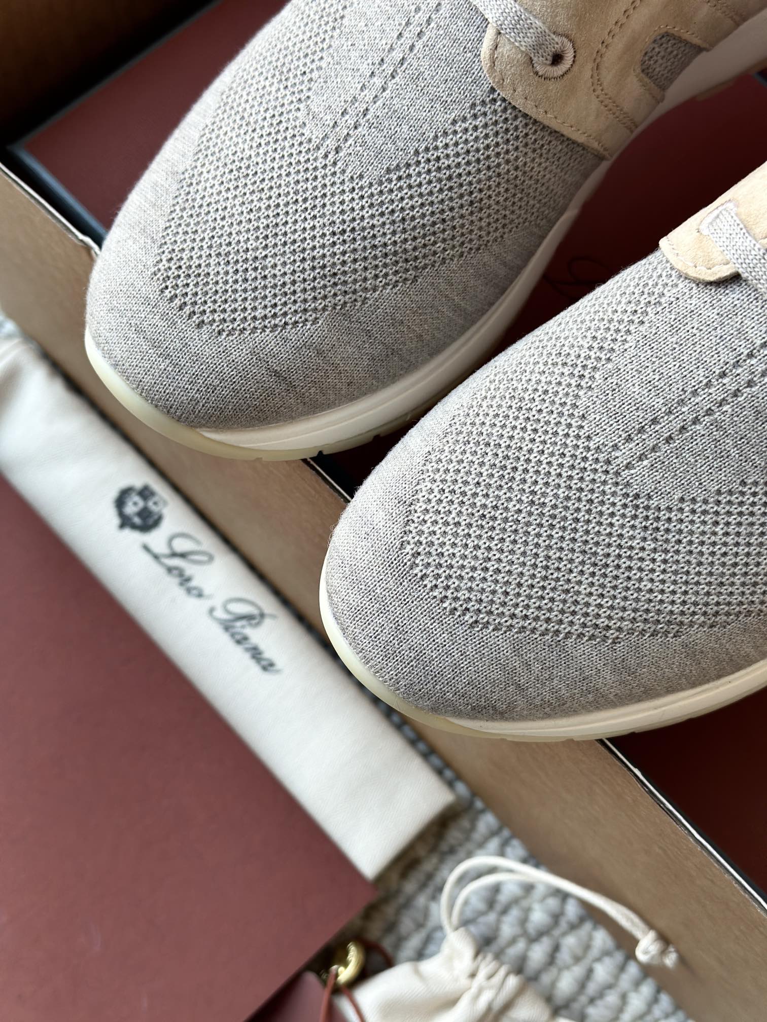 🔸鞋面像毛衣一样在织布机上制成,随后配以轻便鞋底。罗纹松紧带鞋口搭配 Kummel 色饰边 白色鞋外底,配Kummel 色鞋底,印有Loro Piana首字母缩写重复图案Kummel 色提拉环带有Loro Piana 标识