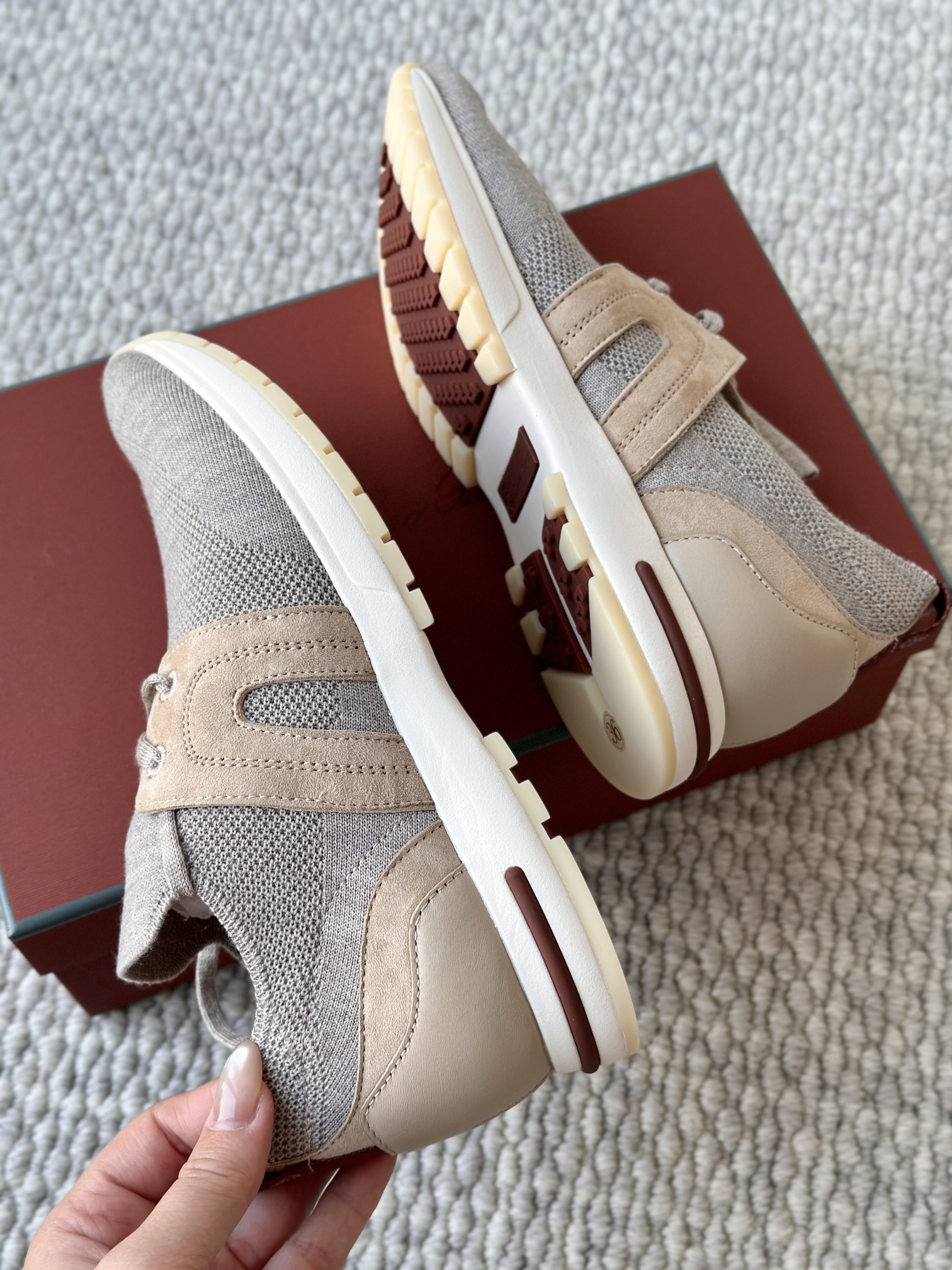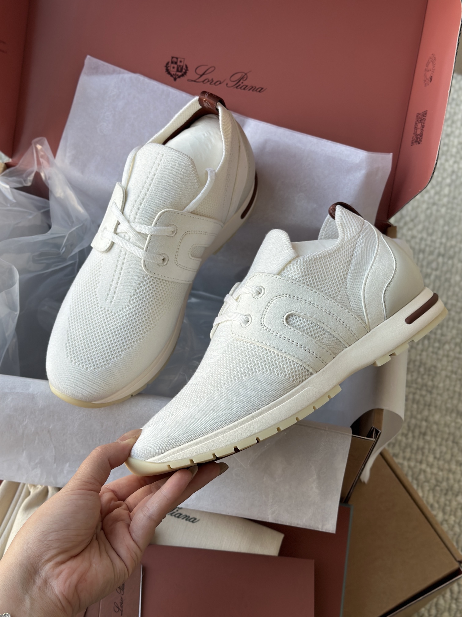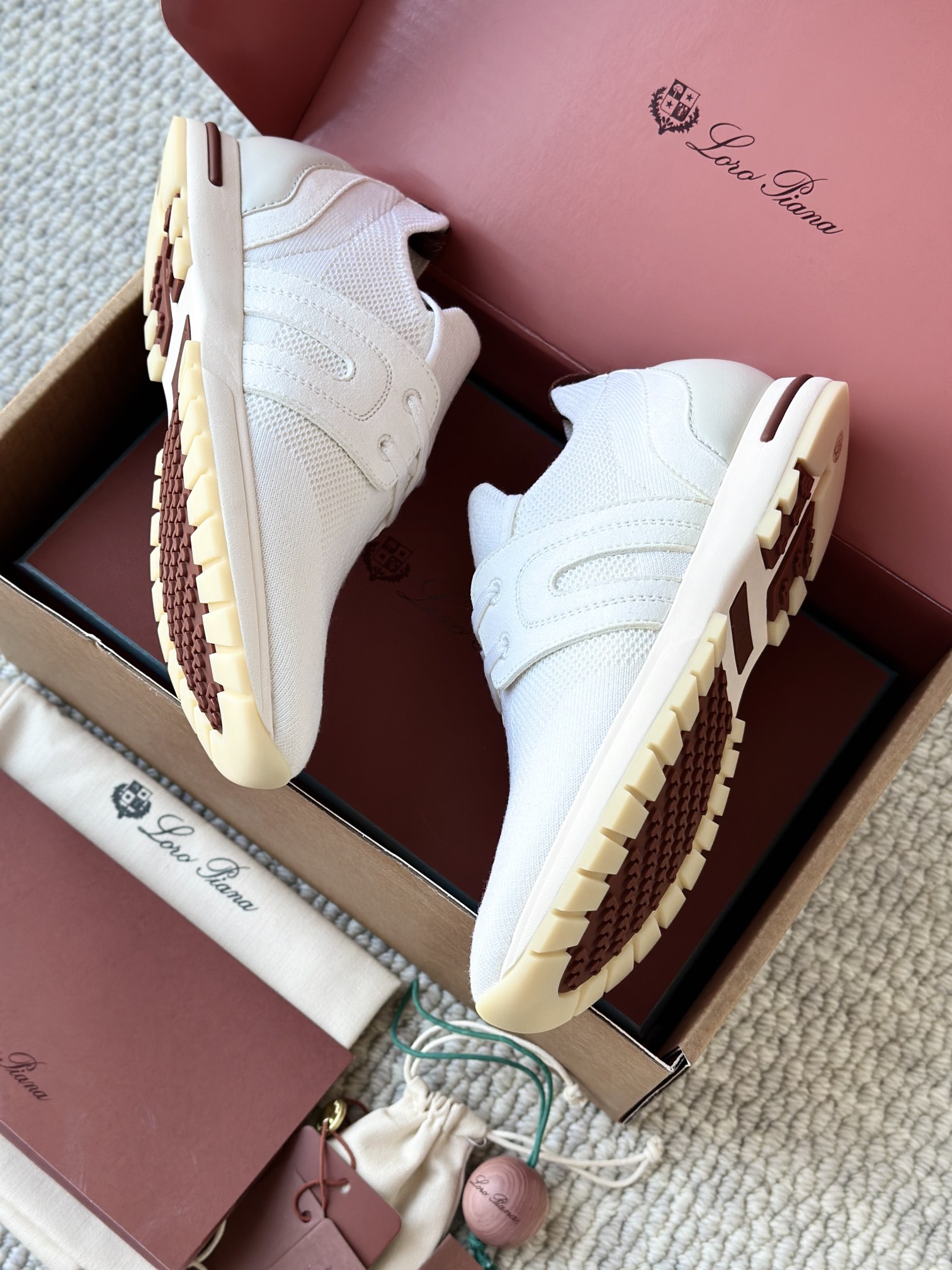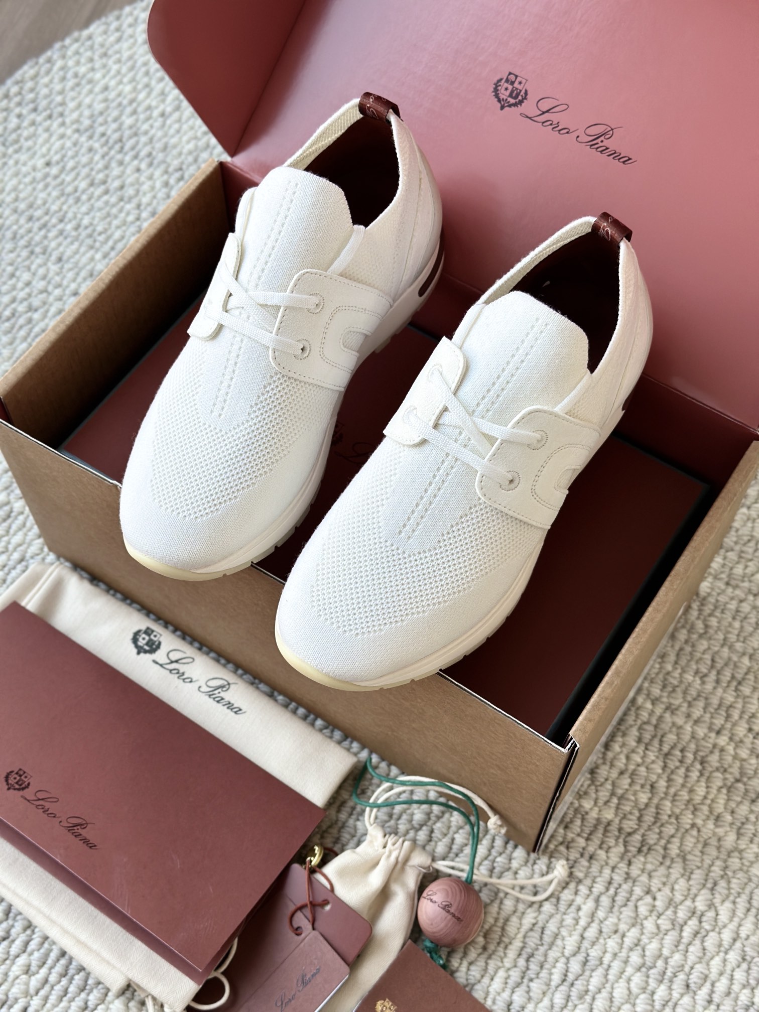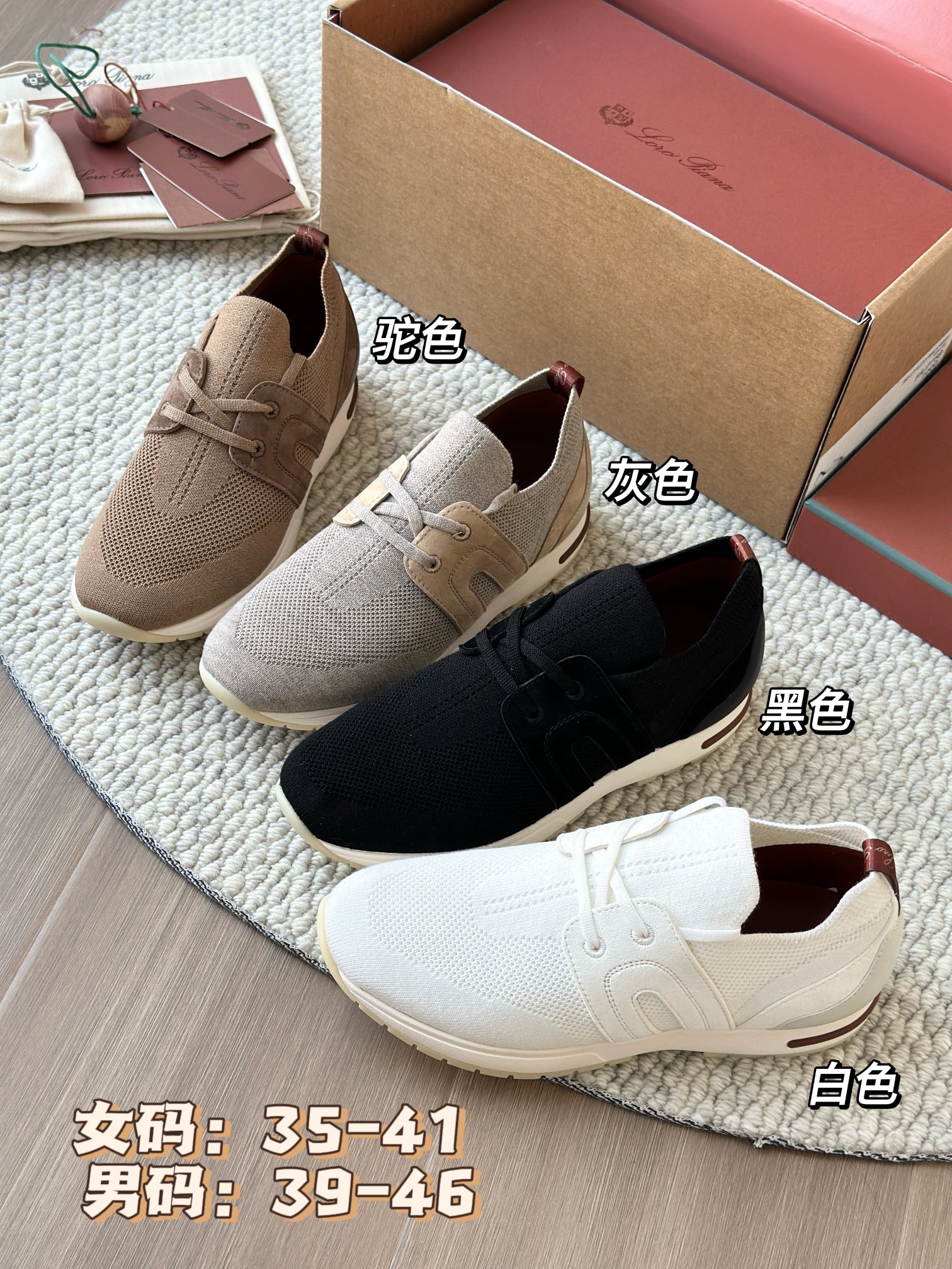 🔸鞋面像毛衣一样在织布机上制成,随后配以轻便鞋底。罗纹松紧带鞋口搭配 Kummel 色饰边 白色鞋外底,配Kummel 色鞋底,印有Loro Piana首字母缩写重复图案Kummel 色提拉环带有Loro Piana 标识