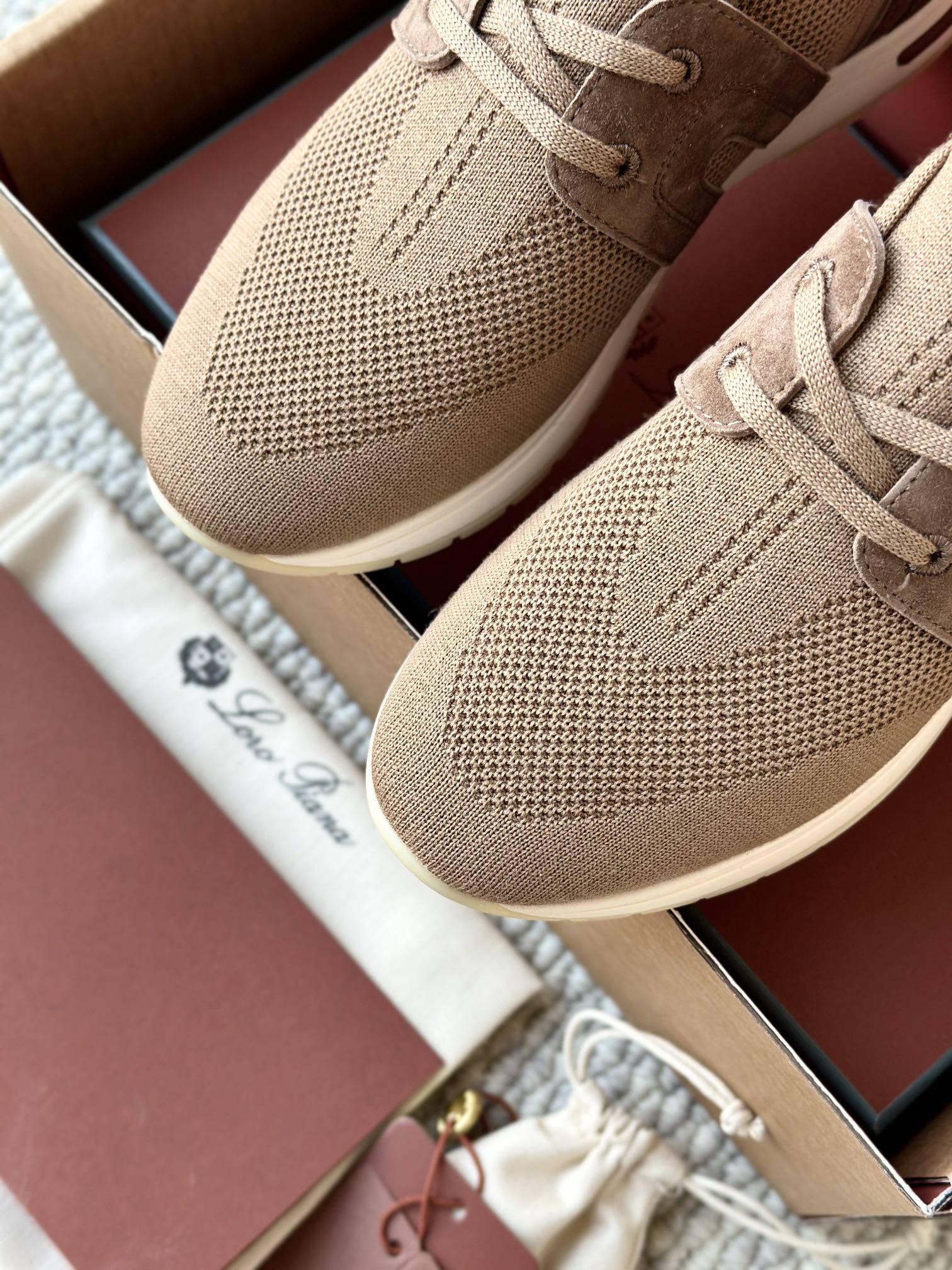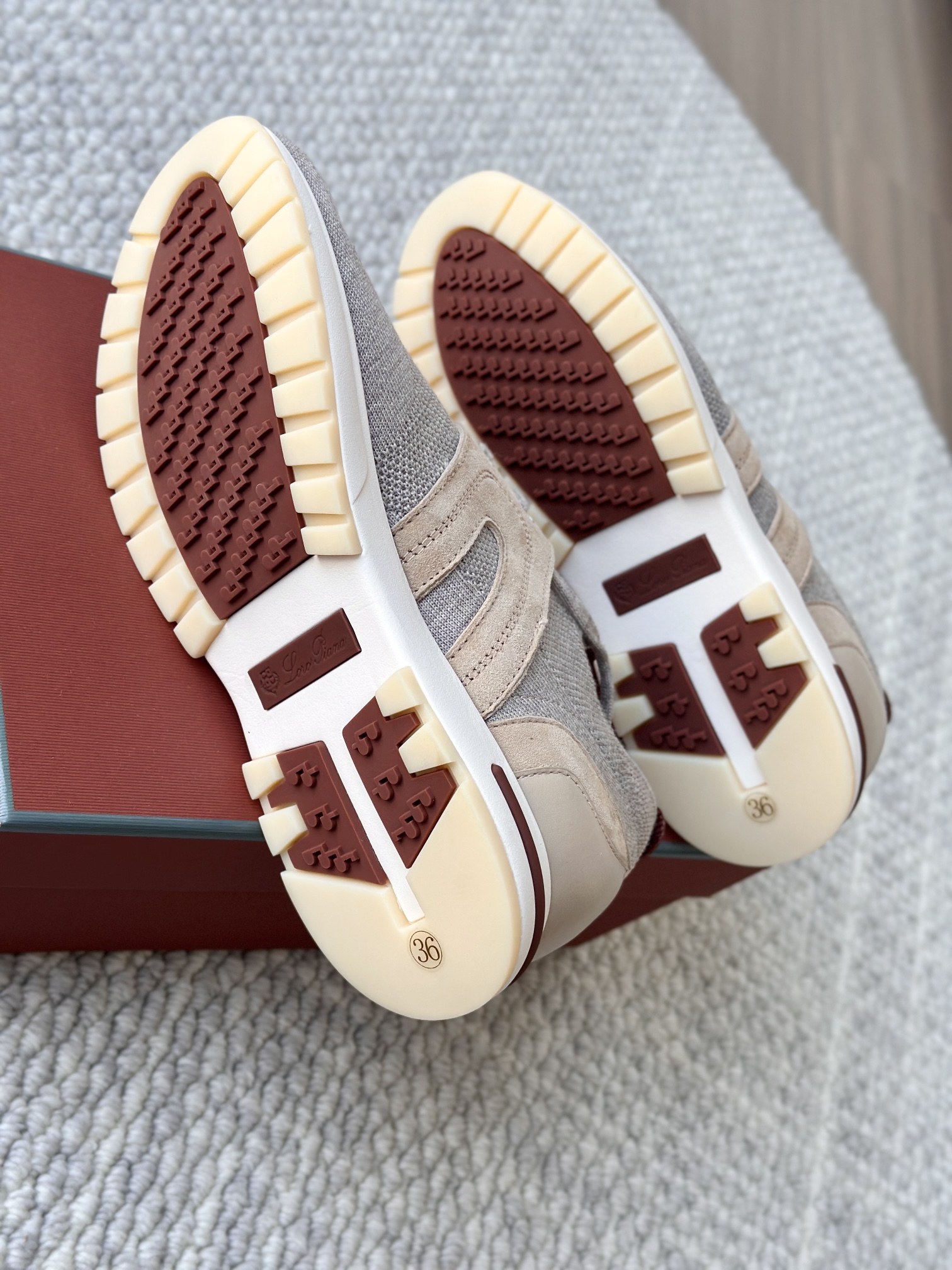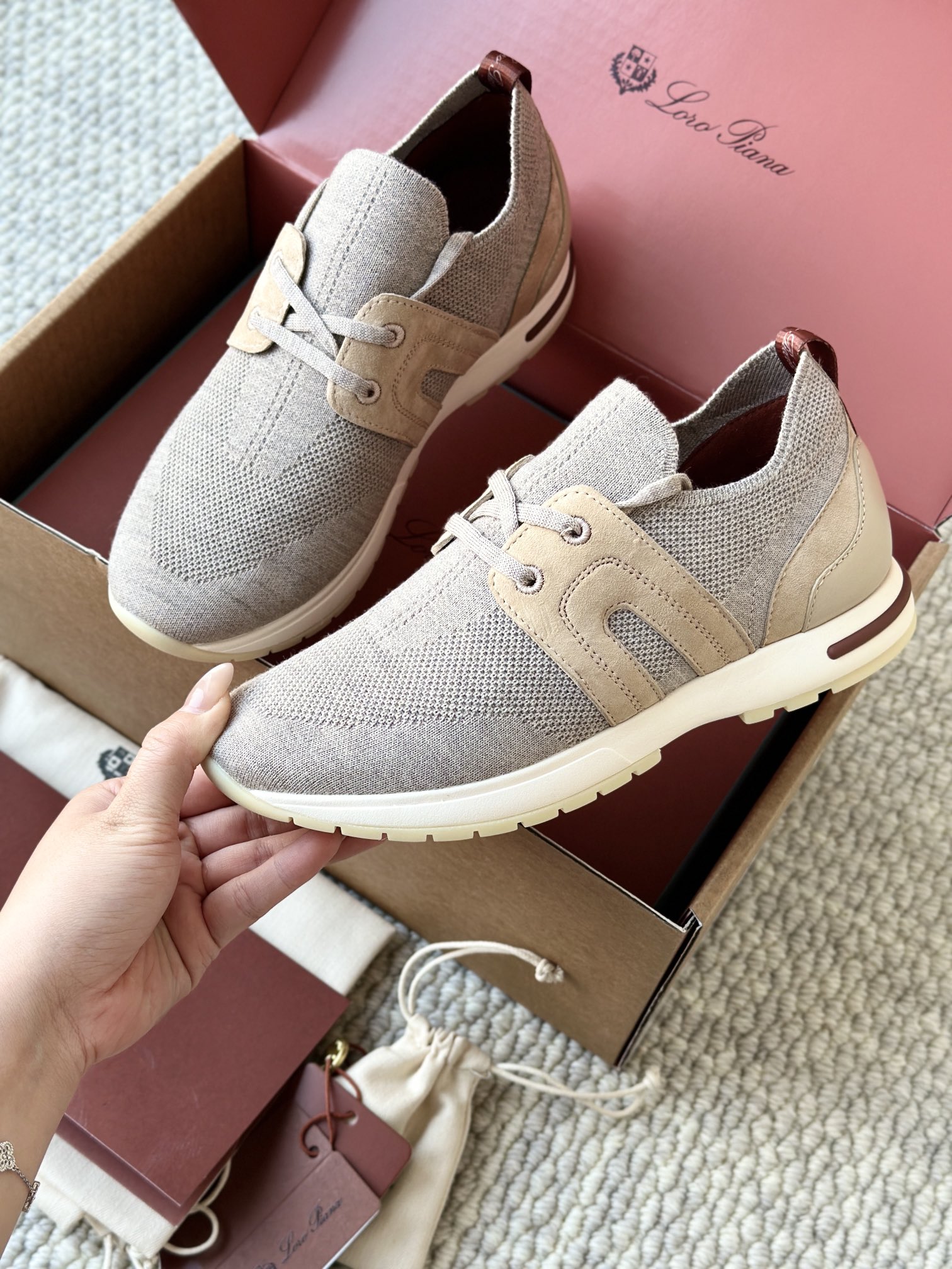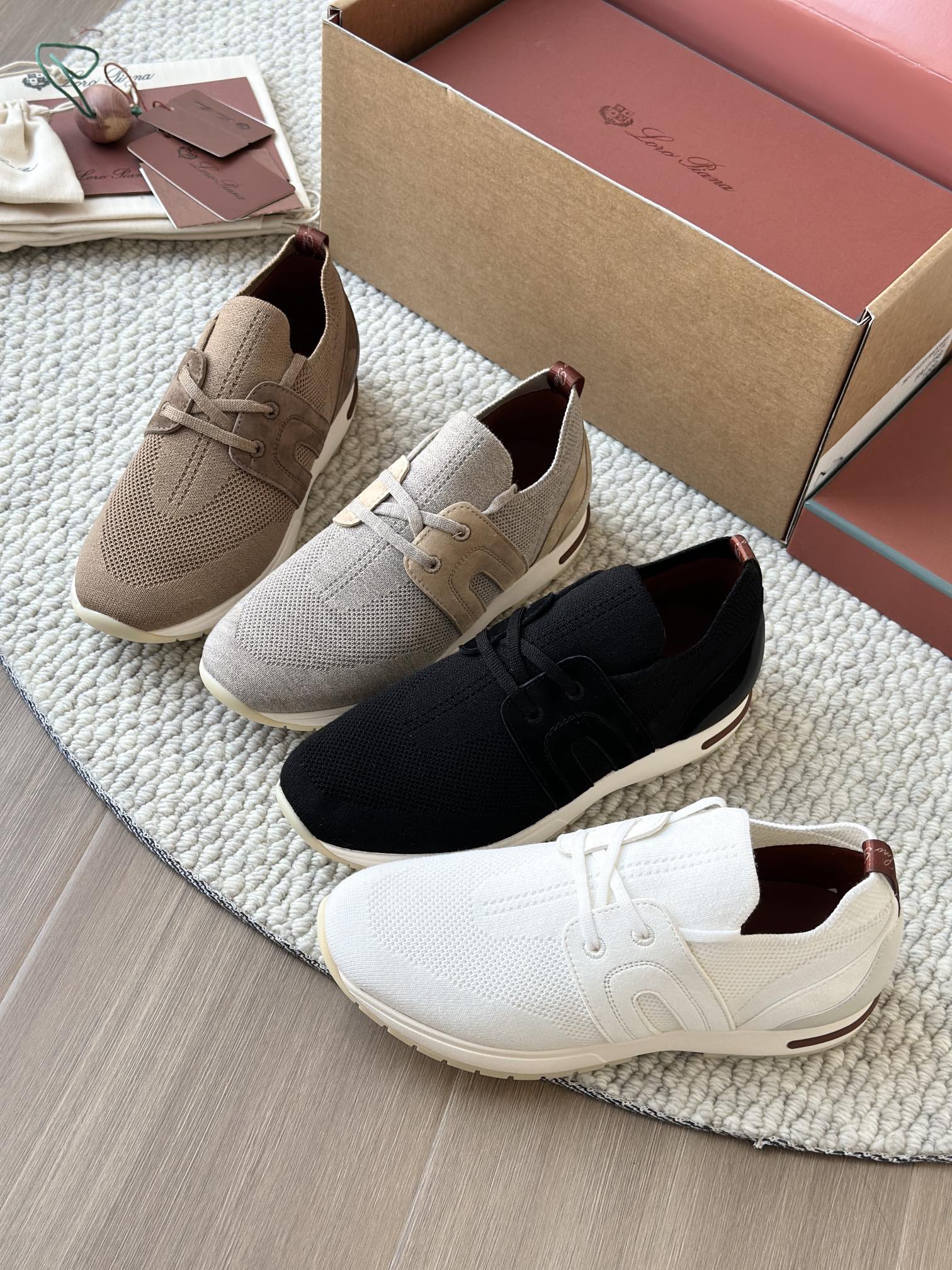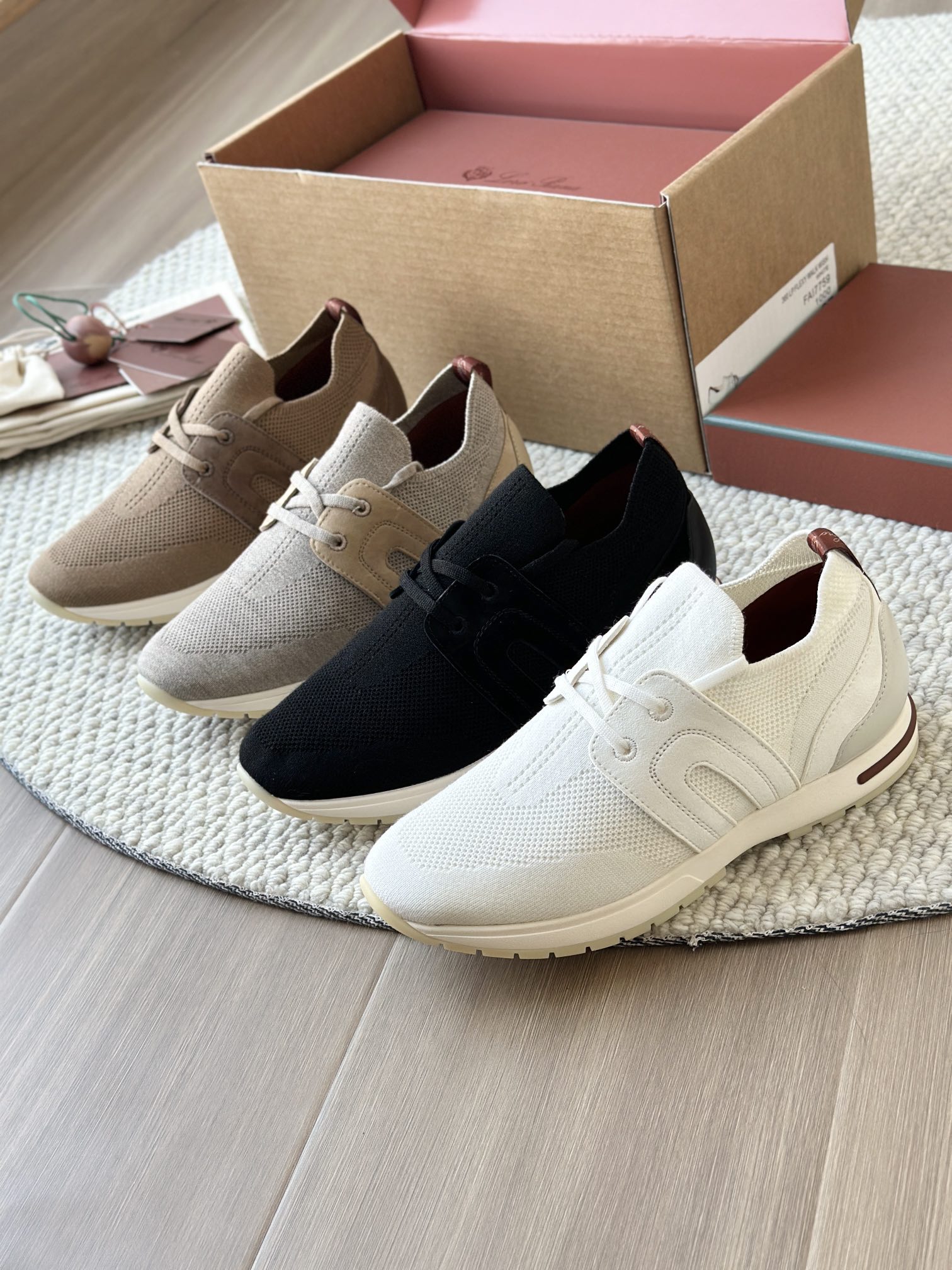 🔸鞋面像毛衣一样在织布机上制成,随后配以轻便鞋底。罗纹松紧带鞋口搭配 Kummel 色饰边 白色鞋外底,配Kummel 色鞋底,印有Loro Piana首字母缩写重复图案Kummel 色提拉环带有Loro Piana 标识