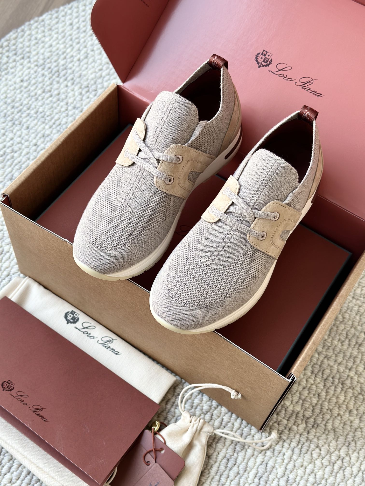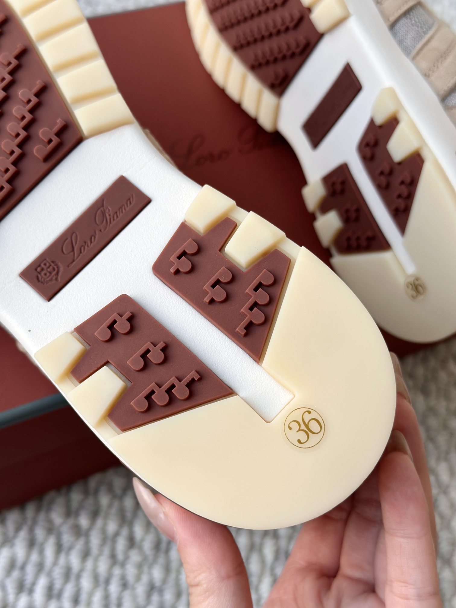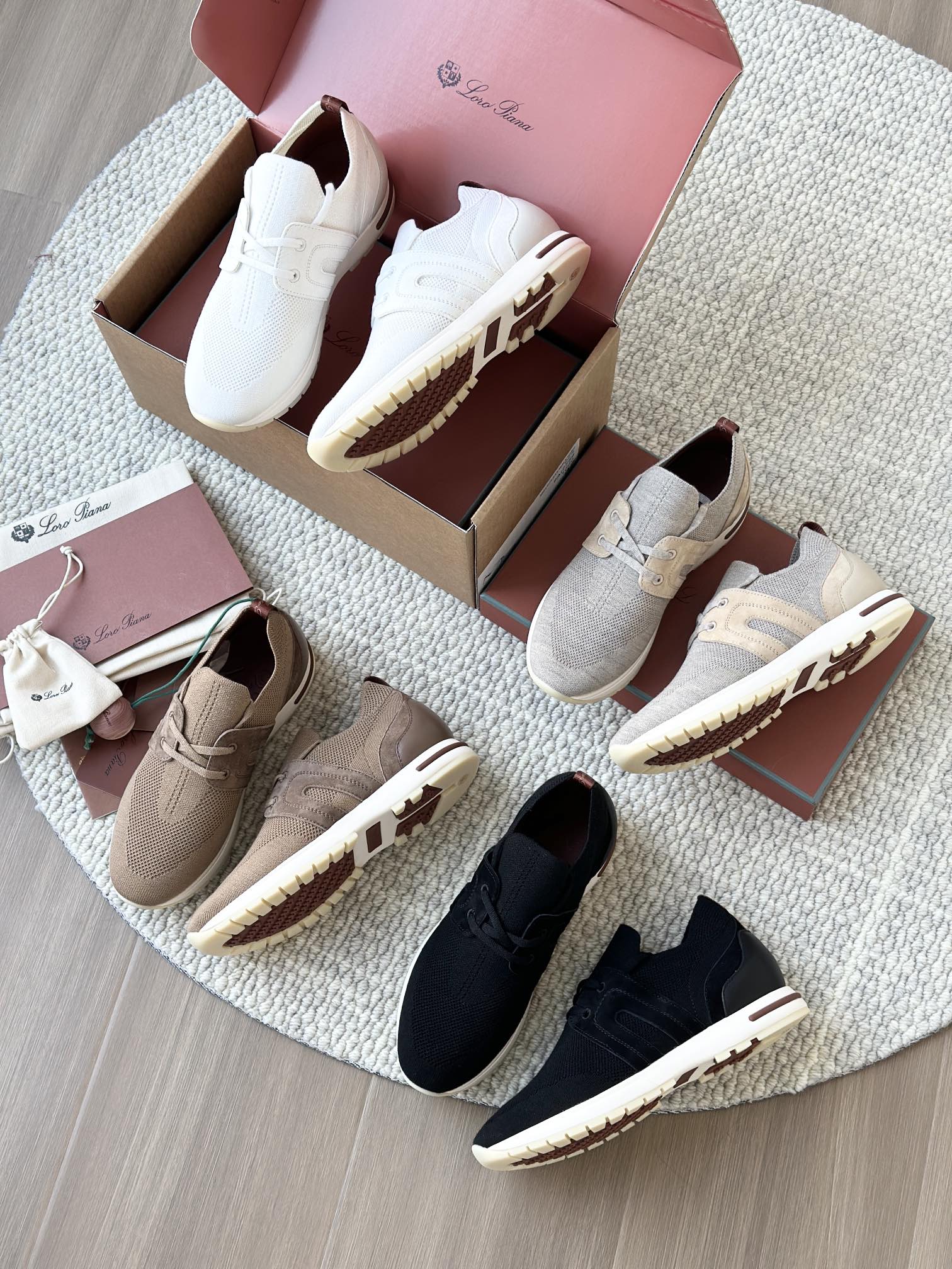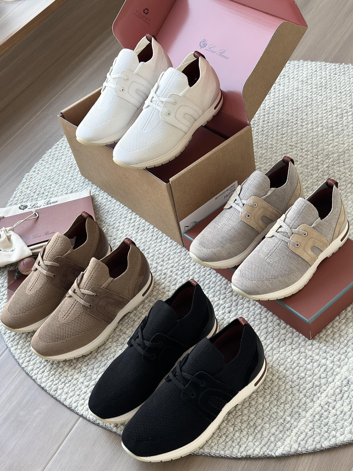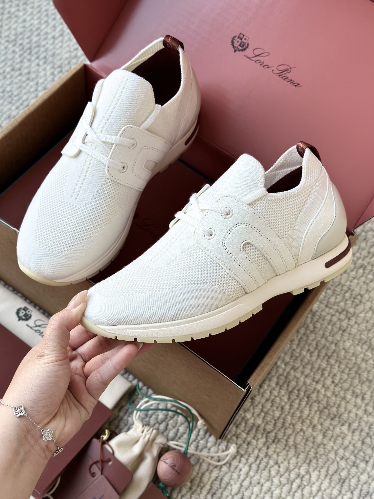 🔸鞋面像毛衣一样在织布机上制成,随后配以轻便鞋底。罗纹松紧带鞋口搭配 Kummel 色饰边 白色鞋外底,配Kummel 色鞋底,印有Loro Piana首字母缩写重复图案Kummel 色提拉环带有Loro Piana 标识