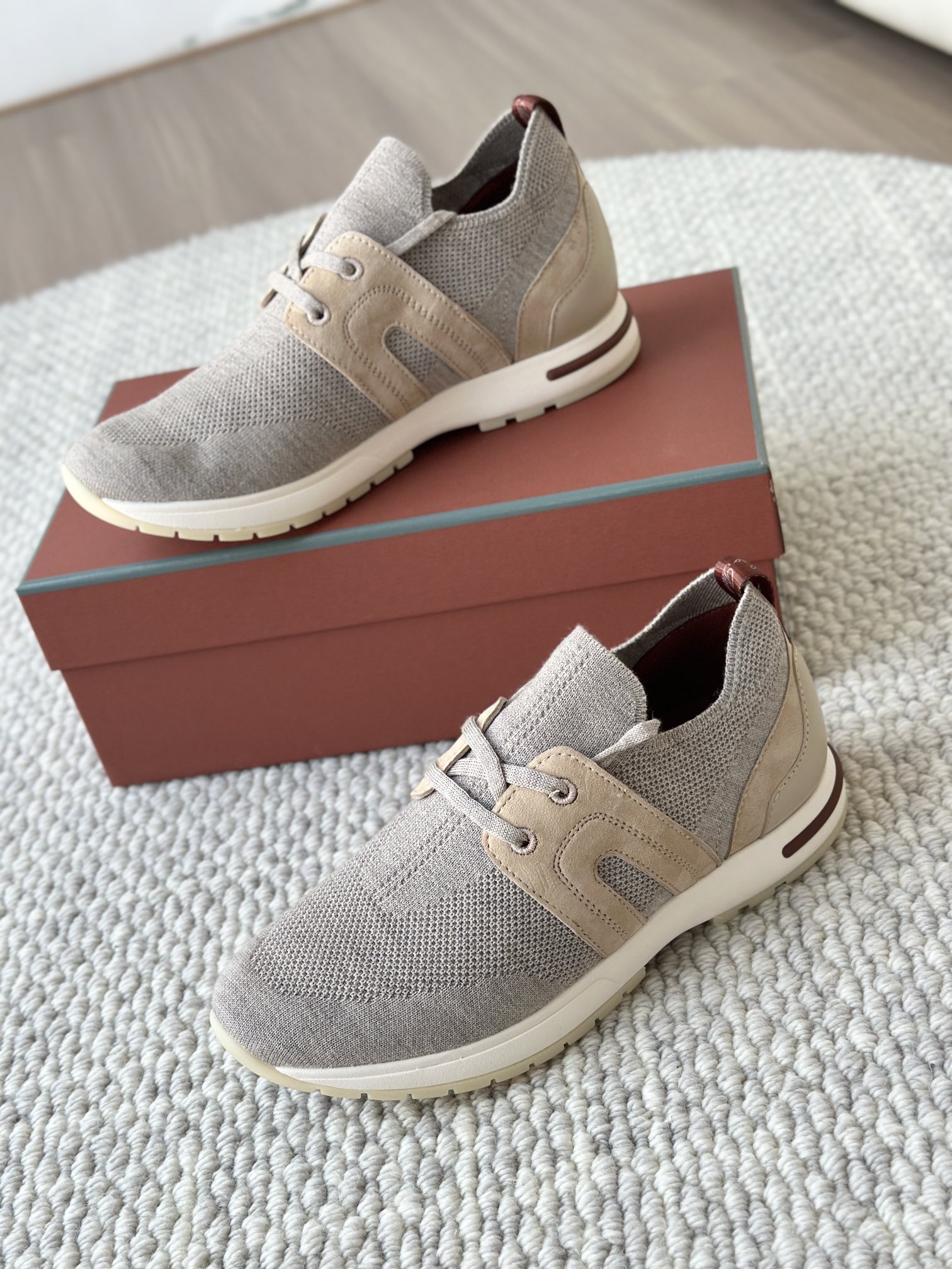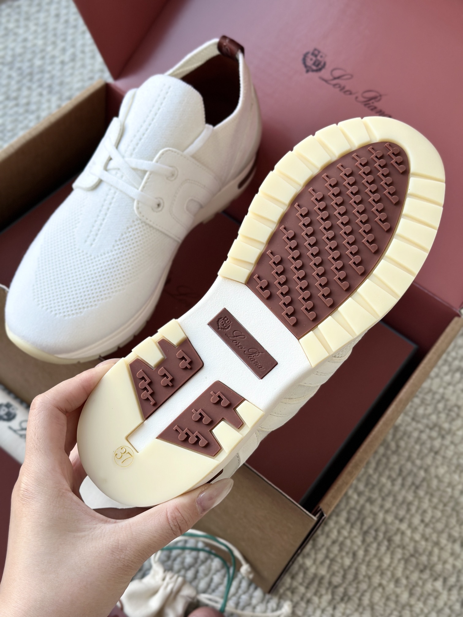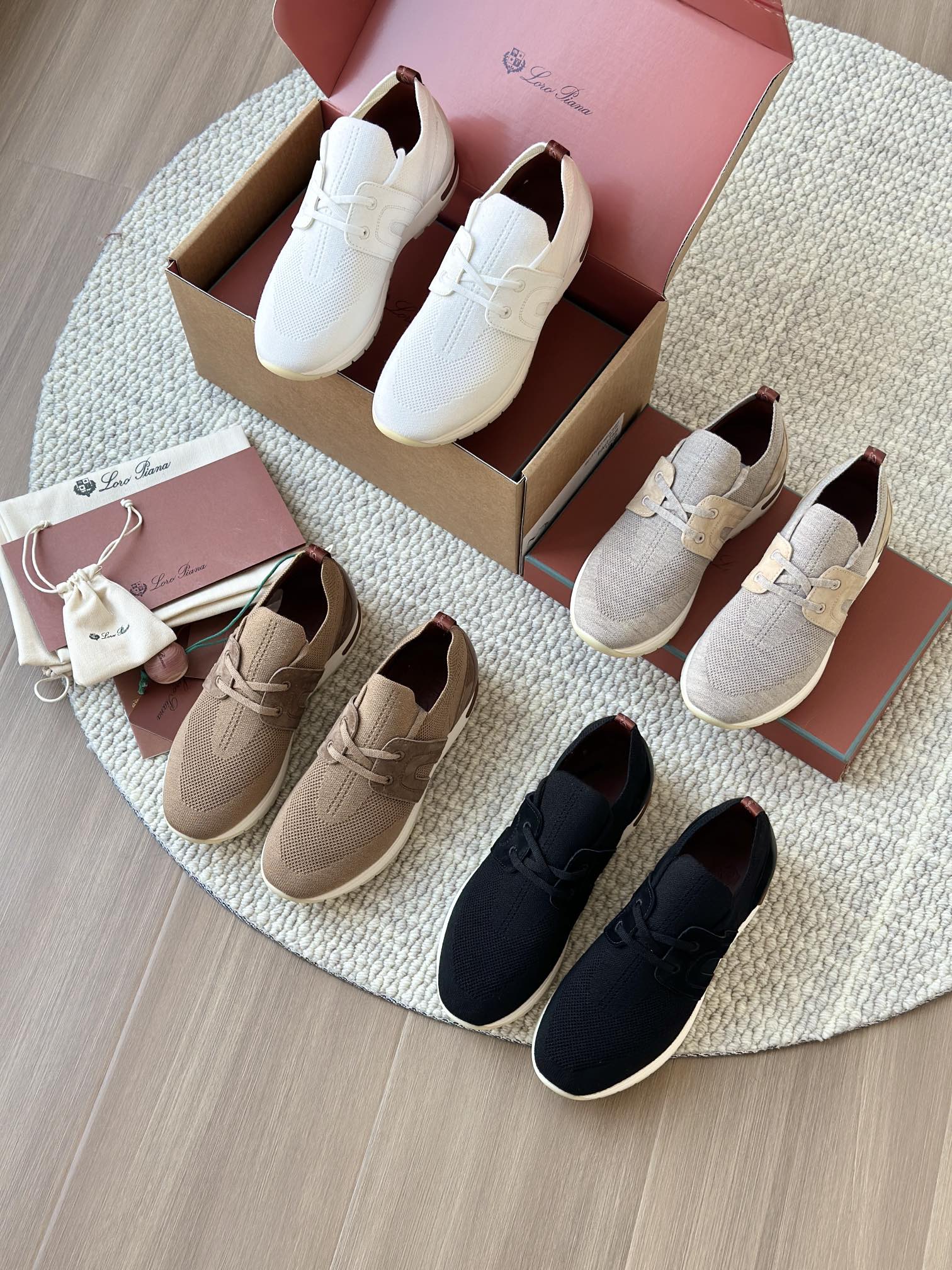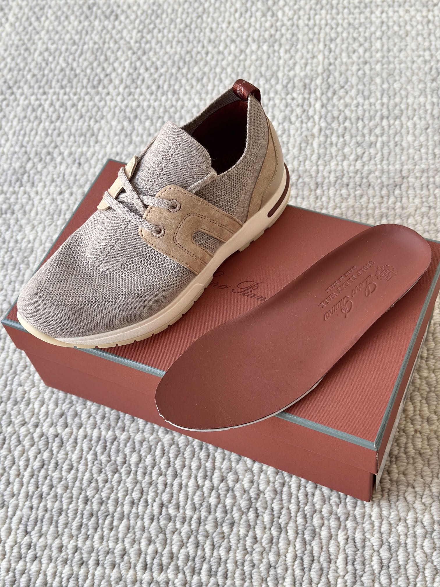 🔸鞋面像毛衣一样在织布机上制成,随后配以轻便鞋底。罗纹松紧带鞋口搭配 Kummel 色饰边 白色鞋外底,配Kummel 色鞋底,印有Loro Piana首字母缩写重复图案Kummel 色提拉环带有Loro Piana 标识