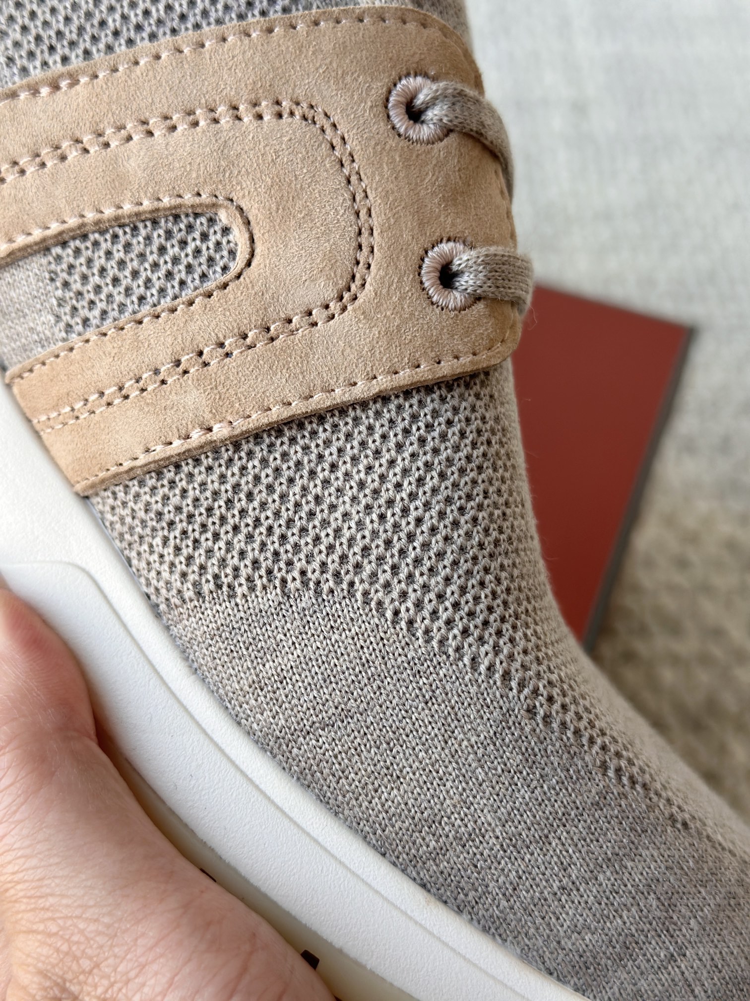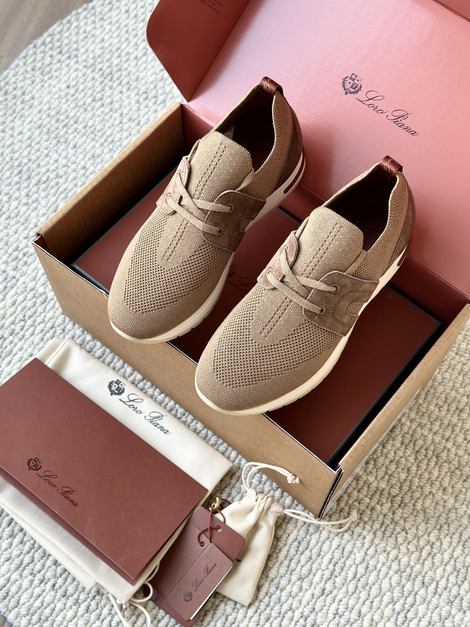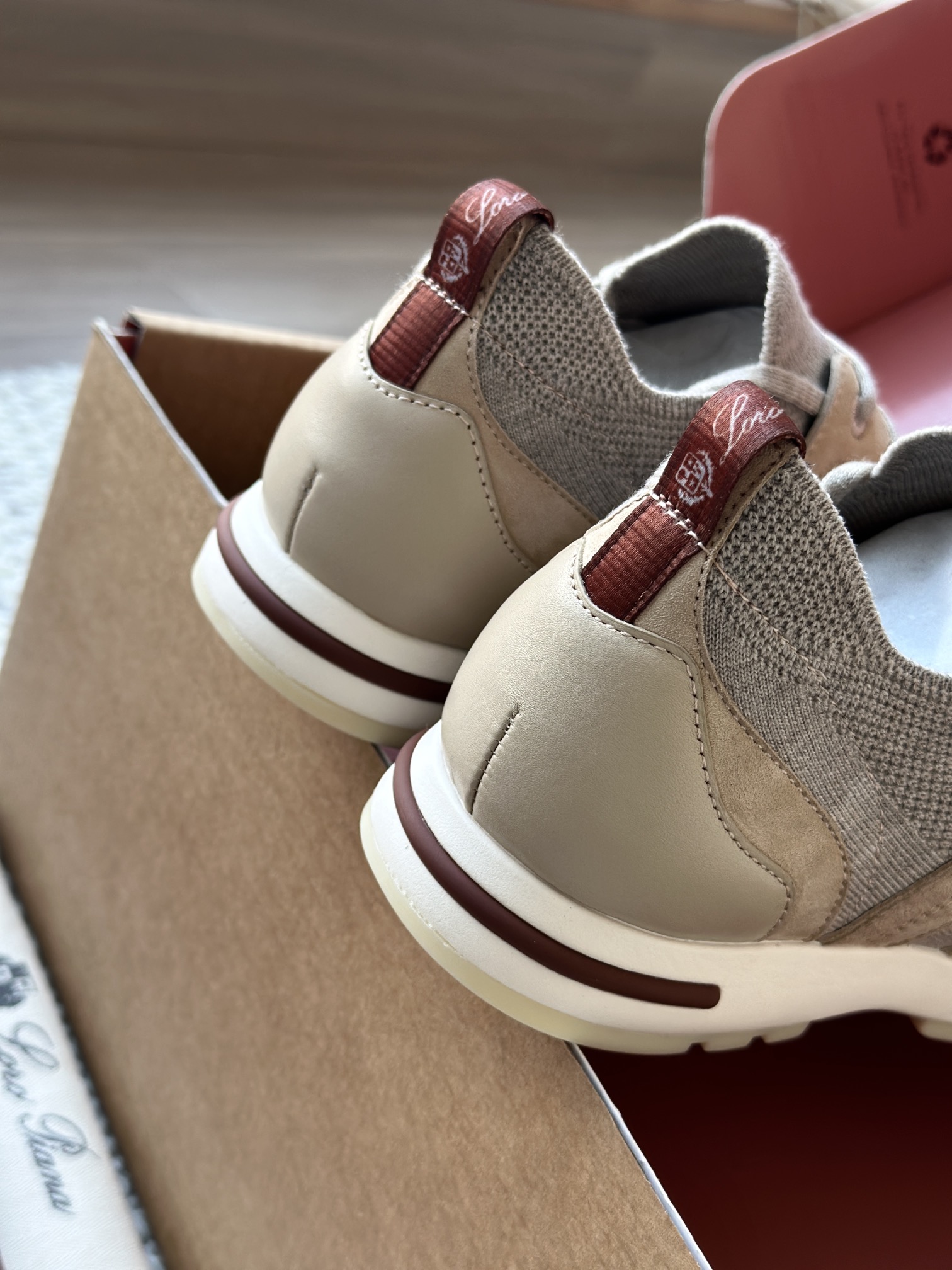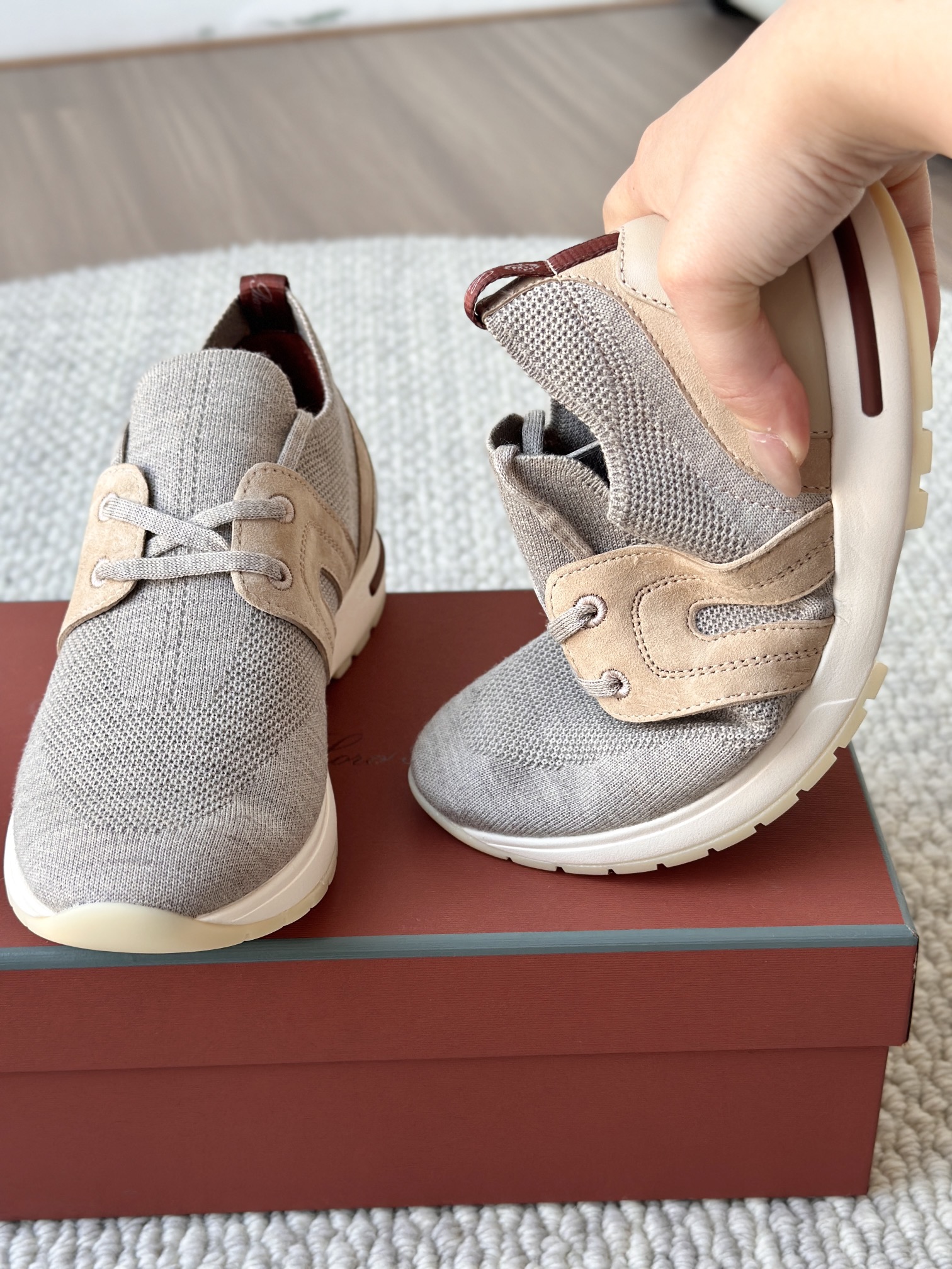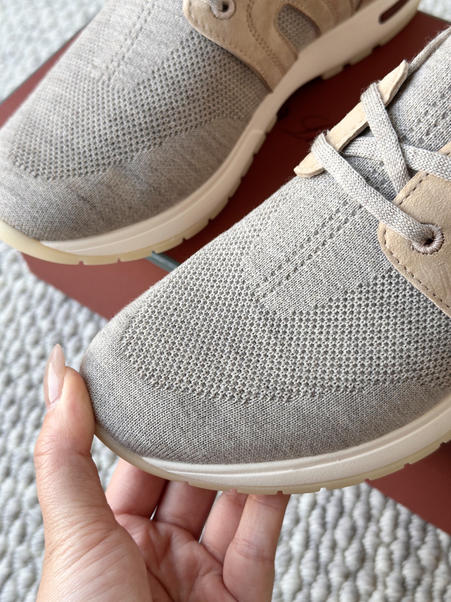 🔸鞋面像毛衣一样在织布机上制成,随后配以轻便鞋底。罗纹松紧带鞋口搭配 Kummel 色饰边 白色鞋外底,配Kummel 色鞋底,印有Loro Piana首字母缩写重复图案Kummel 色提拉环带有Loro Piana 标识