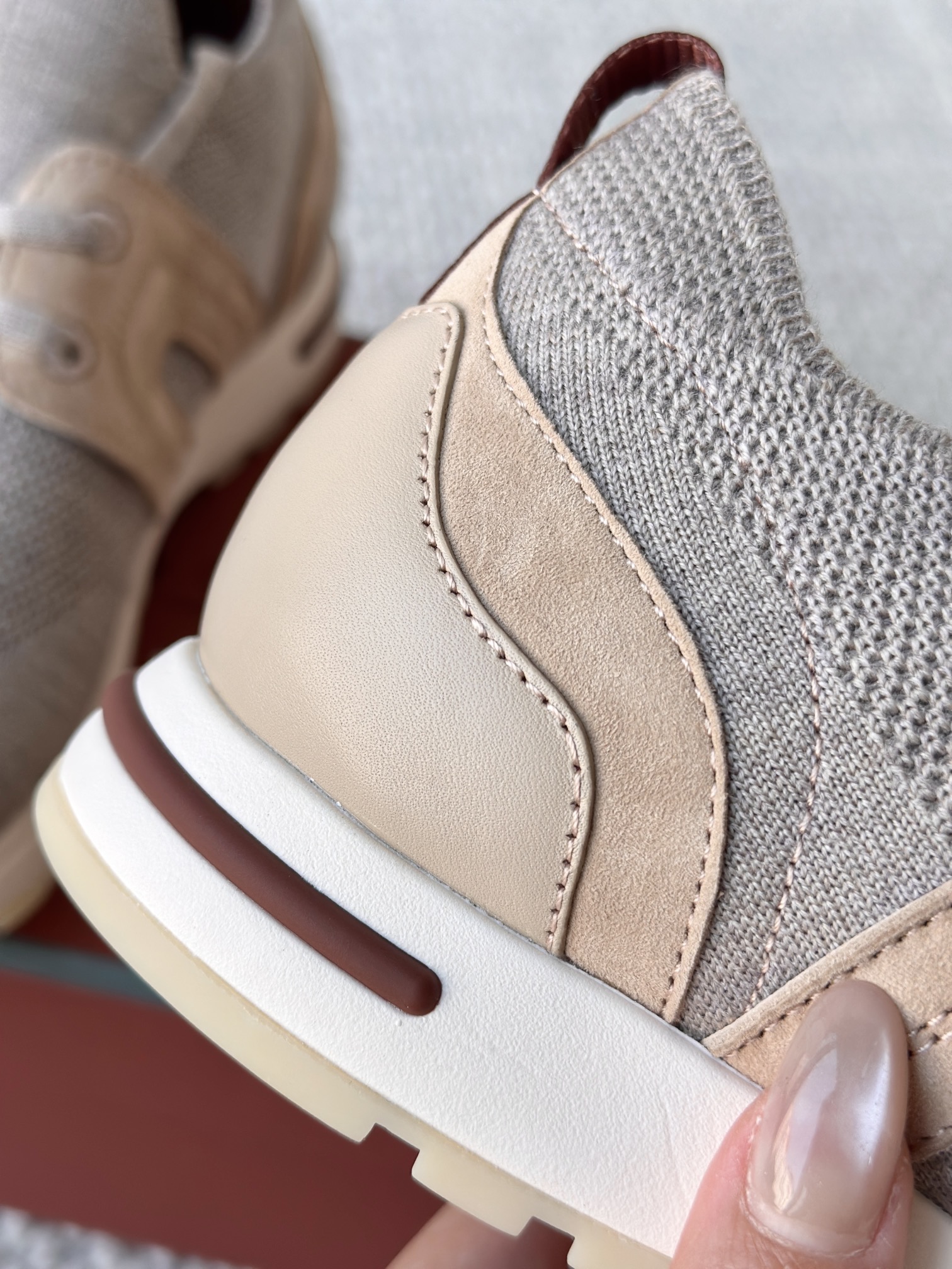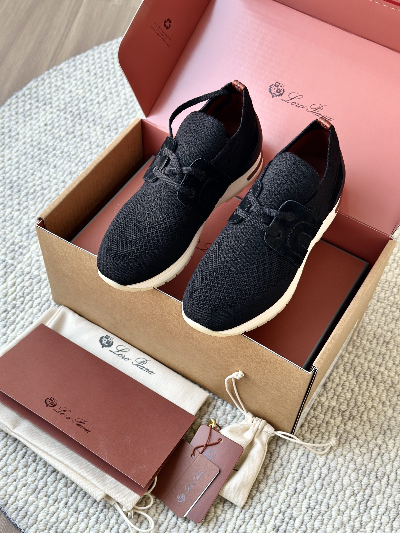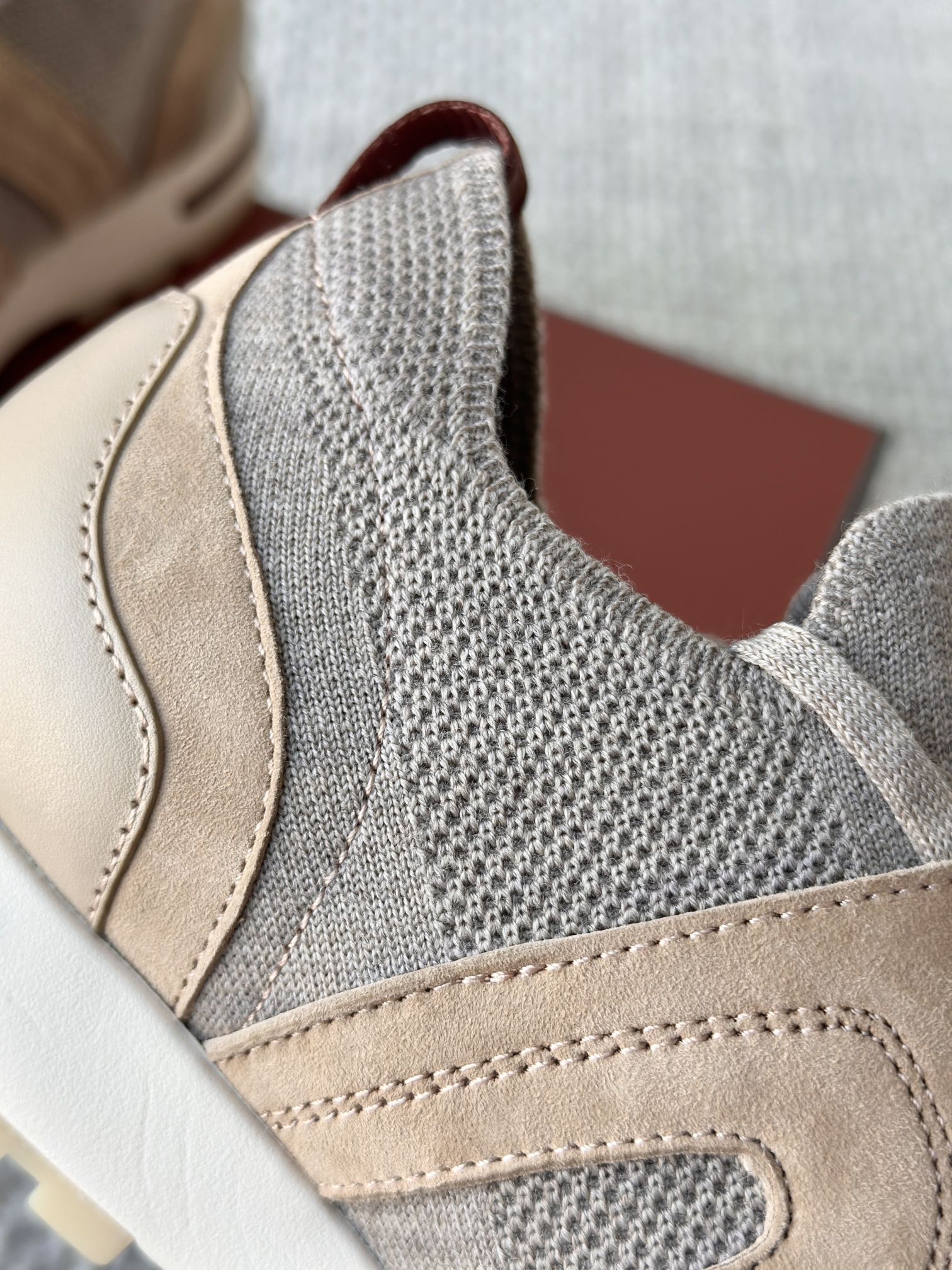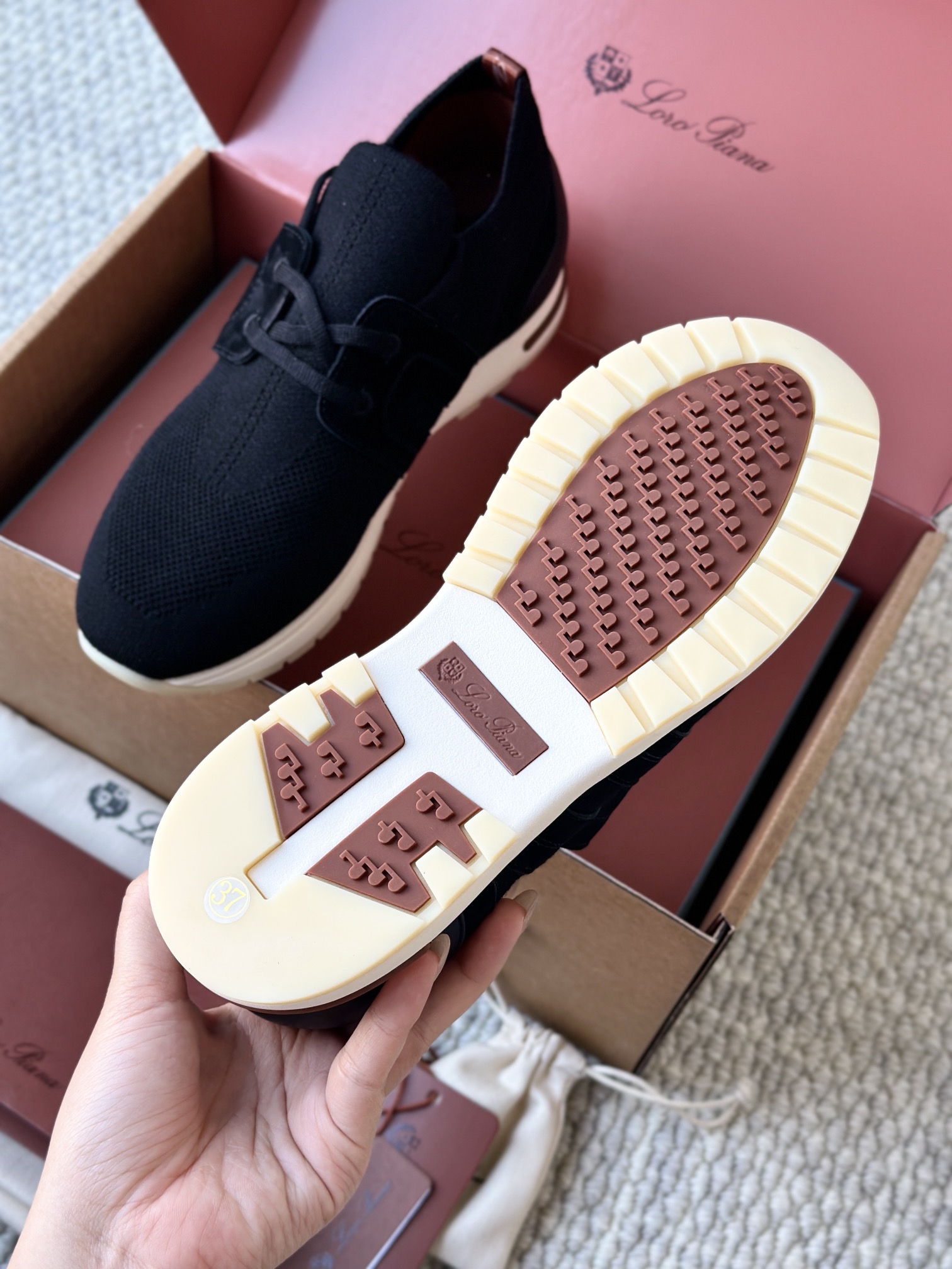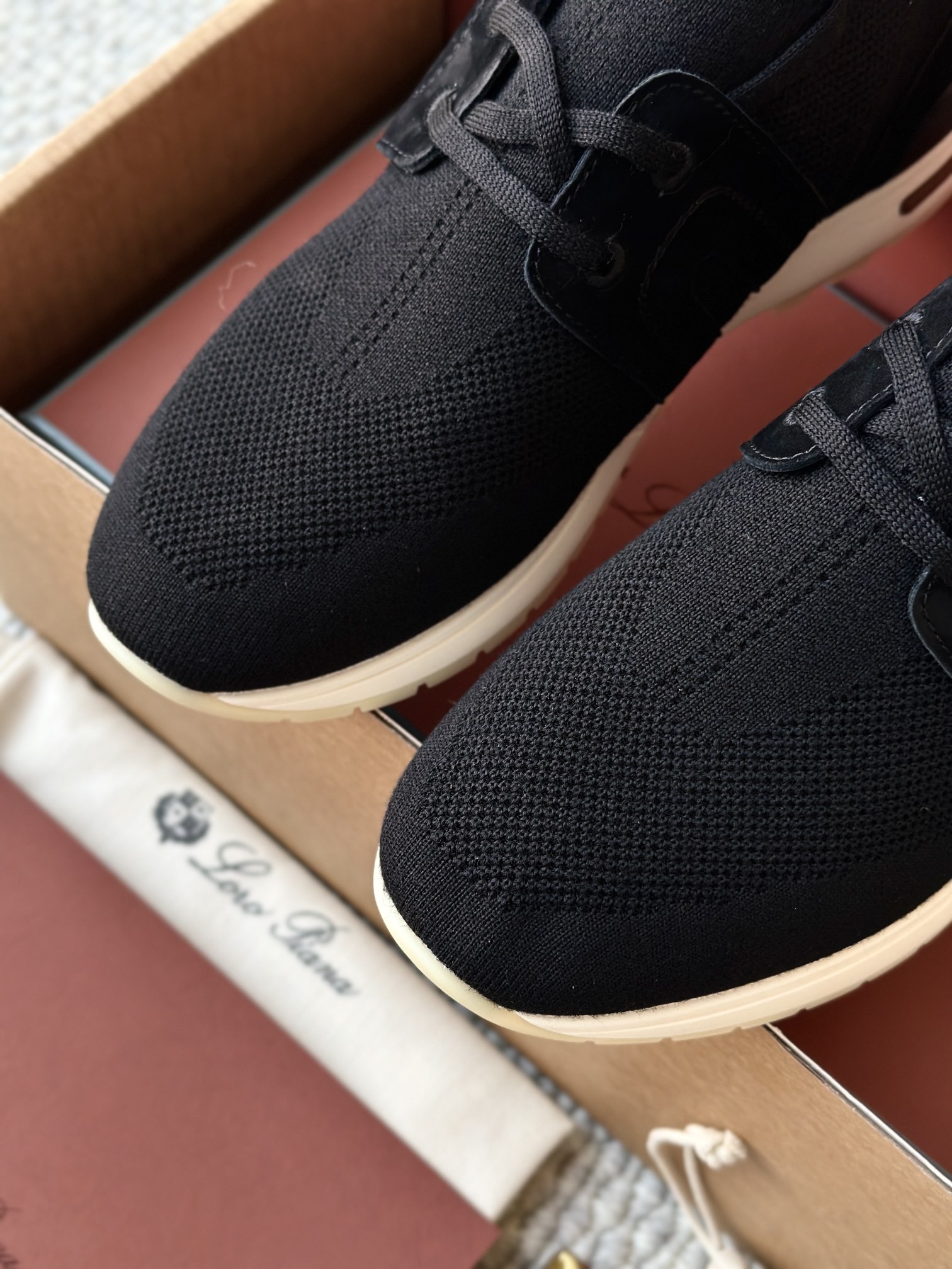 🔸鞋面像毛衣一样在织布机上制成,随后配以轻便鞋底。罗纹松紧带鞋口搭配 Kummel 色饰边 白色鞋外底,配Kummel 色鞋底,印有Loro Piana首字母缩写重复图案Kummel 色提拉环带有Loro Piana 标识