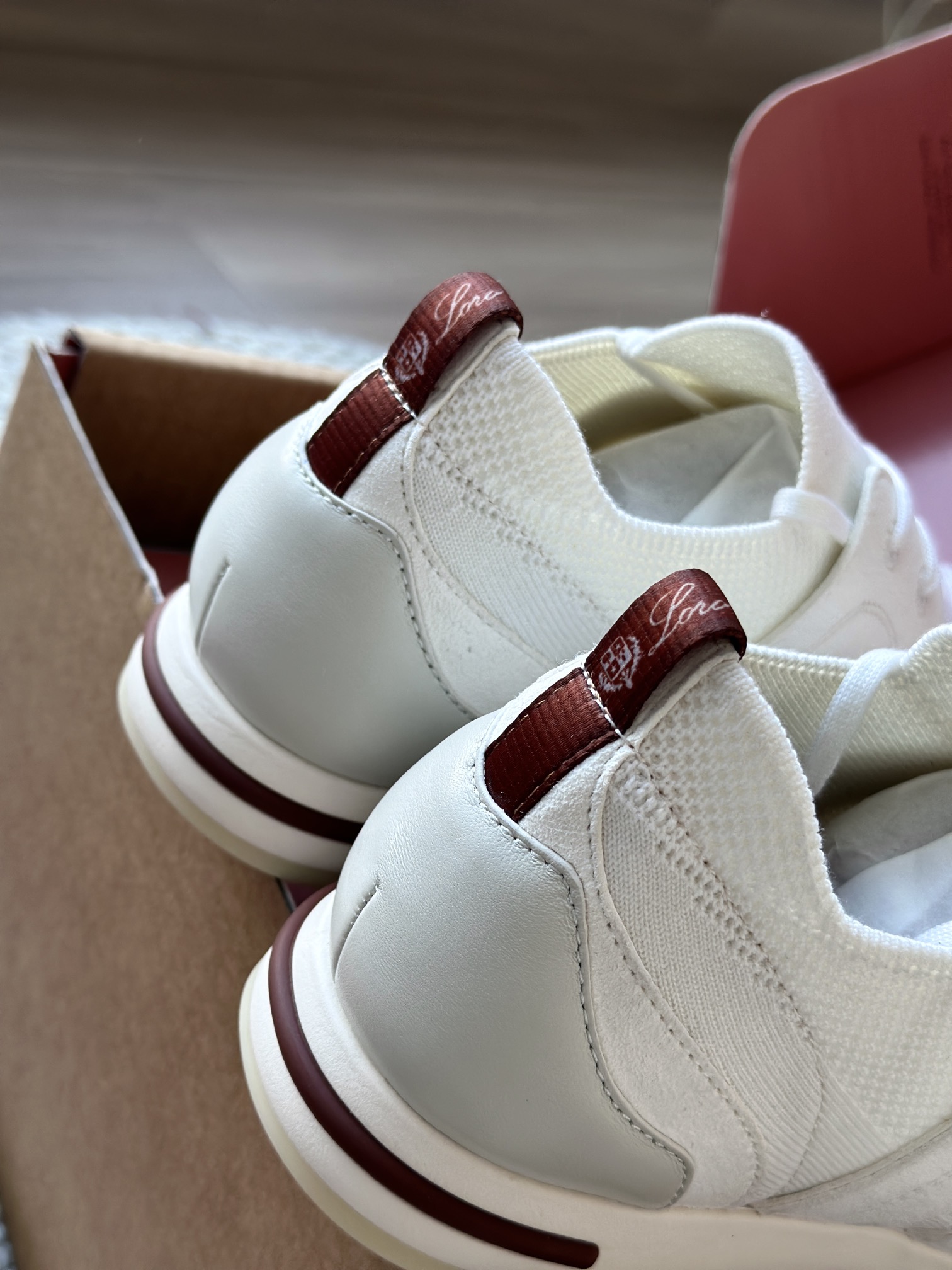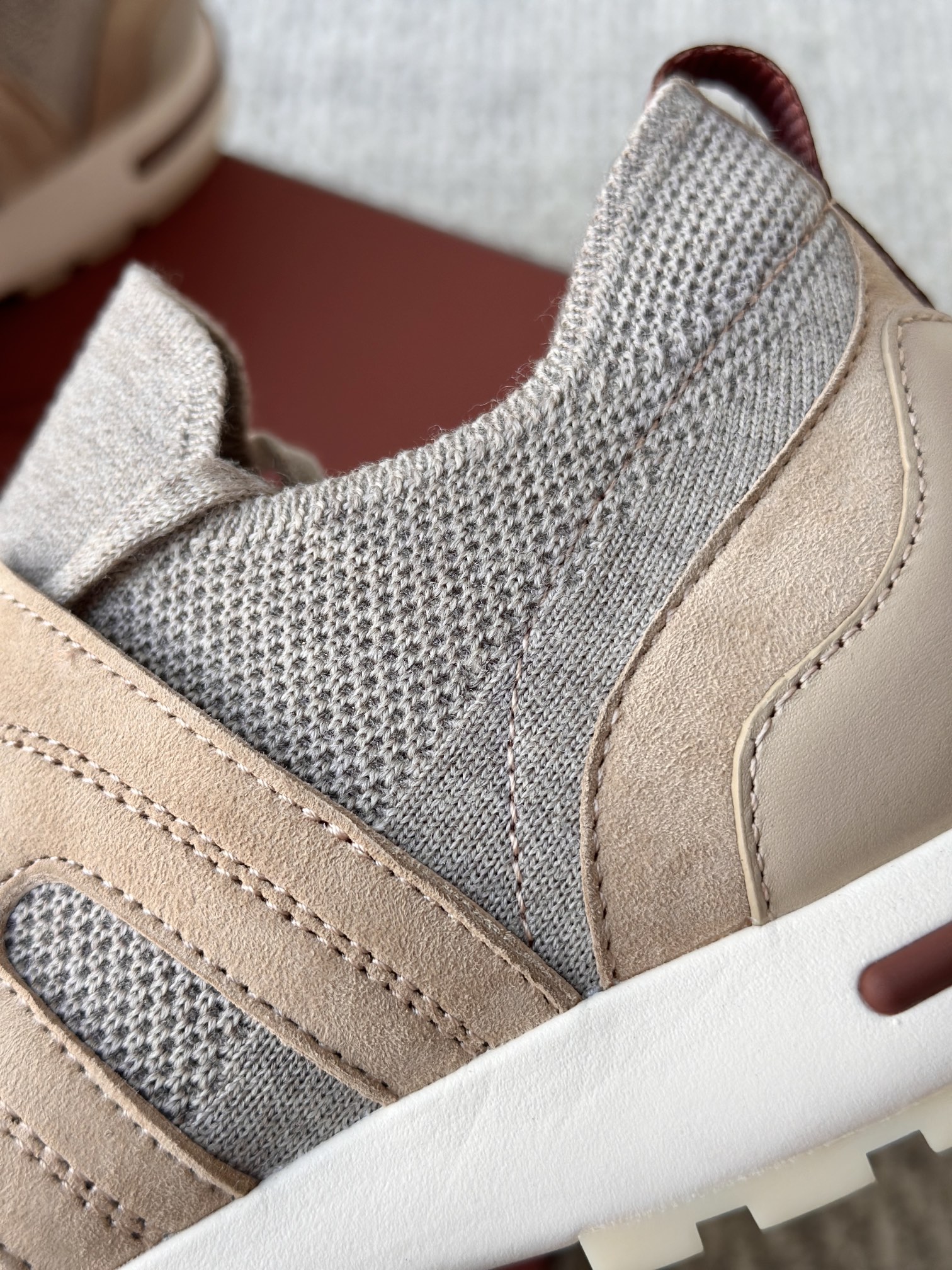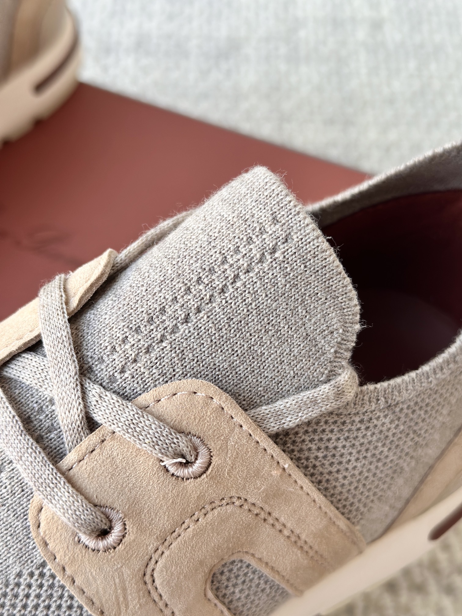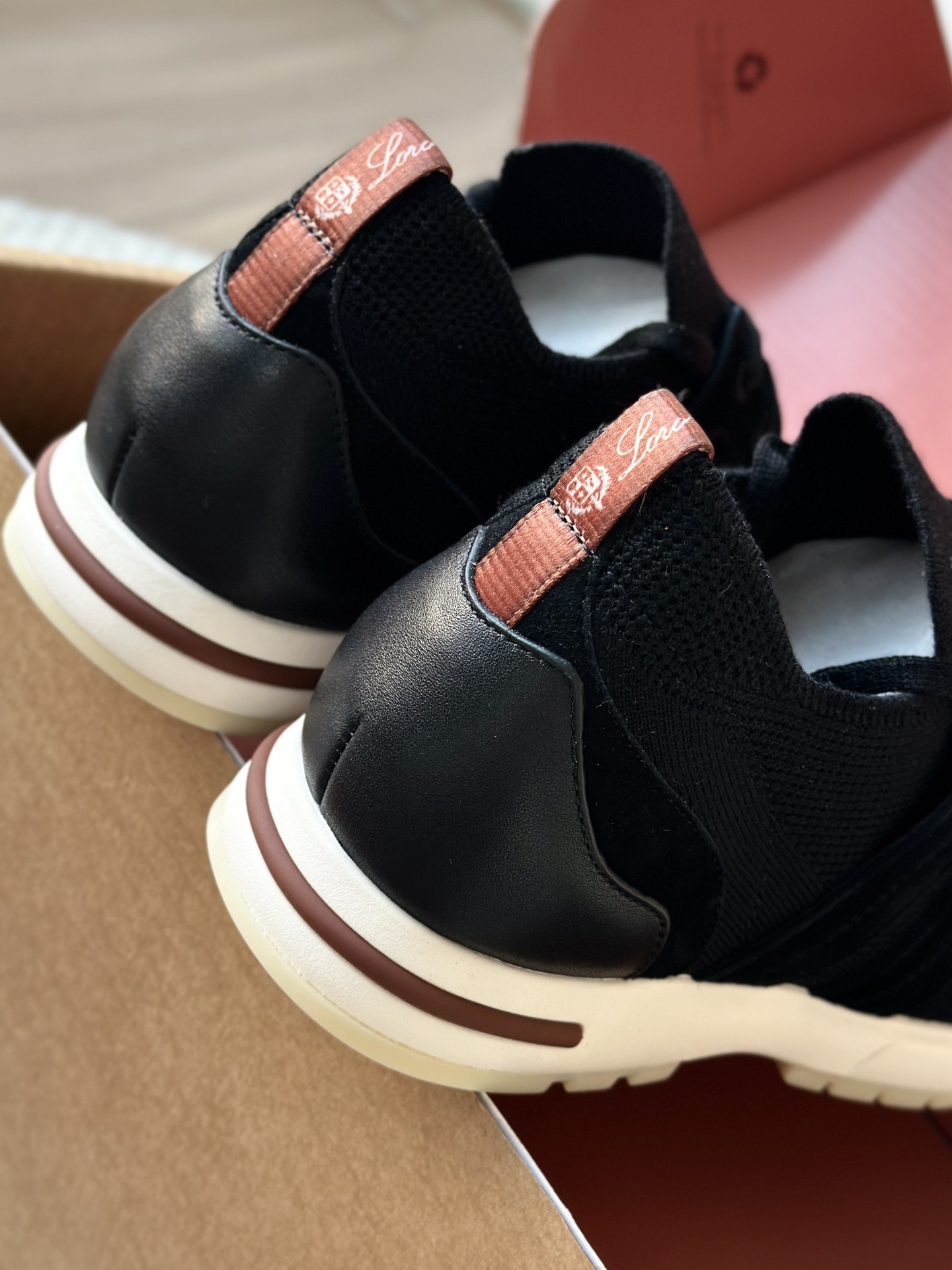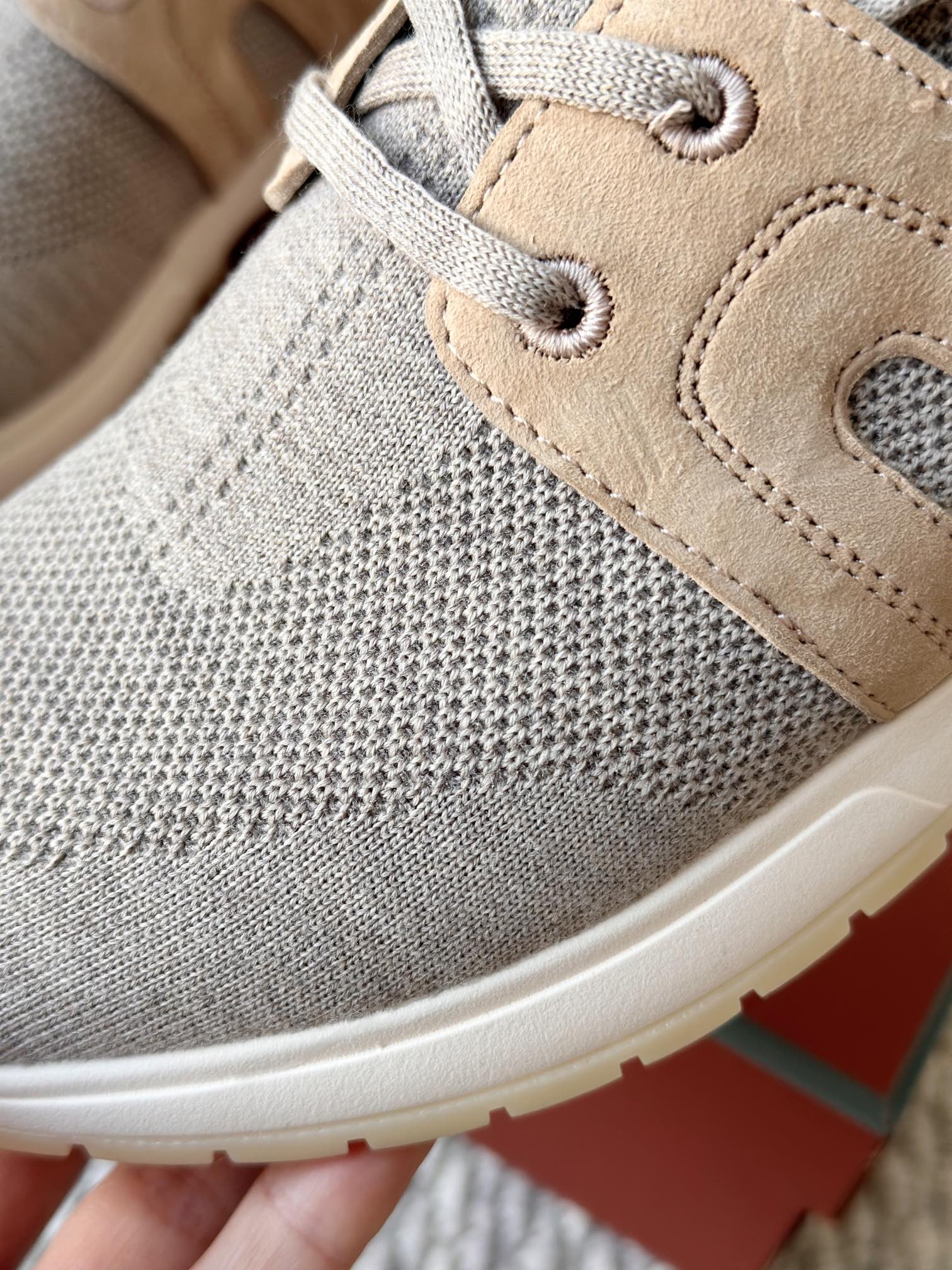 🔸鞋面像毛衣一样在织布机上制成,随后配以轻便鞋底。罗纹松紧带鞋口搭配 Kummel 色饰边 白色鞋外底,配Kummel 色鞋底,印有Loro Piana首字母缩写重复图案Kummel 色提拉环带有Loro Piana 标识