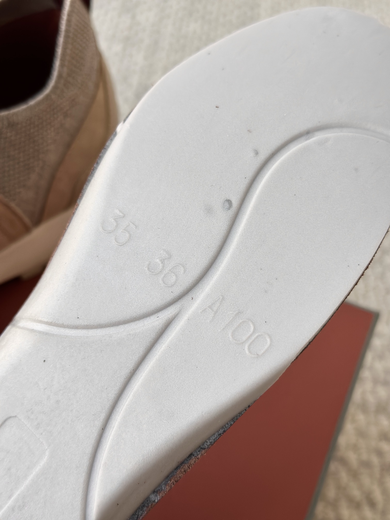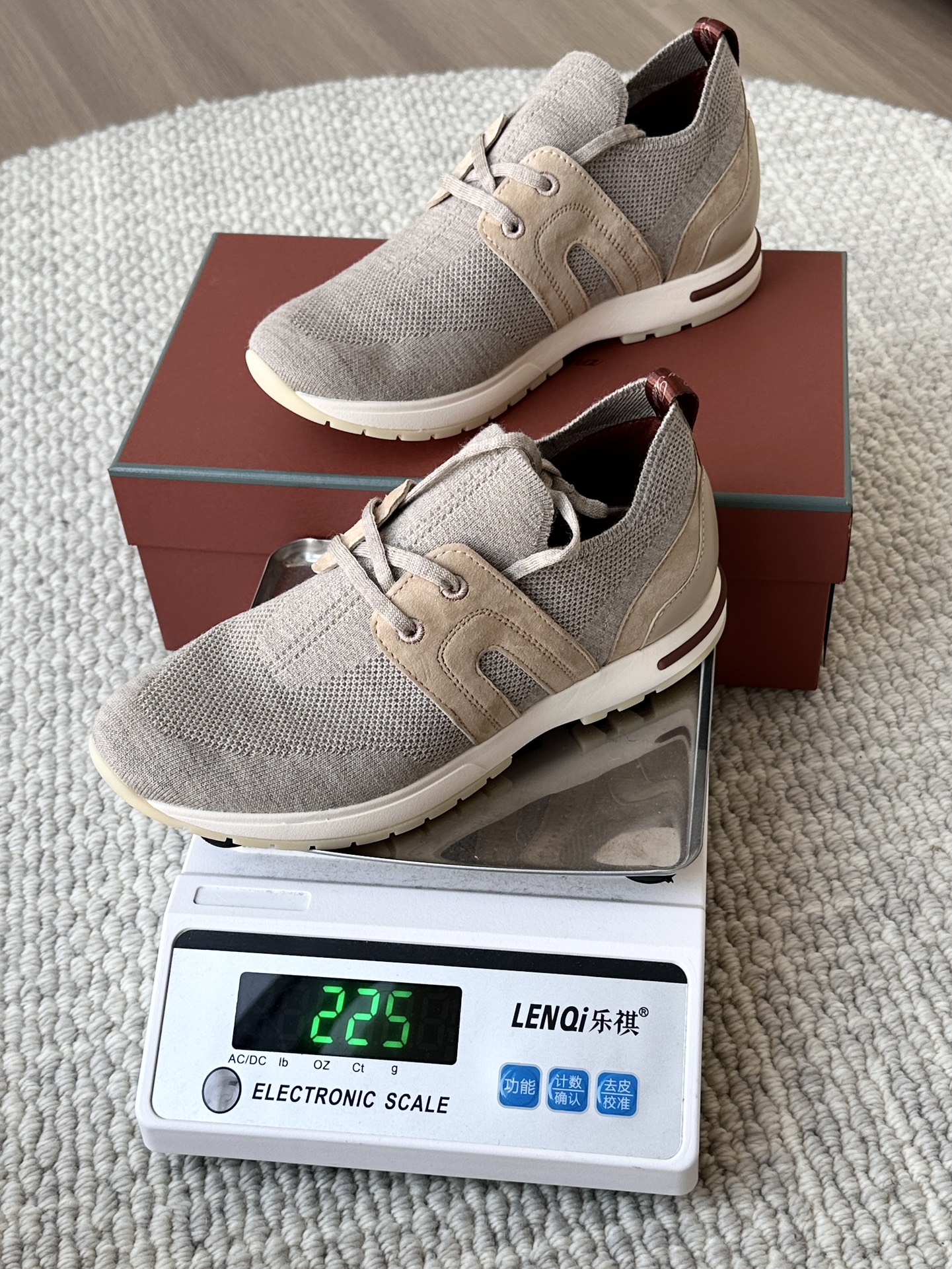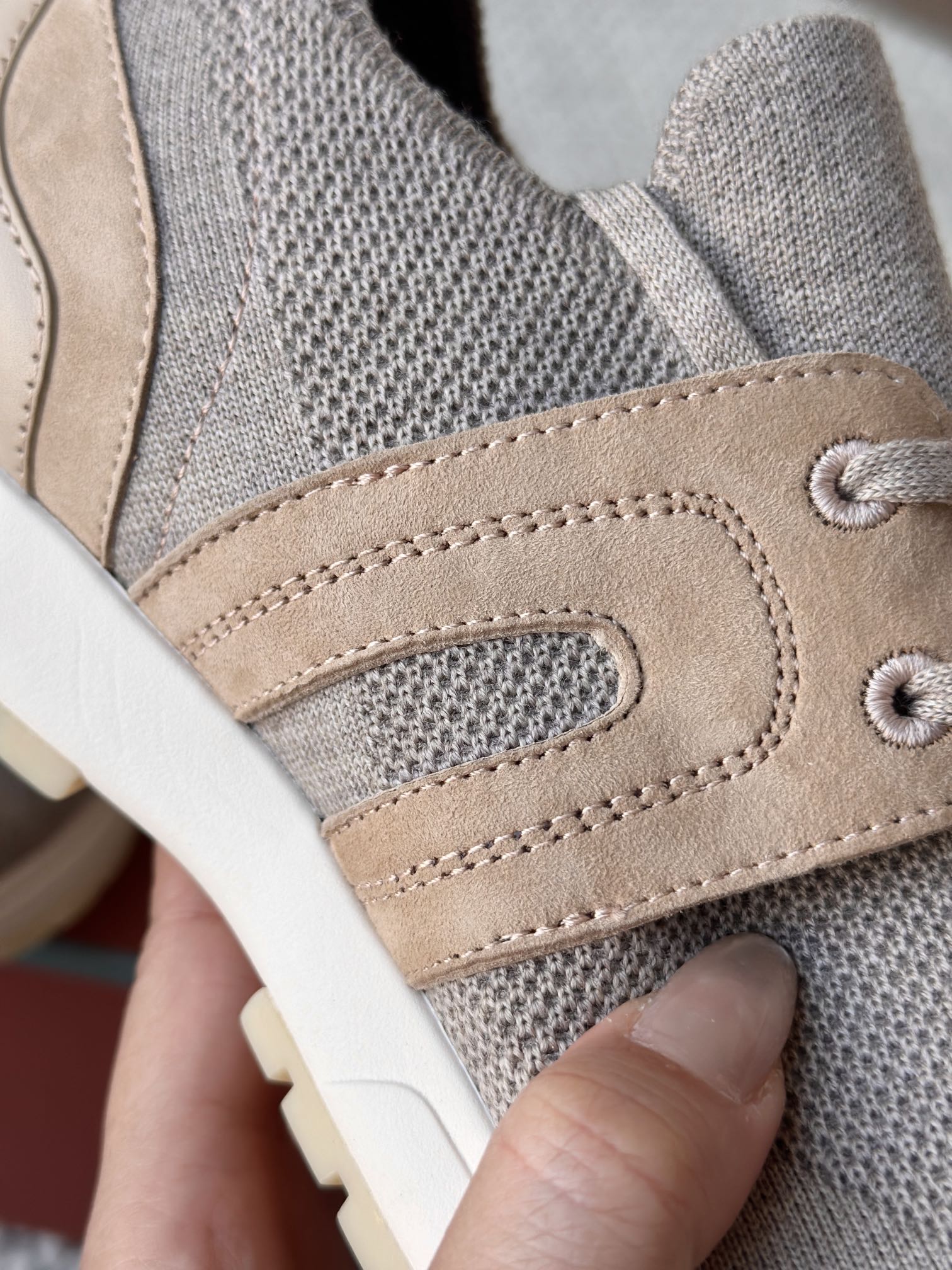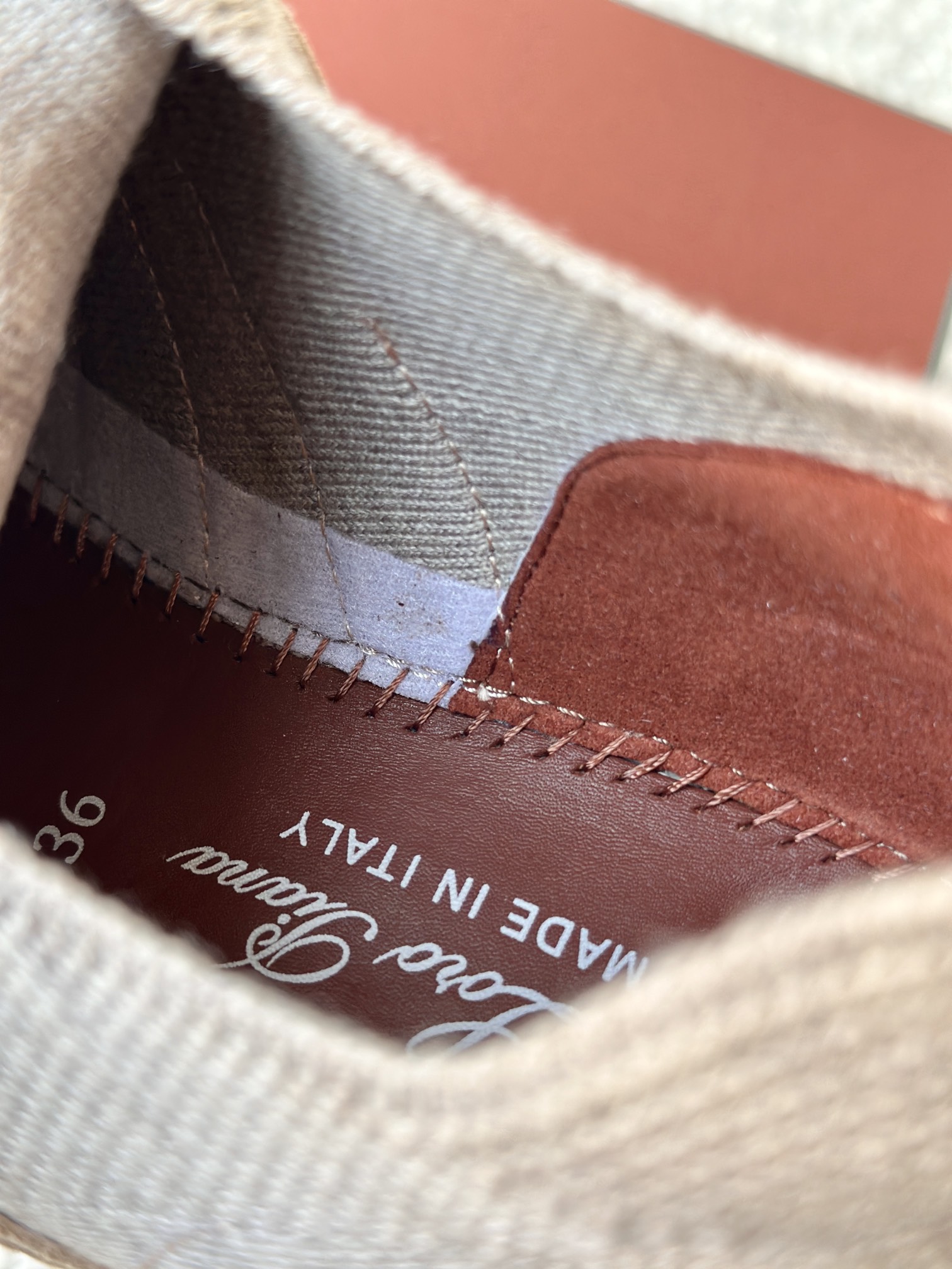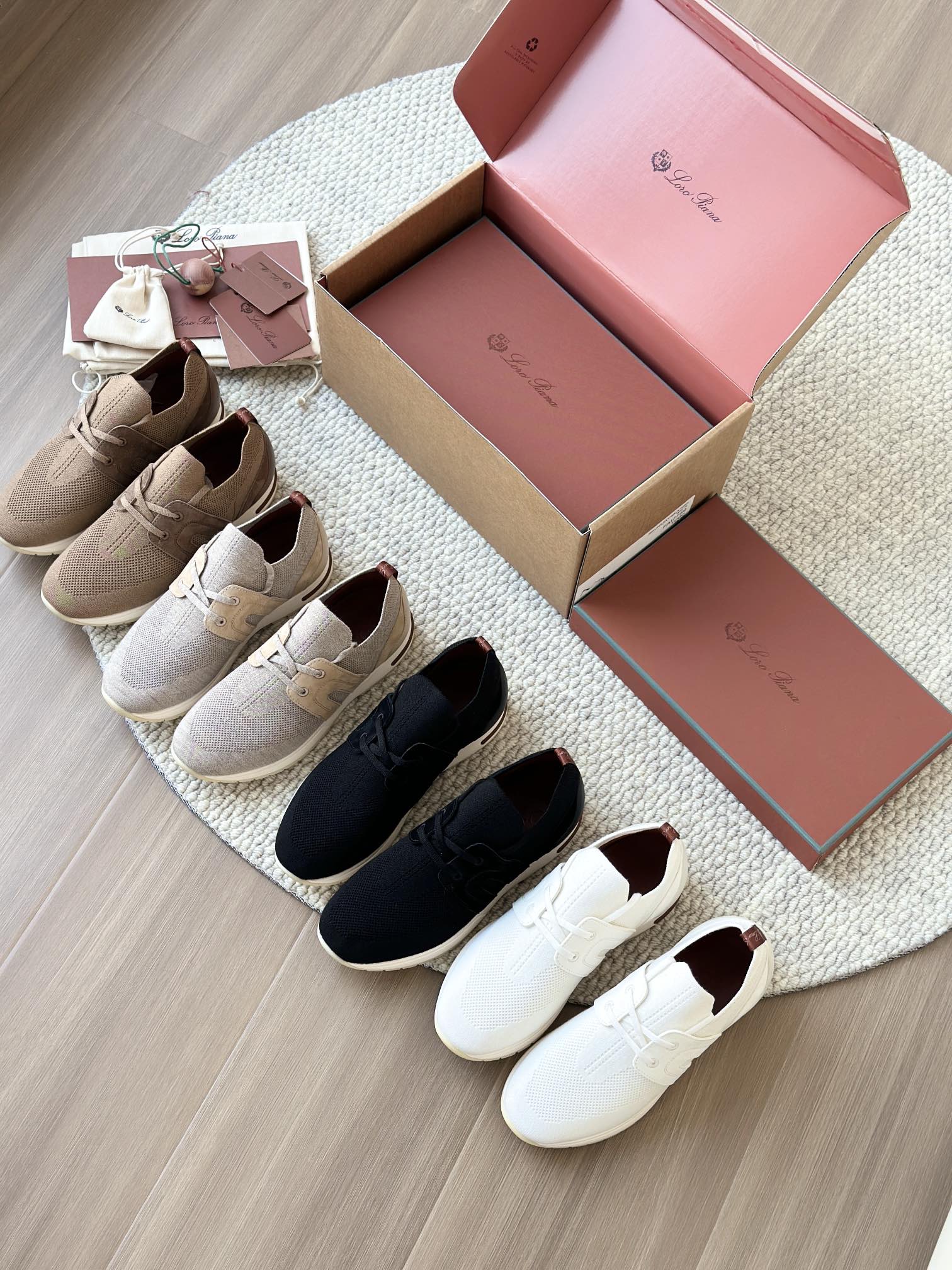 🔸鞋面像毛衣一样在织布机上制成,随后配以轻便鞋底。罗纹松紧带鞋口搭配 Kummel 色饰边 白色鞋外底,配Kummel 色鞋底,印有Loro Piana首字母缩写重复图案Kummel 色提拉环带有Loro Piana 标识