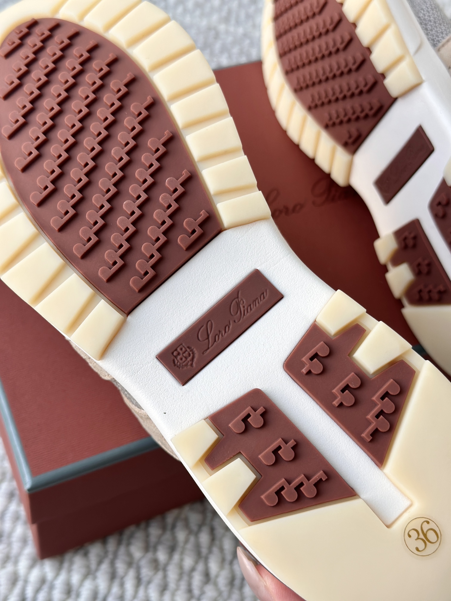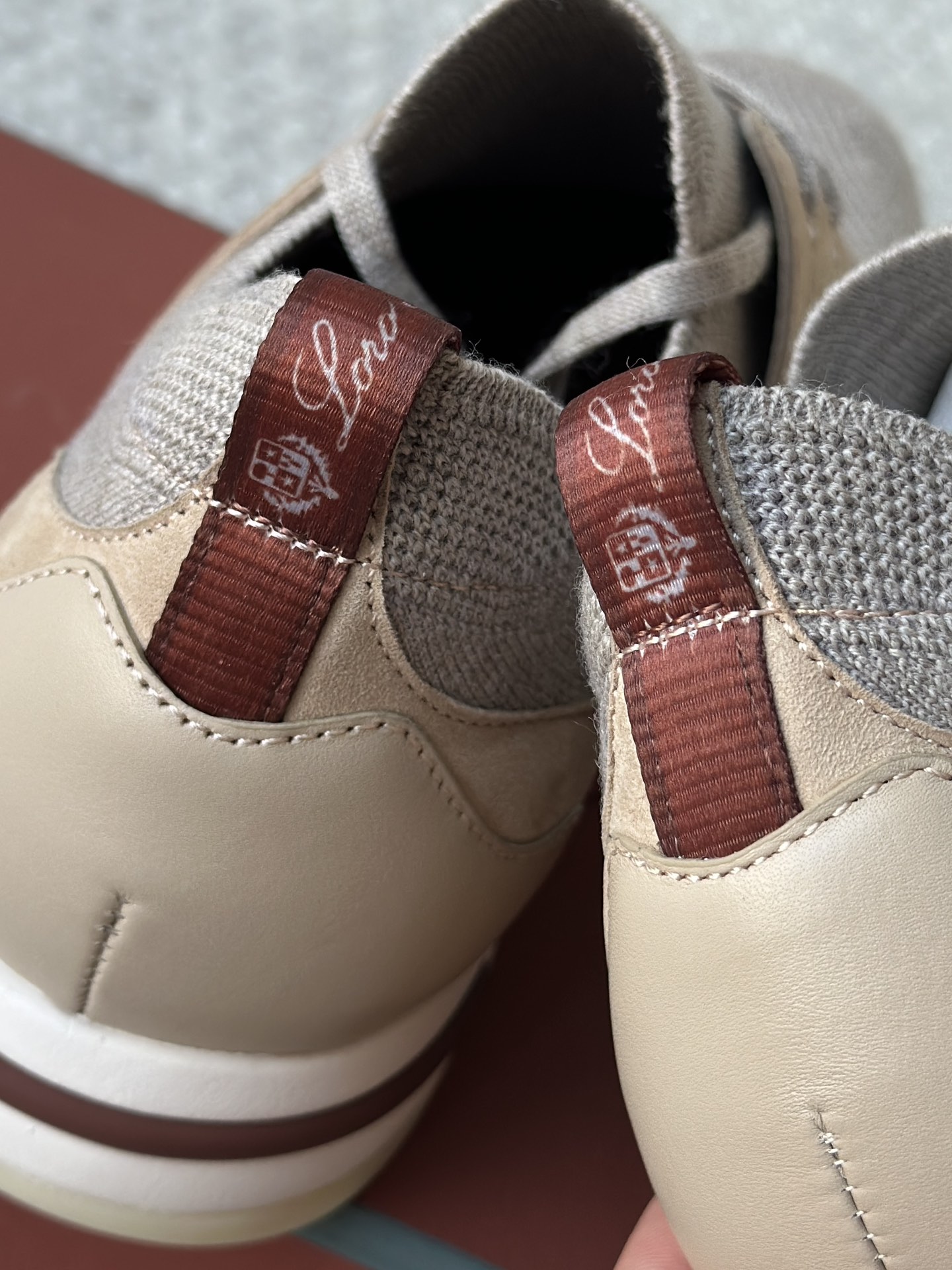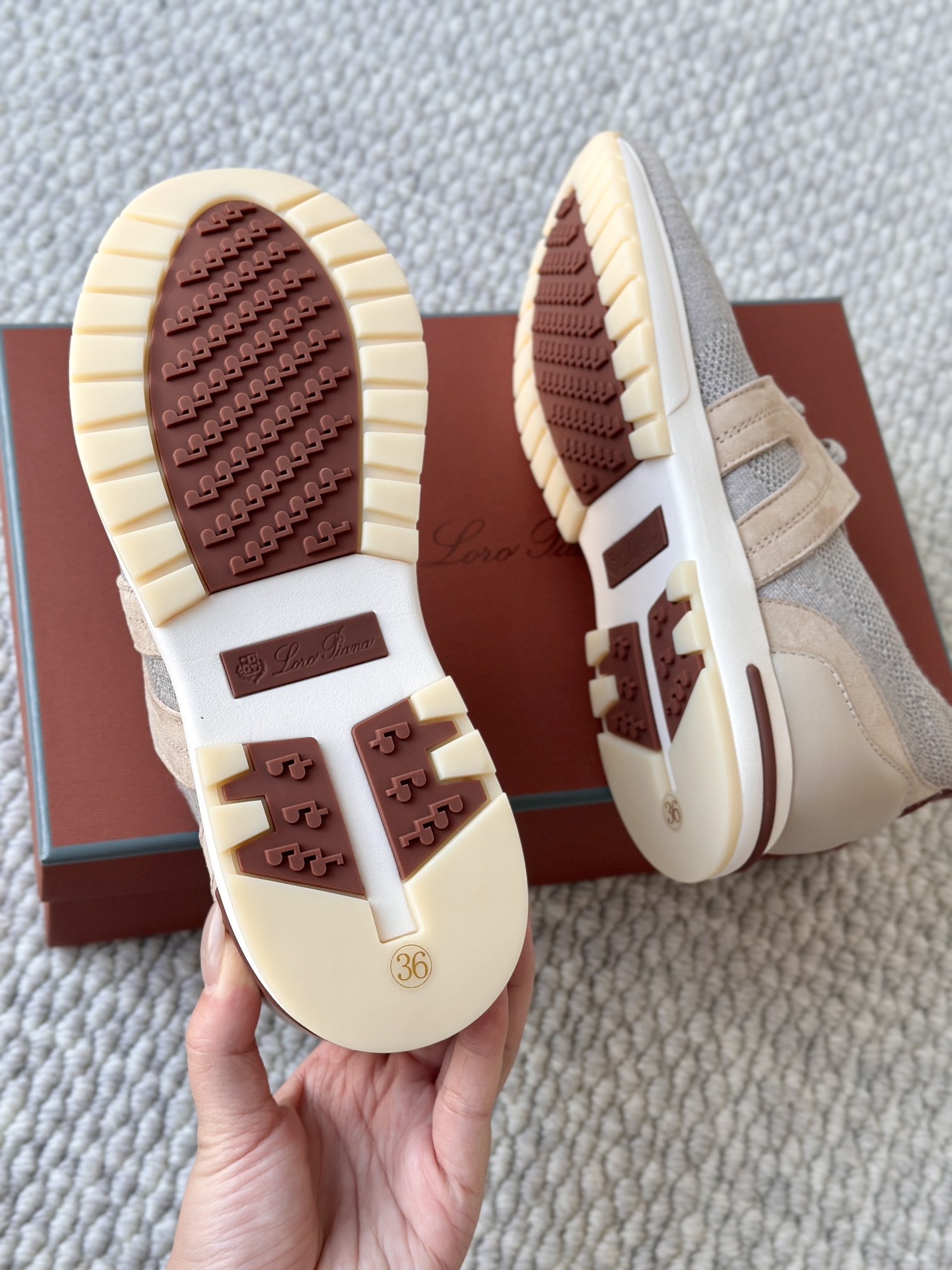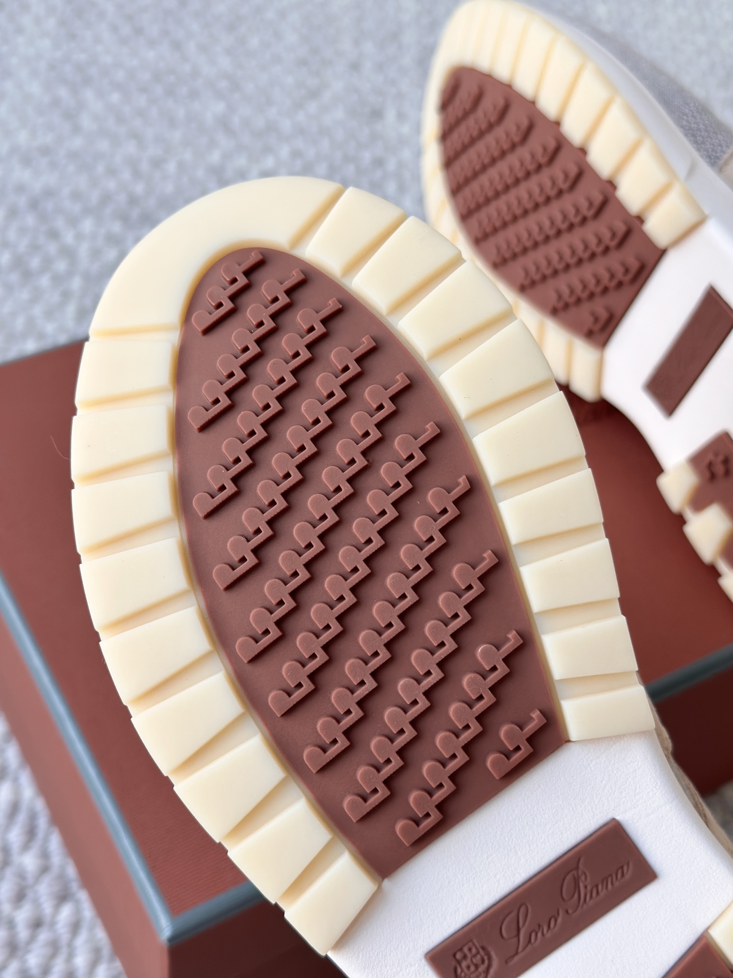 配Kummel 色鞋底,印有Loro Piana首字母缩写重复图案Kummel 色提拉环带有Loro Piana 标识