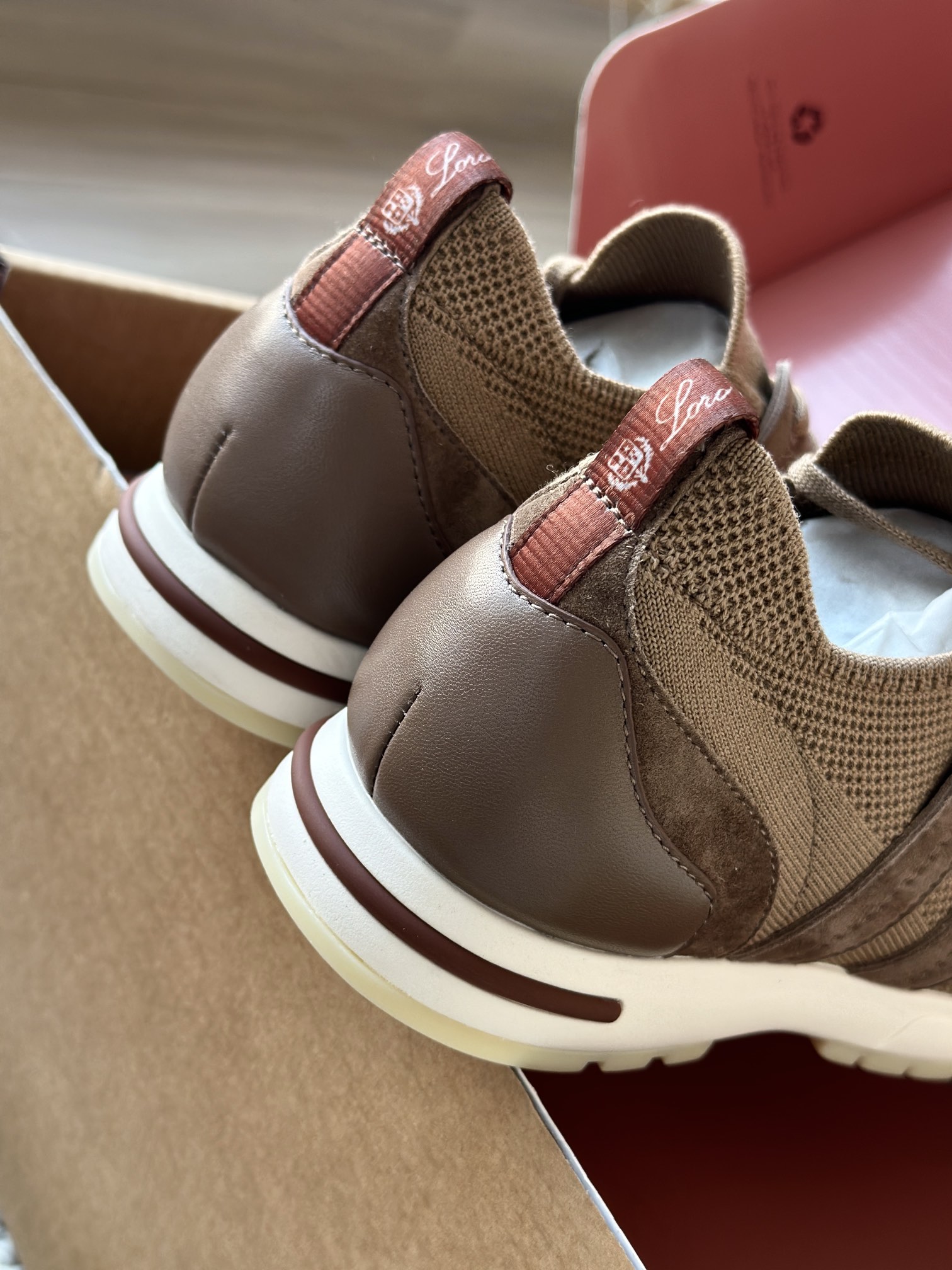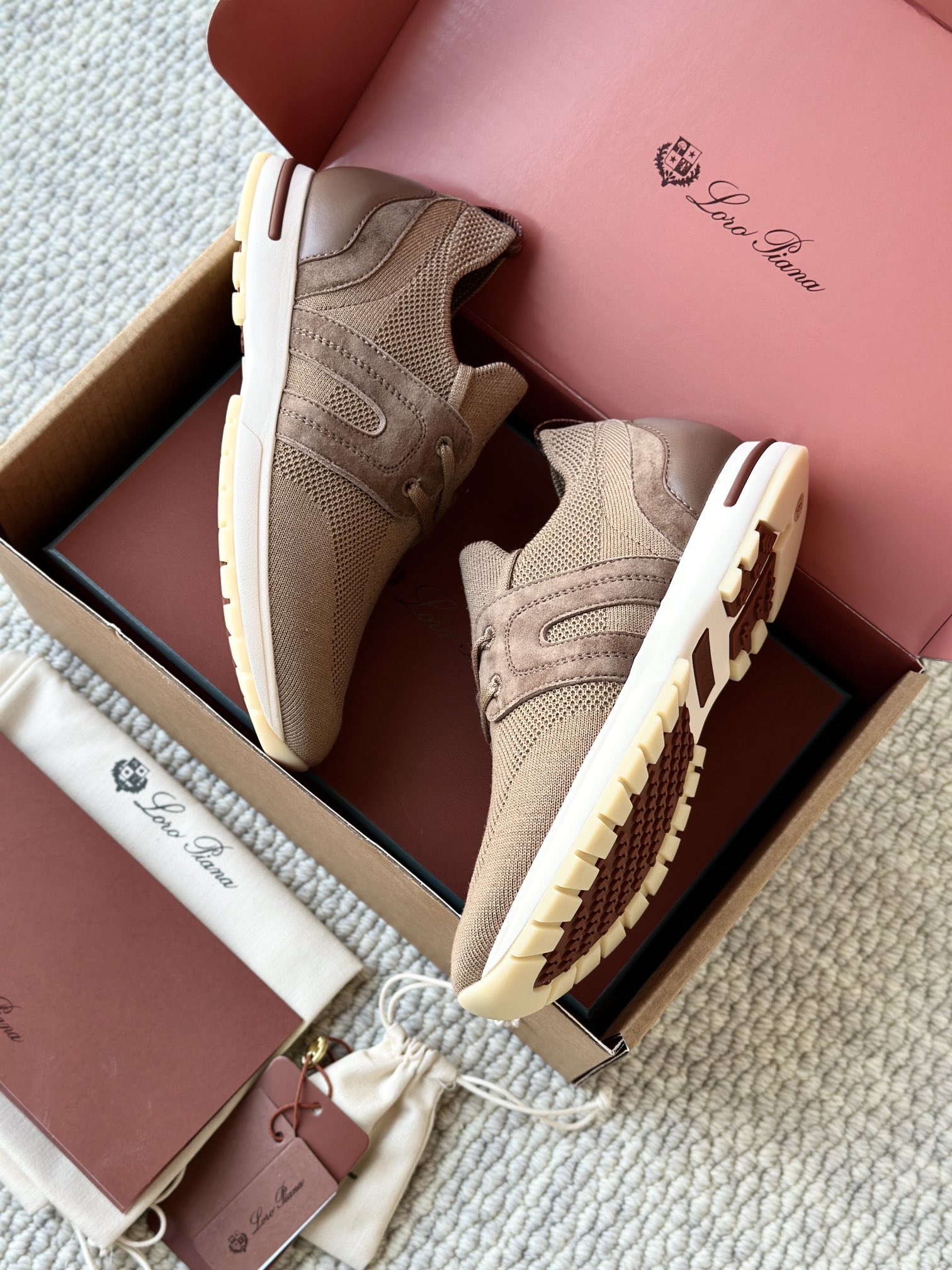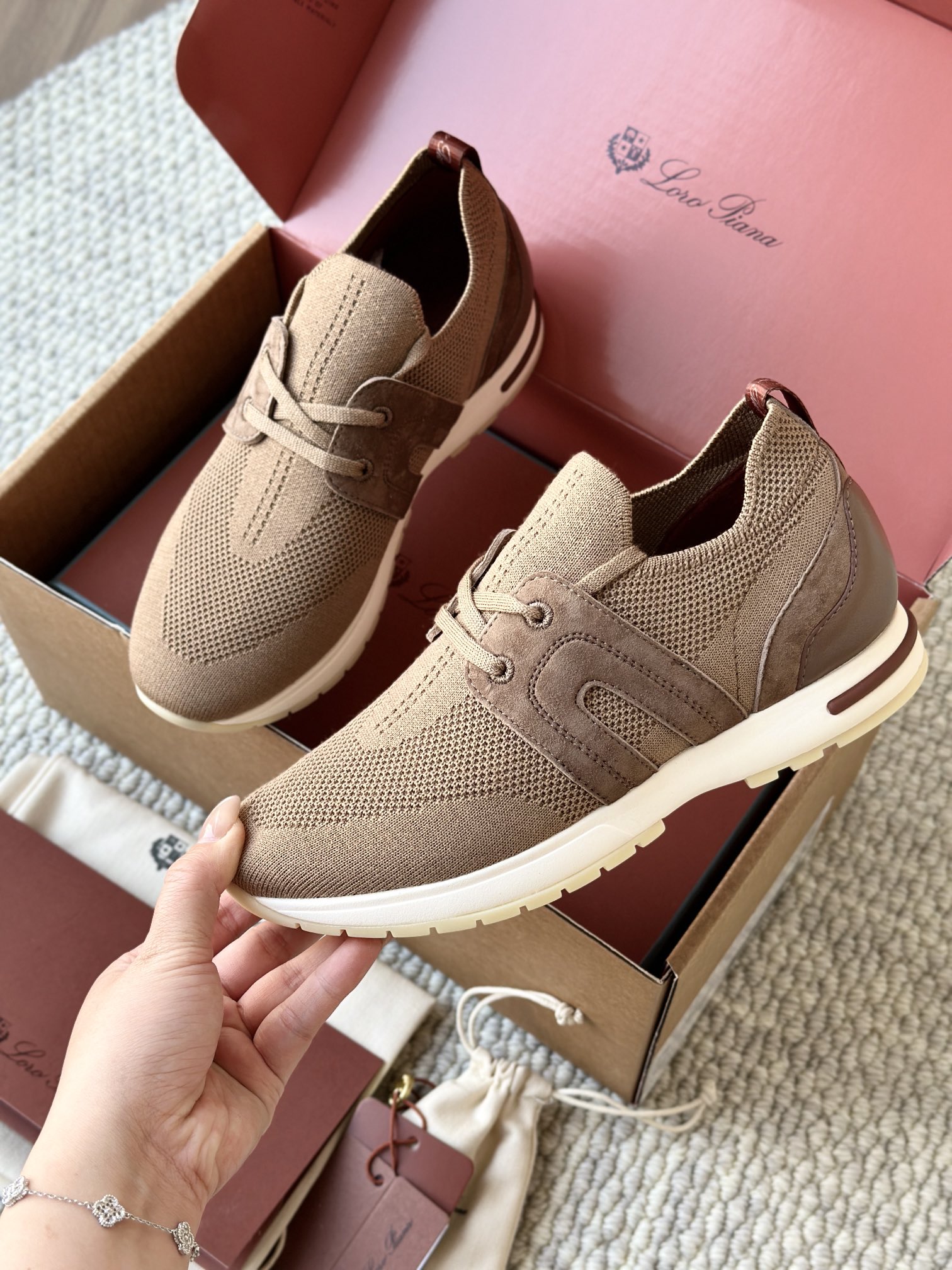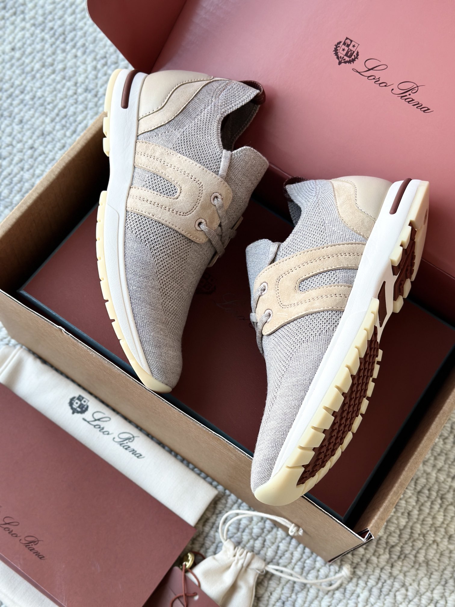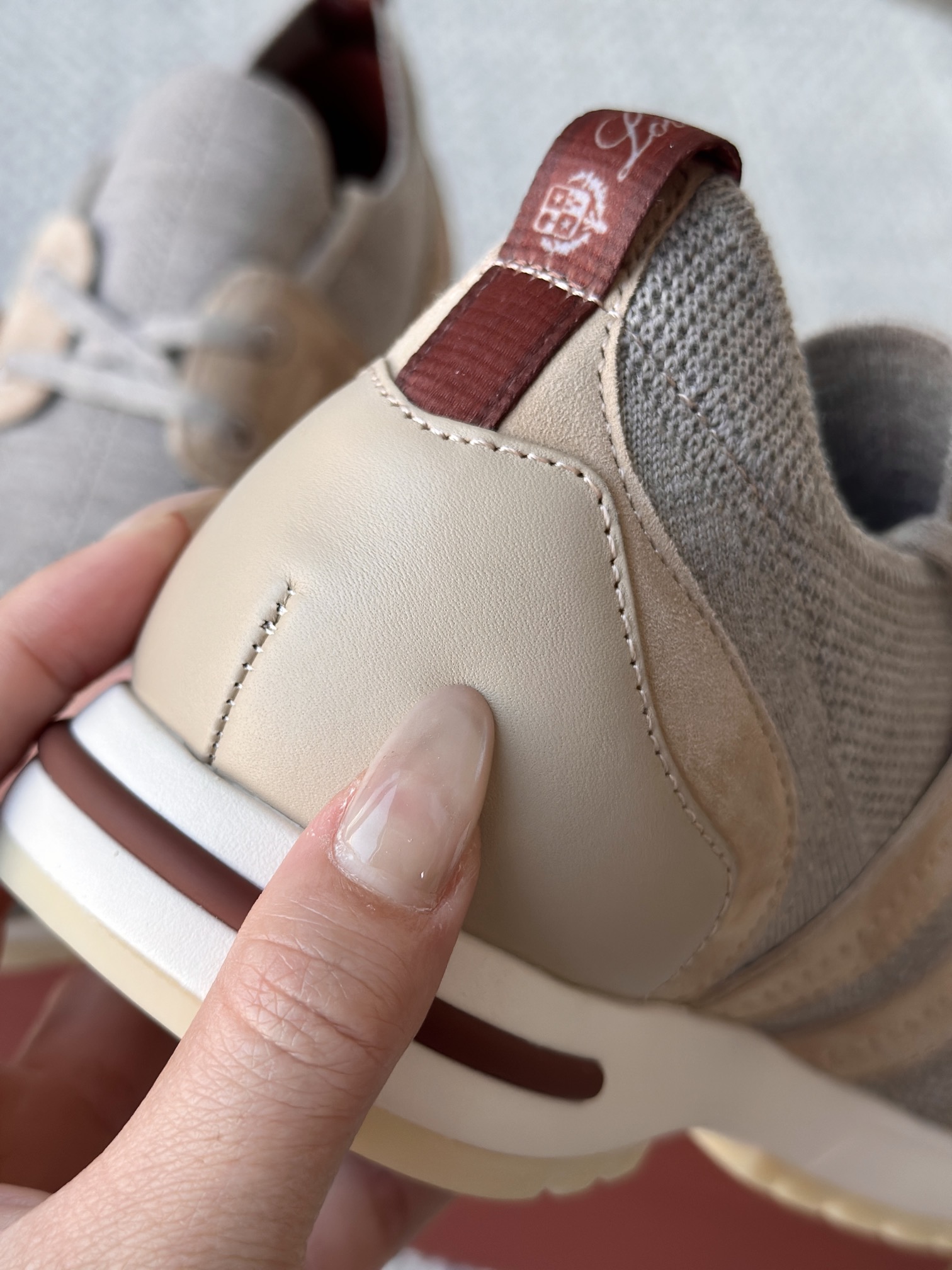 配Kummel 色鞋底,印有Loro Piana首字母缩写重复图案Kummel 色提拉环带有Loro Piana 标识
