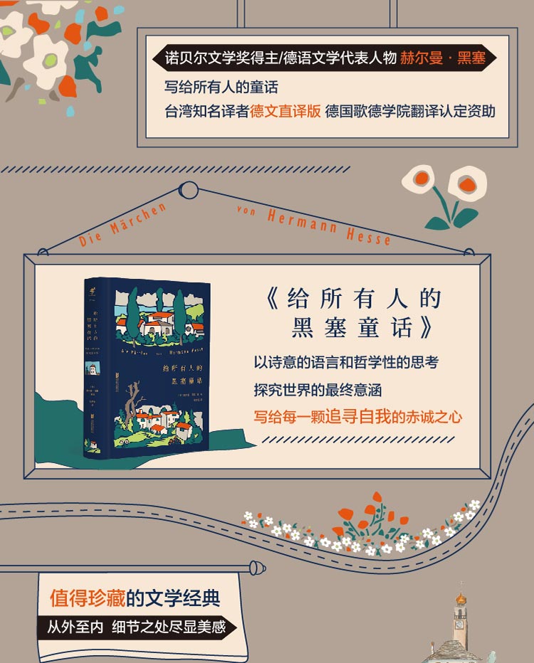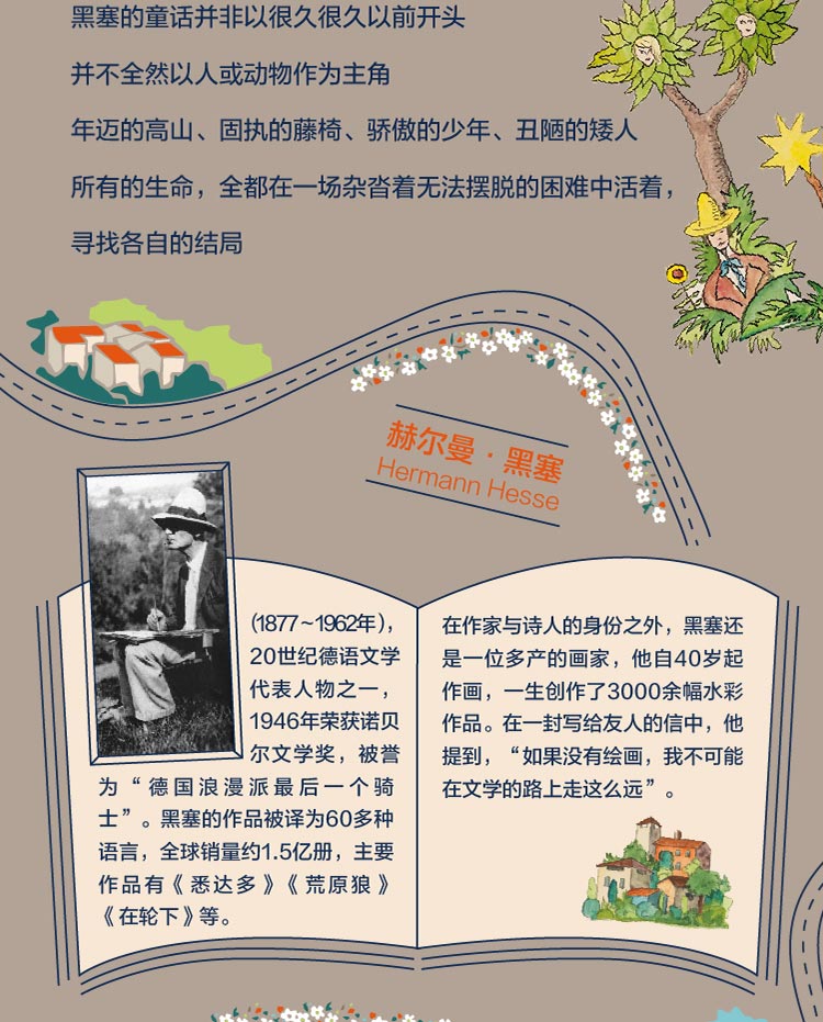★兼具诗意与哲思的艺术童话,大师级的文学作品 黑塞的文学作品中始终有探寻自我,思考世界深层规律的哲思,而诗人的文笔又赋予了这种哲学思考优美的韵律和表达,种种因素结合在一起,让一本童话呈现出了大师级文学作品的面貌。