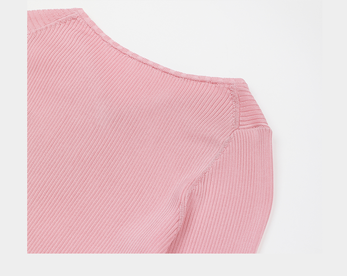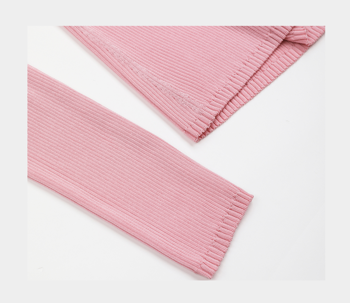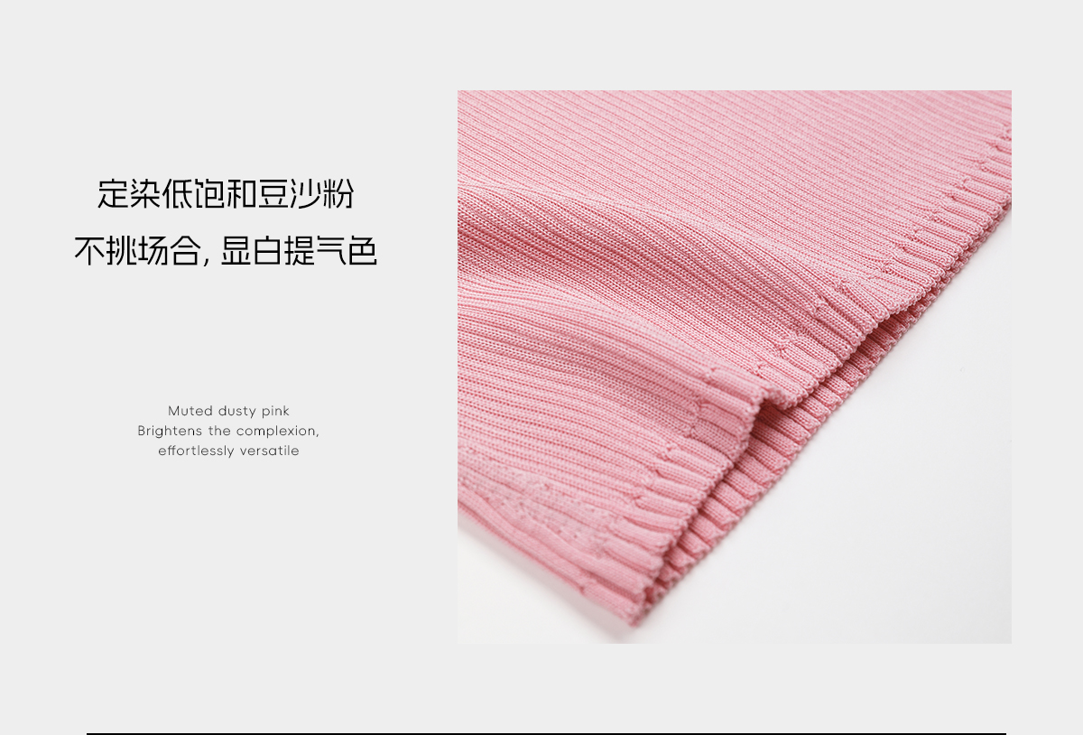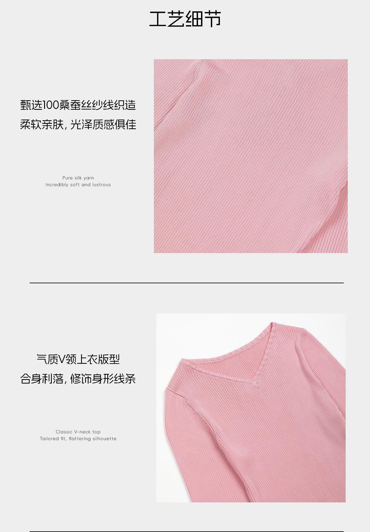 ROMI STUDIO100%桑蚕丝坑条v领粉色修身长袖针织上衣RWDSST1760
