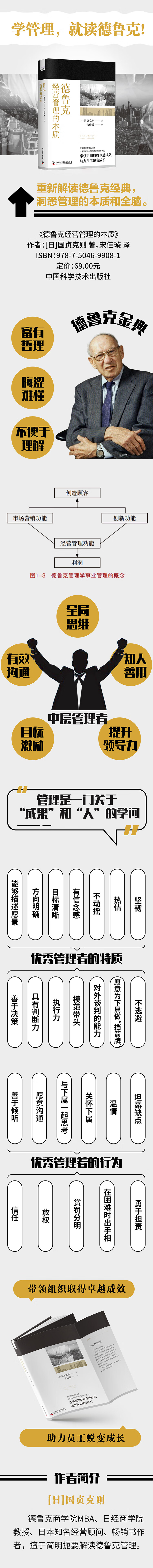 本书旨在帮助你掌握管理的全局与本质,将所学所思运用到实际工作中,从而带领组织取得卓越成果,助力员工的个人成长。 用更简单的方式来说,我希望你能从本书中获得启发,成为受人拥戴的领导。将来,下属对你的评价是:“那个人真是一位优秀的领导!虽然上班很辛苦,但我在他身边工作时感到很充实。” 围绕领导力、教练(coaching)、沟通等领域,现今已有一大批图书问世,网络上的碎片化信息也层出不穷,想必人们一定能够从中获得参考。不过,浏览这些内容,也并不代表人们就洞悉了管理的全貌。有一些面向中层管理者的图书也在陆续出版,但不同作者撰写的书,其论点也莫衷一是。比如,有的书提倡赞美员工,有的书则完全相反,从而让人无法判断什么才是管理的本质。 当被问到“管理要做什么”,你会如何回答呢?如果你无法信心十足地回答上来,这本书可以为你解答。 本书的观点主要来自德鲁克管理学。我于美国的彼得·德鲁克管理研究生院A取得了工商管理硕士学位(MBA)。在此后的十余年里,我一直从事德鲁克管理学的管理培训讲师工作,主要面向日经商学院、东京都政府的新任课长,并兼任德鲁克管理学的应用咨询顾问。从这些经历中,我可以肯定地说:“在你理解了德鲁克管理学并付诸实践后,组织与员工都会发生令人震惊的改变。” 德鲁克被誉为“管理学之父”,是历史上第一位将管理学全面系统化的人物,也是一位洞察事物本质的天才。有许多成就斐然的企业家、享有盛名的咨询顾问都会频繁引用德鲁克的名言,原因就在于其揭露了事物的本质。德鲁克对许多公司都产生了深远影响。有很多知名企业家都谈到自己借鉴了德鲁克思想,例如亚马逊公司创始人杰夫·贝佐斯(Jeff Bezos)、谷歌公司前首席执行官埃里克·施密特(Eric Schmidt)…… 进一步而言,正因为现在正处于一个巨变的时代,人们才更加需要德鲁克的指引。当下,汽车产业可谓迎来了百年未有之大变局。不仅如此,其他众多产业也面临着时代的风云变幻,随之而来的还有新冠疫情的冲击。在这种巨变的时代浪潮下,什么才是人们赖以生存的法 则?答案就是,在时代更迭中亘古不变的事物本质。如今,人们处于一个瞬息万变的时代,事物的本质极其重要。 有很多企业家和咨询顾问认为“学管理,就读德鲁克”。不过我的看法是,即便人们直接阅读德鲁克的著作,也很难理解何为管理。 德鲁克的著作往往给人一种富有哲学性、有些晦涩难懂的印象。不过,我的强项正是将复杂的领域简明易懂地解释清楚。我撰写的一本书在日本销量超80万册,荣登畅销书榜,这也归功于我对复式记账法——这个大家普遍感到头痛的领域进行了通俗易懂的讲解。在本书中,我也会用简明扼要的方式为你解说看似复杂的德鲁克管理学。 即便人们直接阅读德鲁克的著作,也很难理解何为管理,其原因之一是:德鲁克的主要作品自始至终都在阐述一个主题——统筹事业全局。例如,德鲁克的代表作《现代经营》A(钻石社)、《管理:任务、责任、实践》(钻石社)等书都是从事业目的、营销、创新等事业全局的管理谈起的。 相比之下,本书则聚焦于“管理人员与工作”,在诸如经营战略、营销、创新等事业管理方面花费的笔墨较少。 我将本书的目标读者明确定位为组织中的“中层管理者”(middle manager)。本书围绕 “管理人员与工作” 展开,从第一章开始由浅入深地进行讲解。读完本书,你便能一目了然,身为一名中层管理者应该做哪些事。 不过,本书中使用的是“管理者”,而非“中层管理者”这种说法。除企业外,本书的目标读者还包括公共机构、非营利组织(NPO)中的管理者。 本书的有效使用方法是:组织3~4名与自己处境相同的人一起阅读这本书,并在阅读完每一章后,以小组形式开展集中讨论(线上会议也可以)。然后每个人分别在工作中实践本书内容,并与大家分享自己的实践经历。 这本书以我在日经商学院讲授的管理培训内容为基础,并增加了部分内容。在管理培训中,我通常会按照3~4人小组的形式摆放桌椅,并在课上让参加者分组讨论与管理有关的各种话题。这样的集体培训有很多好处。 首先,集体培训能够让人们认识到自身的眼界狭窄。在管理下属这件事情上,有时你听了其他人的意见后,就会意识到,原来自己一直局限在多么狭隘的思维或价值观当中。 其次,对于我在培训中所讲的内容,由于每个人的思维方式、价值观和身处的环境不同,顿悟之处会因人而异。当遇到与自己不同的新的观点时,人们往往会从中受到启发。正如当人们听到别人的意见时,常常会发现别人的关注点正是自己的盲点。 再次,许多管理者都会有一些烦恼,比如对绩效感到压力,苦恼于下属不按照自己的想法行动,或担心下属怎样看待自己。通过参加培训,你会发现自己不是孤身一人,其他人也有着相同的压力或烦恼,从而卸下心头的重担。 不管是在同一家公司任职同一岗位的同事也好,在其他公司与自己有着相同处境的旧交也好,我衷心希望大家可以创建3~4人小组,共同阅读,一起探讨这本书中的内容。如果本书能够成为你们的“共同体验”,比如小酌时的幽默段子,那就再好不过了。 事实上,3~4人的人数规定也是值得注意的。德鲁克曾说:“管理(management)的‘管理幅度’最多为6~8人……团队则应以5~6人为上限。通常情况下,3~4人最好运作。” 