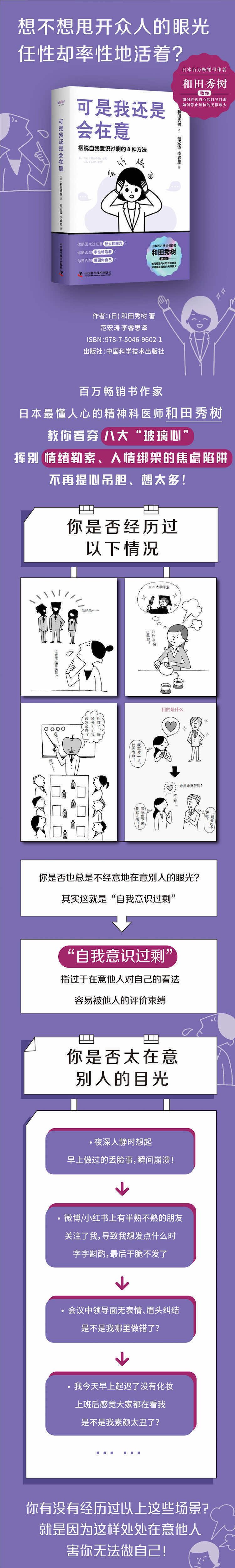 日本懂人心的精神科医师和田秀树,教你看穿八大“玻璃心”,挥别情绪勒索、人情绑架的焦虑陷阱,不再提心吊胆、想太多! ·夜深人静时想起早上做过的丢脸事,崩溃! ·微博/小红书上有半熟不熟的朋友关注了我,导致我想发点什么时字字斟酌,后干脆不发了。 ·会议中领导面无表情、眉头纠结,是不是我哪里做错了? ·我今天早上起迟了没有化妆,上班后感觉大家都在看我,是不是我素颜太丑了? 你有没有经历过以上这些场景?就是因为这样处处在意他人,害你无法“做自己”! 事实上,很多时候别人根本没有你想的那么在乎你,是你内心的情绪陷阱诱导你想象他人在什么角度审视自己。于是,你不敢说出真心话,变得压抑委屈,累积成难以承受的精神压力。 日本懂人心的精神科医师和田秀树指出,这种过度在意他人目光的坏习惯,就叫作“自我意识过剩”,除了使人无法自在与重要的人相处、耗费无谓的社交能量、养成玻璃心,终甚至会害你惯性忽视自己真正的感受与想法。只要能破解这些焦虑和罪恶感的假象,纠结的情绪自然就能得到缓解,你也会知道如何真正随心、自在地面对自己和别人,不再让他人的想法阻碍你的抉择与期待。