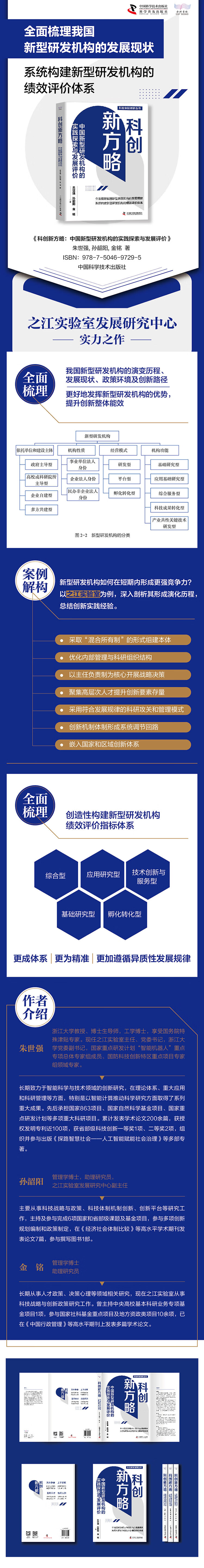 朱世强 浙江大学教授、博士生导师,工学博士,享受国务院特殊津贴专家。现任之江实验室主任、党委书记,浙江大学党委副书记,国家重点研发计划“智能机器人”重点专项总体专家组成员,国防科技创新特区重点项目专家组领域专家。 长期致力于智能科学与技术领域的创新研究,在理论体系、重大应用和科研管理等方面,特别是以智能计算推动科学研究方面取得了系列重大成果。先后承担国家863项目、国家自然科学基金项目、国家重点研发计划等多项重大科研项目。累计发表学术论文200余篇,获授权发明专利近100项,获省部级科技创新一等奖1项、二等奖2项,组织并参与出版《探路智慧社会——人工智能赋能社会治理》等多部专著。 孙韶阳 管理学博士,助理研究员,之江实验室发展研究中心副主任。 主要从事科技战略与政策、科技体制机制创新、创新平台等研究工作,主持及参与完成6项国家和省部级课题及基金项目,参与多项创新规划编制和政策制定,在《经济社会体制比较》等高水平学术期刊发表论文7篇,参与撰写书籍1部。 金铭 管理学博士,助理研究员。 长期从事人才政策、决策心理等领域相关研究,现在之江实验室从事科技战略与创新政策研究工作。曾主持中央高校基本科研业务专项基金项目1项,参与国家社科基金重点项目及地方资政类项目10余项,已在《中国行政管理》等高水平期刊上发表多篇学术论文。
