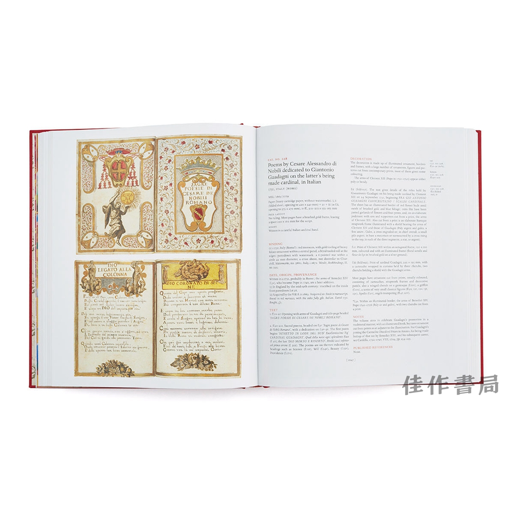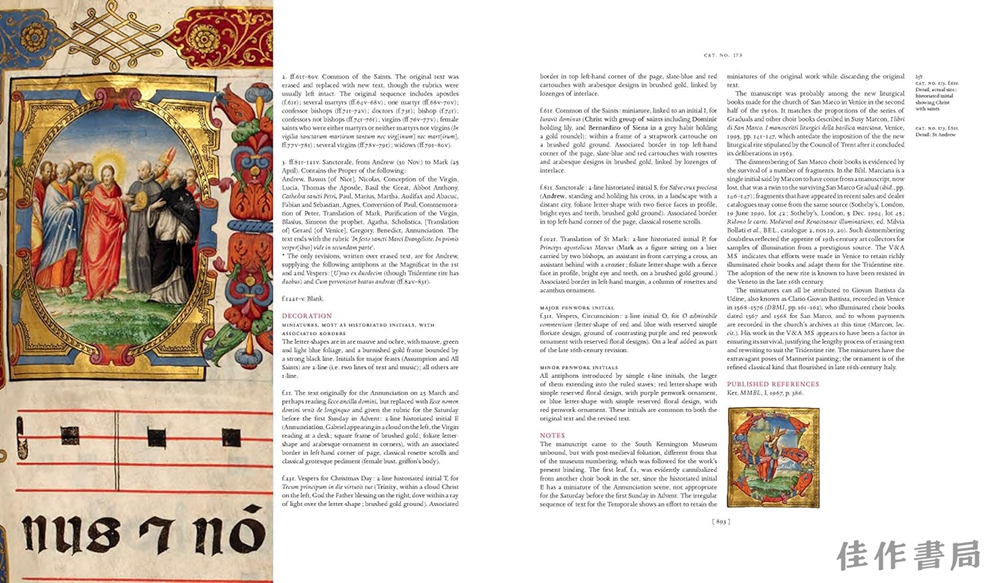 全书分为三卷,首次汇集了诸如1350年的《圣德尼弥撒书》、1844年的《尚博尔弥撒书》、1463–64年的《桑维托〈彼特拉克文集〉》,以及1870年的《威廉·莫里斯诗集》等重要作品。每件藏品的目录说明均有详尽的论述,特别重视探讨这些作品在不同世纪中被评价与使用的多样方式及其变化。
