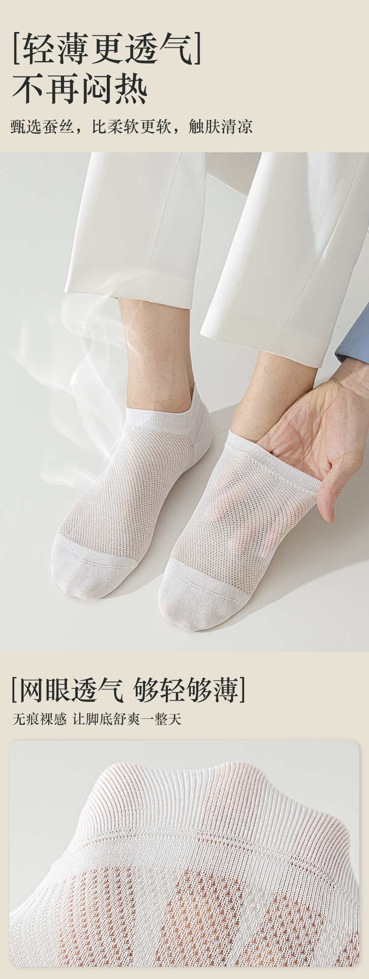 【蚕丝袜!59抢6对!🔥】男士必备桑蚕丝船袜,薄如蝉翼❄透气速干不惧汗!宛如第二层肌肤,舒适防磨脚💨快来体验贴身“小空调”🍃桑蚕丝袜子 男士夏季薄款短袜网眼透气凉感隐形船袜 防臭无骨休闲袜