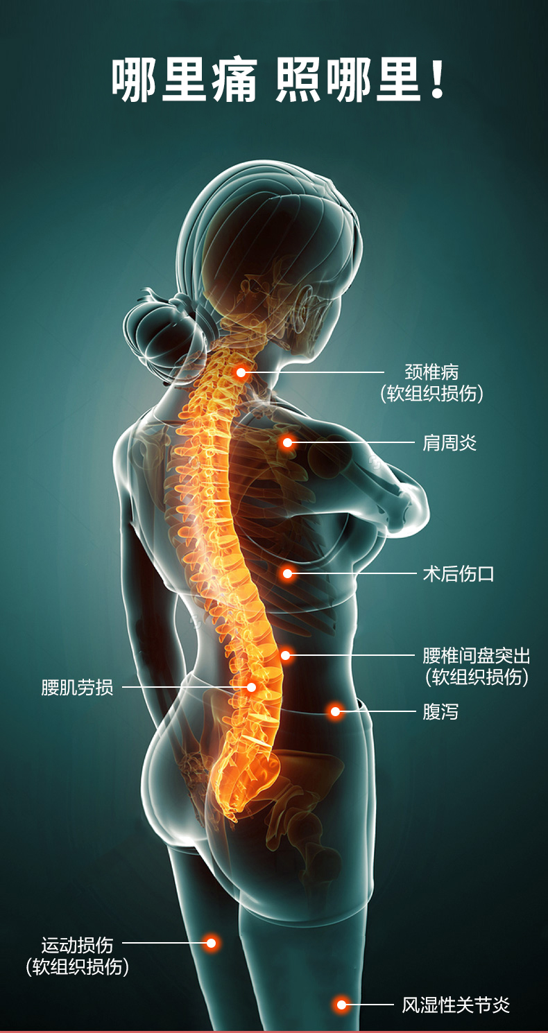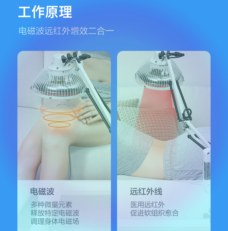 治疗原理:特定电磁波搭配微量元素板调理身体磁场,中远红外线(肉眼不可见,非灯发出红光)促进软组织愈合。