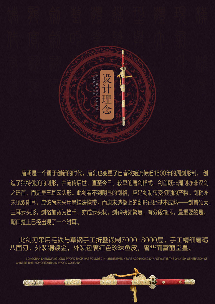 相传春秋末期,越国铸剑师欧冶子在龙泉秦溪山铸成龙渊、泰阿、工布三把名剑。并以龙渊为乡名。后因避唐高祖李渊讳,改称龙泉。唐乾元二年设龙泉县。从此,龙泉就成为剑的宝名,誉满天下。沈广隆剑铺位于浙江省龙泉市