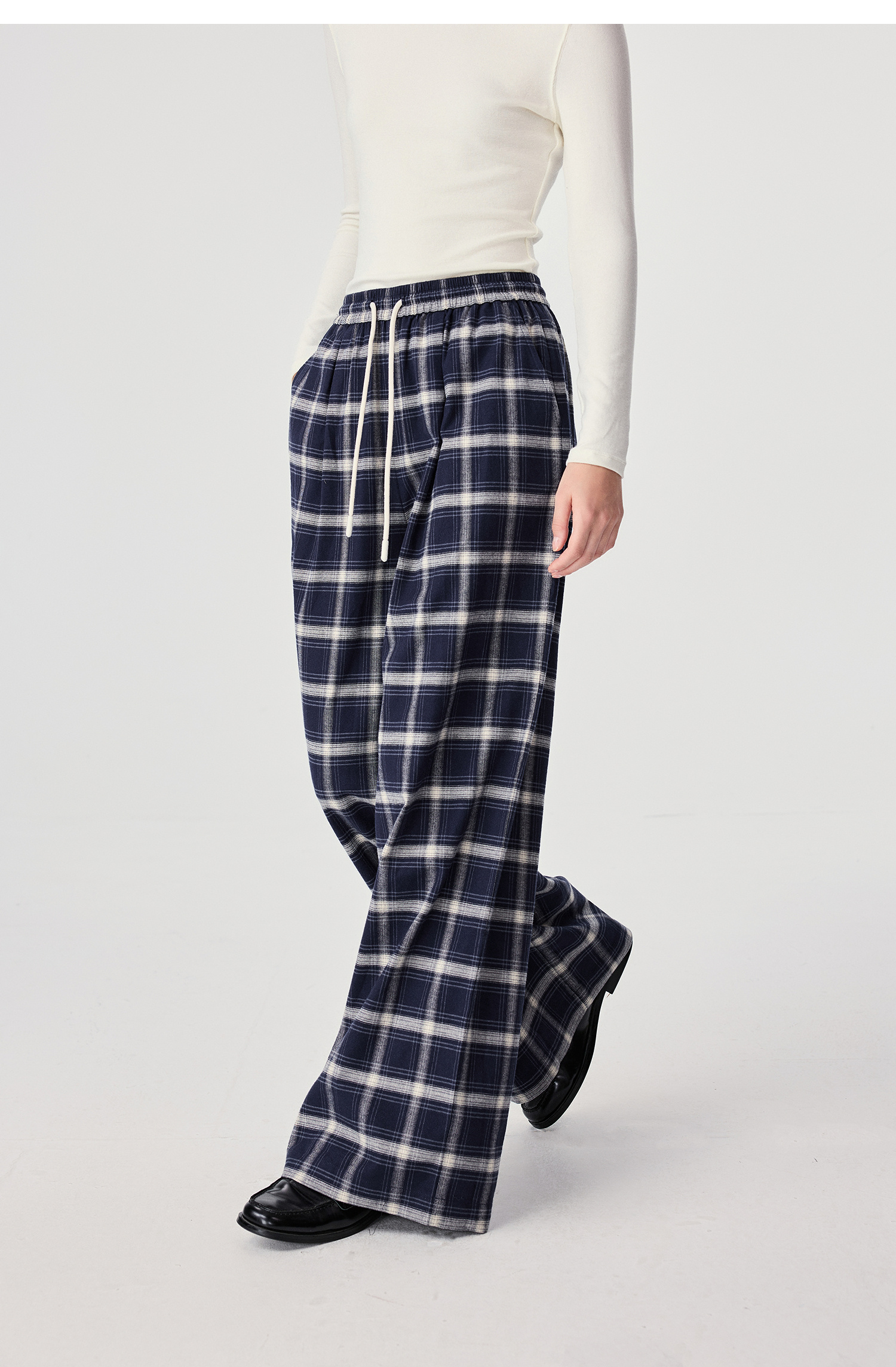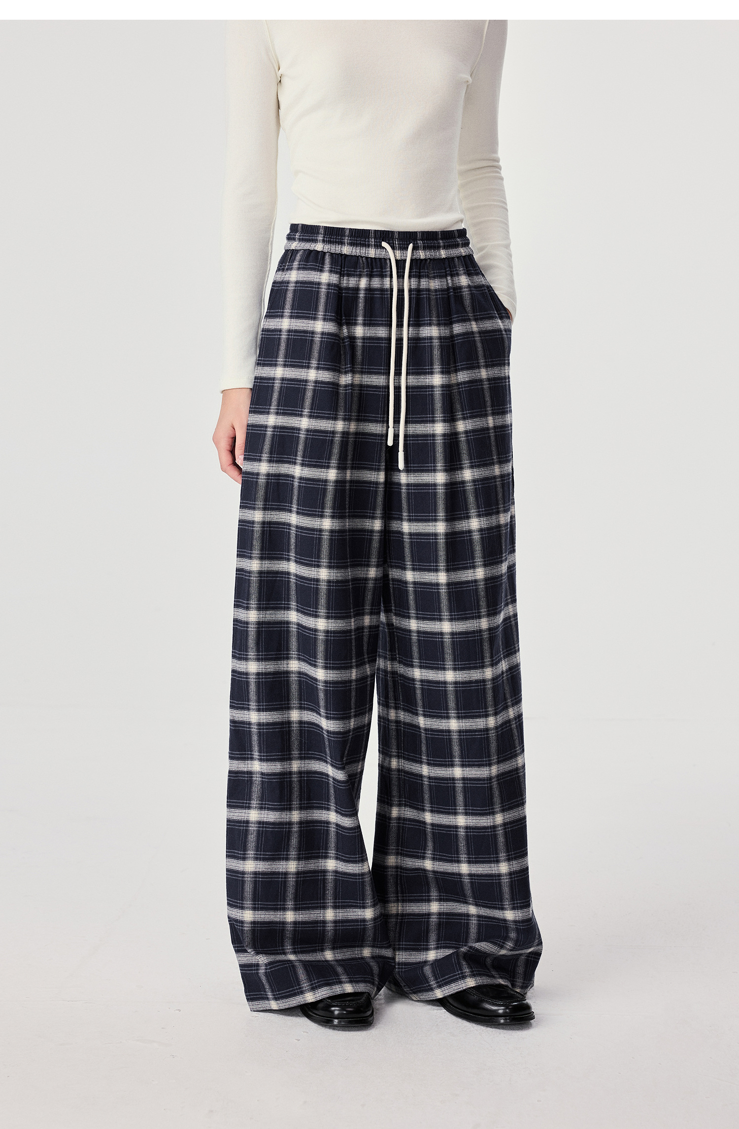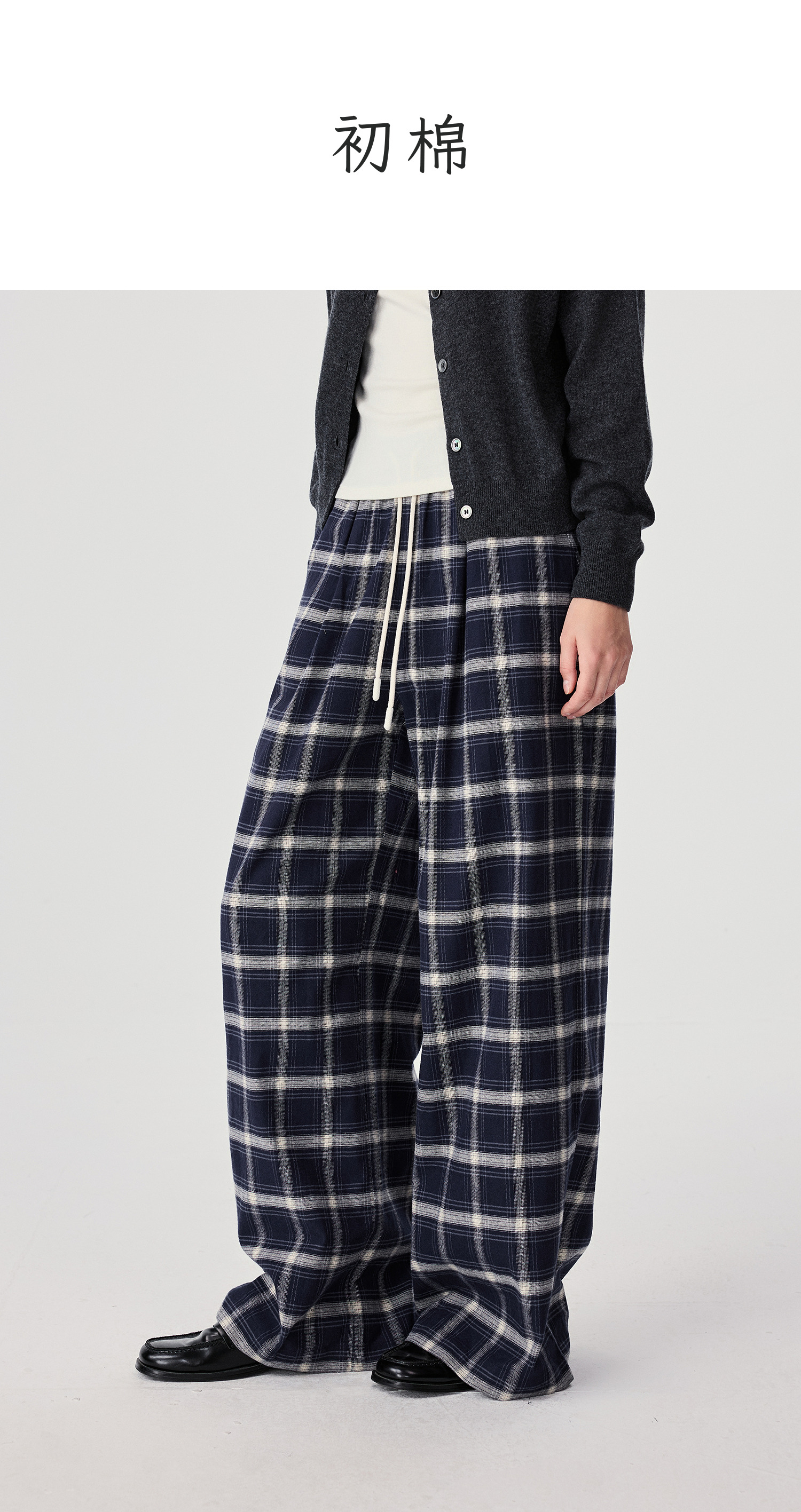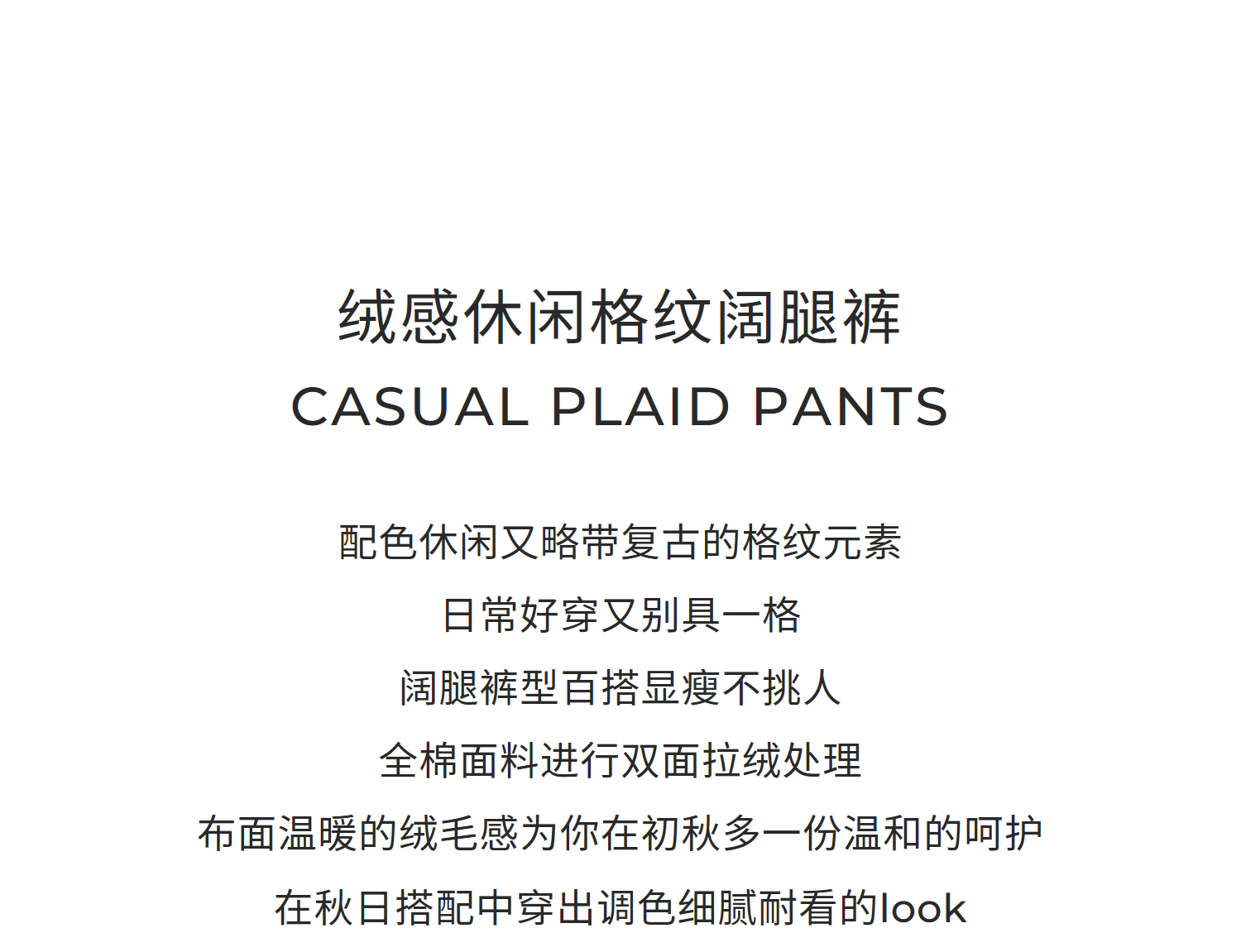 棉仓366618018-25秋绒感休闲格纹抽绳腰阔腿裤