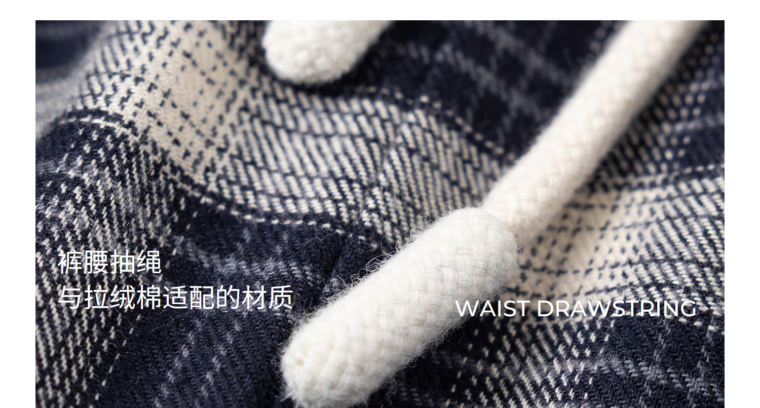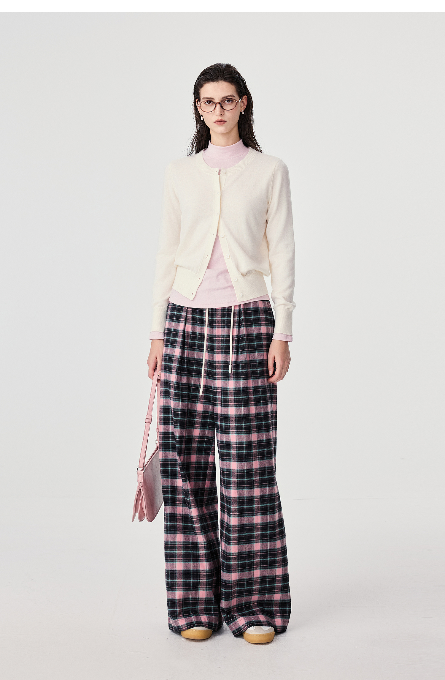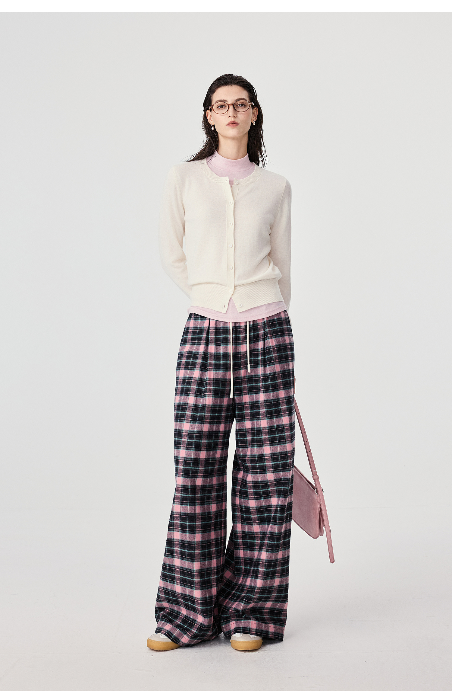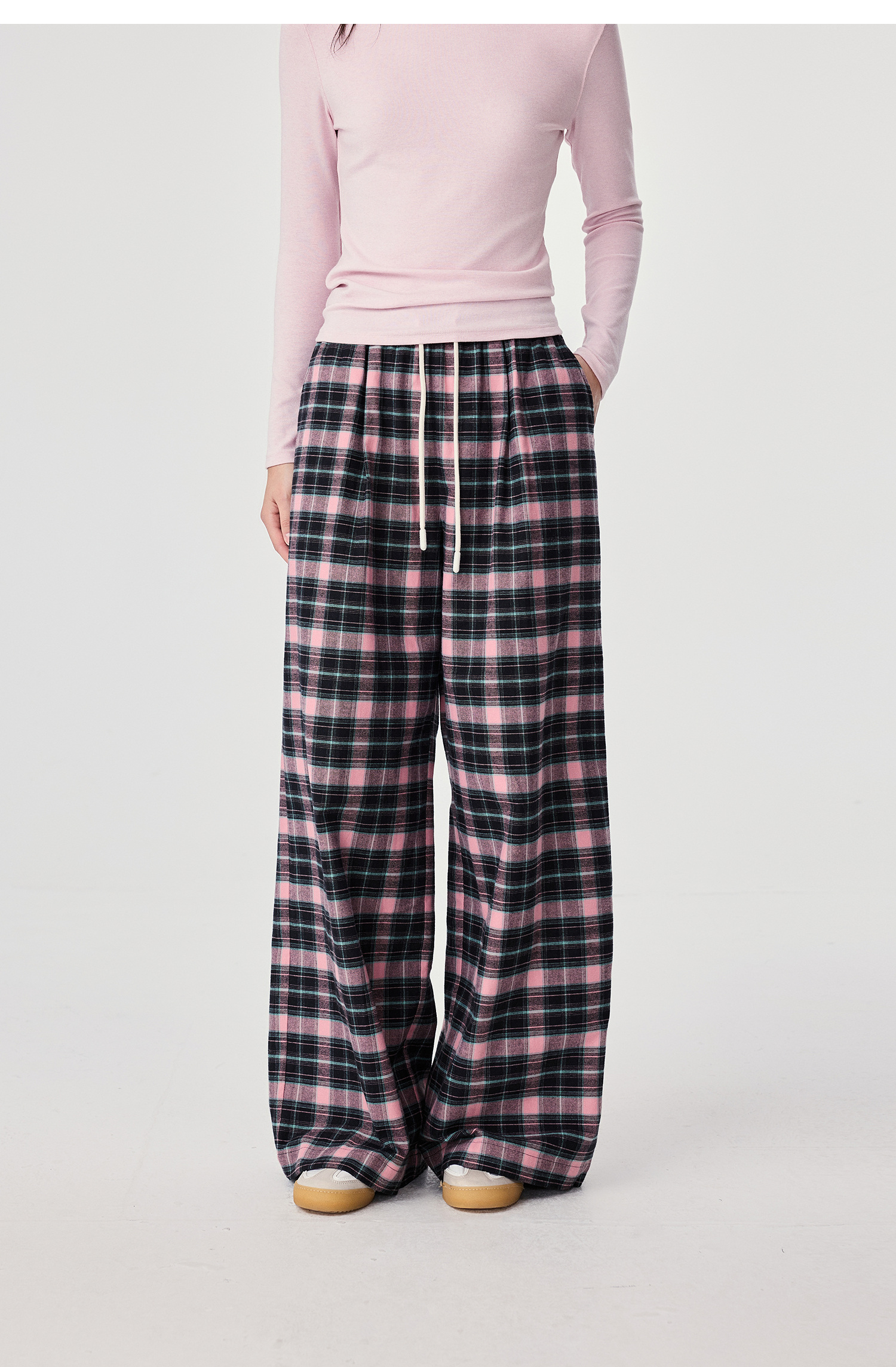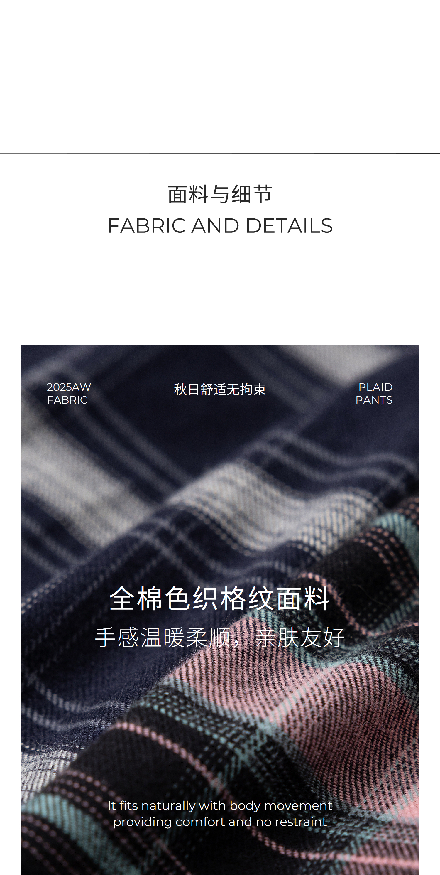 棉仓366618018-25秋绒感休闲格纹抽绳腰阔腿裤